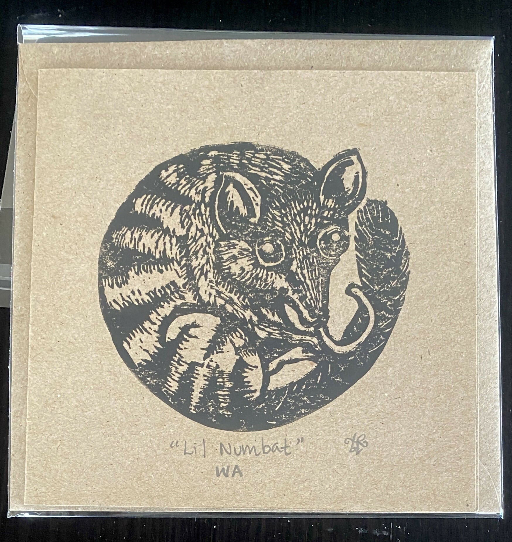 Original designs carved, printed by hand with care on 100% recycled cardstock.