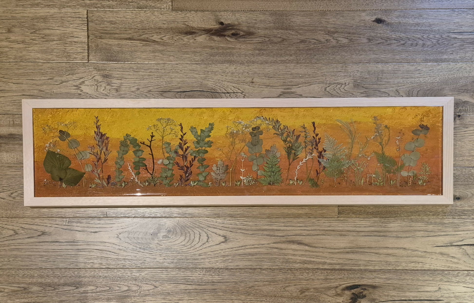 Natural pressed flowers preserved in resin over acrylic paint. 30cm x 120cm plus frame.