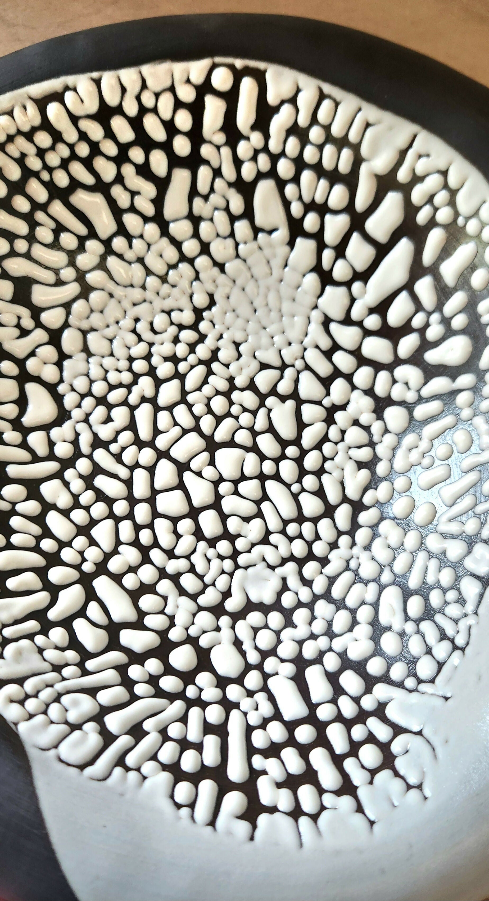 This serving bowl has been hand-built using a wonderfully smooth, velvety black clay. The beaded white glossy glaze poured around inside it, contrasts and really pops against the black clay color. The bowl is food safe and high fired in a gas burner kiln.