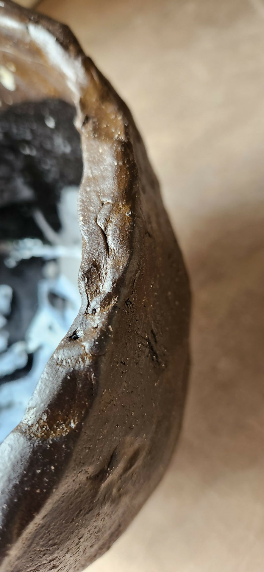 This is a sculptural functional bowl made with a delicious chocolatey black clay, high fired in a gas burner kiln. It has been hand-built and features the raw organic clay surface on the outside. The inside has been painted with a white slip and glazed for easy cleaning. It is food safe.