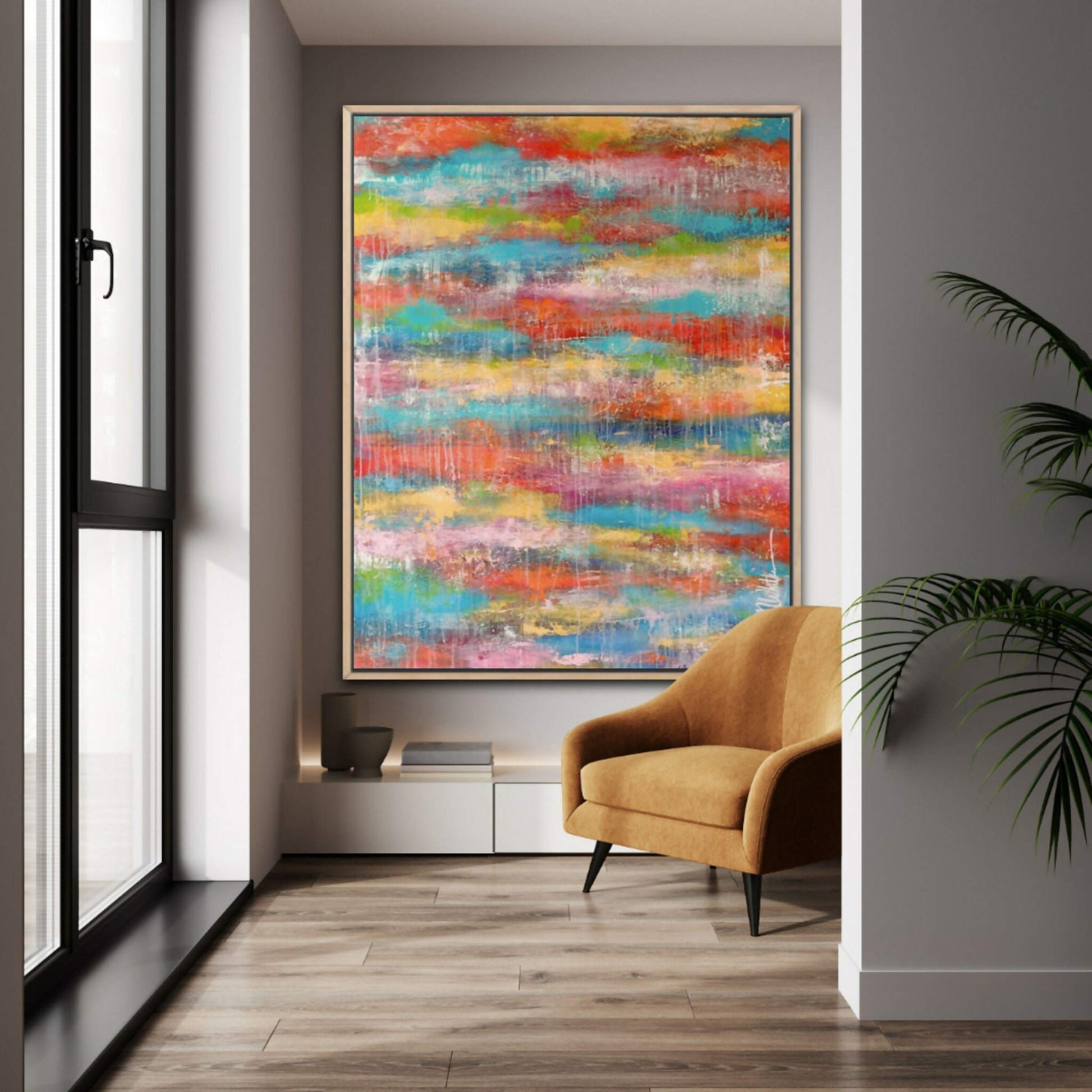 122cm x 152cm, mixed media on canvas, framed in natural American oak.