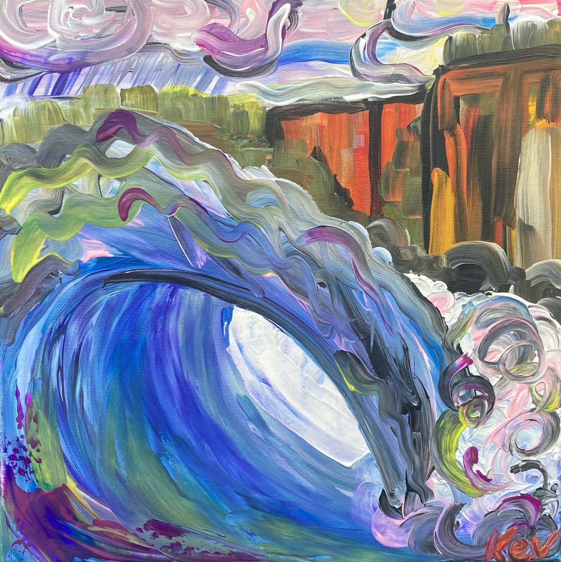 A colourful right-hand barreling wave set against orange cliffs and a turbulent sky. Secret location in West Coast VIC.