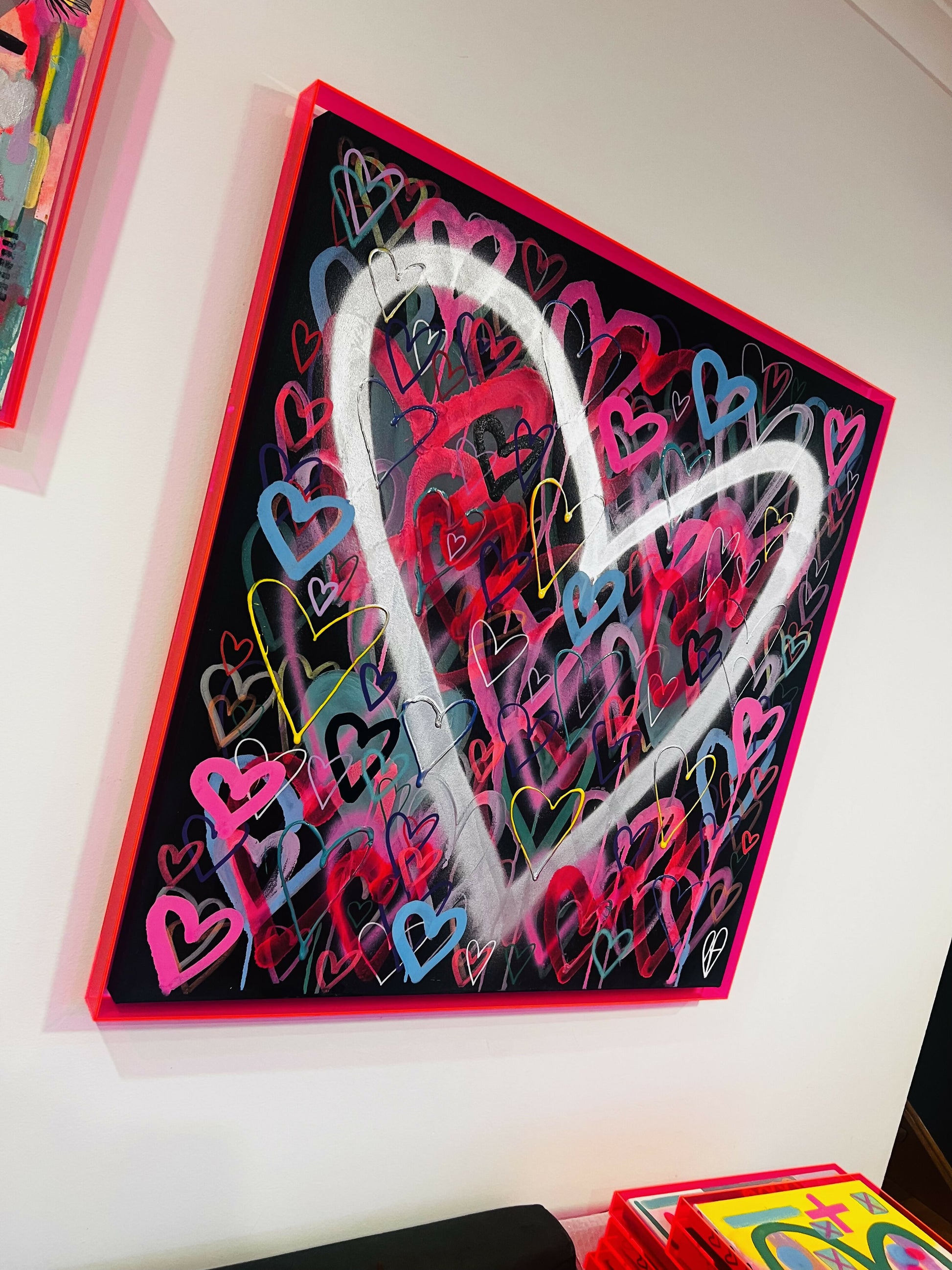 Community Hearts is a celebration of connection, unity, and the strength found in community. Multi-colourful hearts, dynamically layered upon one another, reflect the diversity and vibrancy of members of a community – each entirely unique, yet together creating a whole. As is often the case in my works, radiant pinks feature heavily in Community Hearts representing compassion, emotional healing, and nurturing energy intended to speak directly to the heart, promoting feelings of care, warmth, and acceptance — both of self and others.