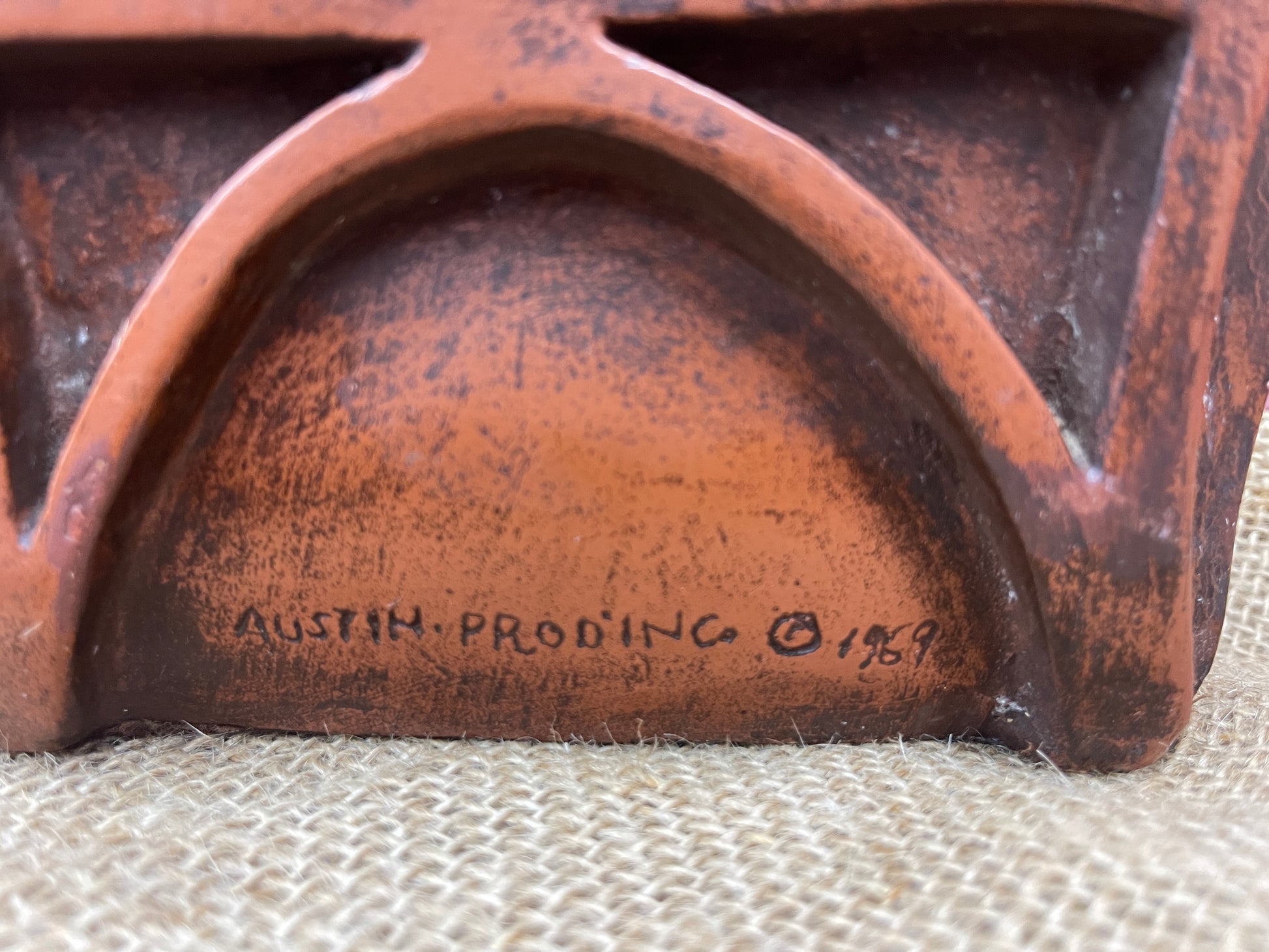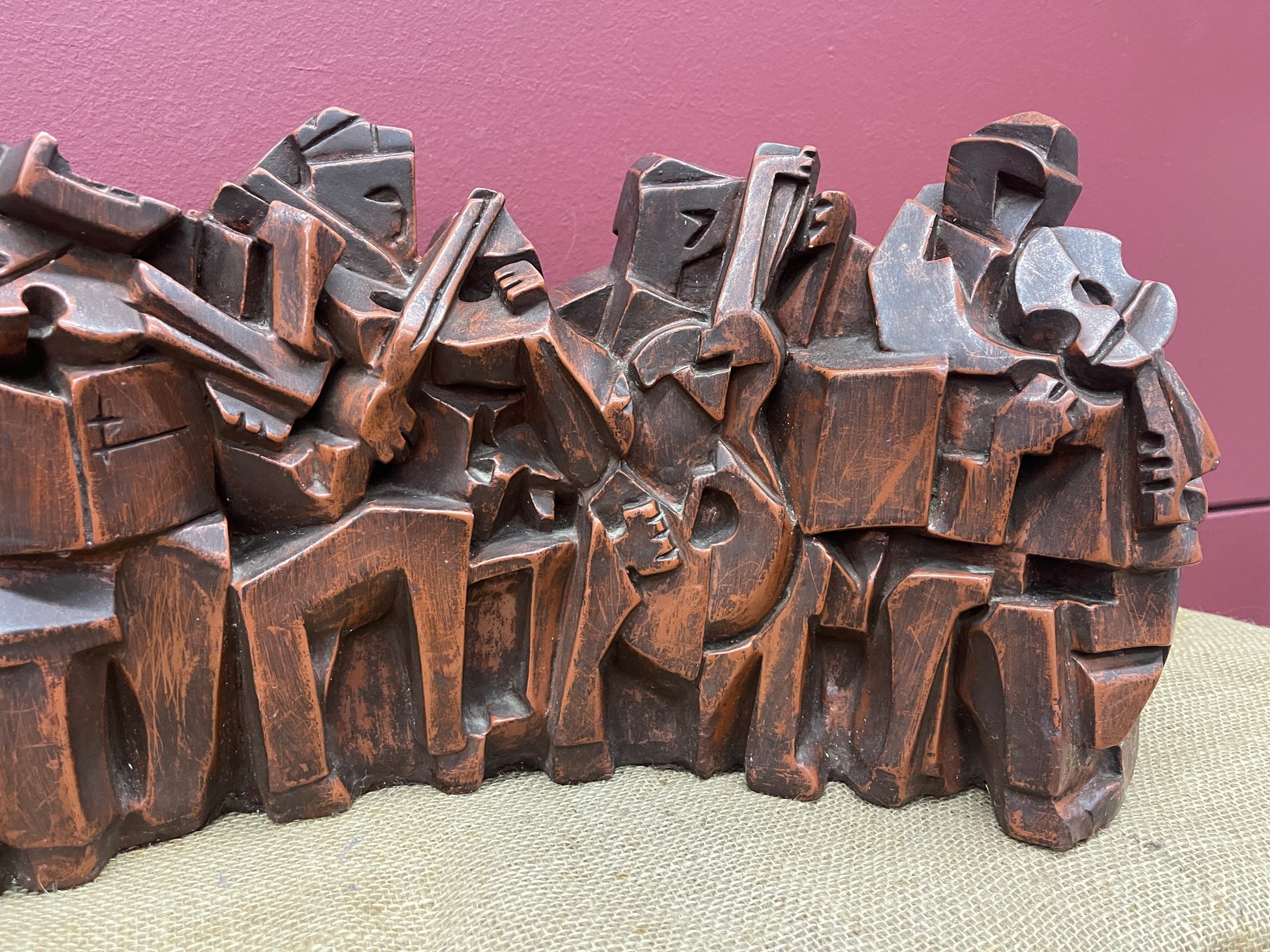 Description: This highly collectable, vintage Austin Products Inc. cubist-style sculpture of a musical quintet, would be an exceptional addition to the decor of any musician or music enthusiast's home, office or studio. The sculpture features a brown/red finish and cubist-style geometric designs for the musicians and instruments, molded from Durastone.
