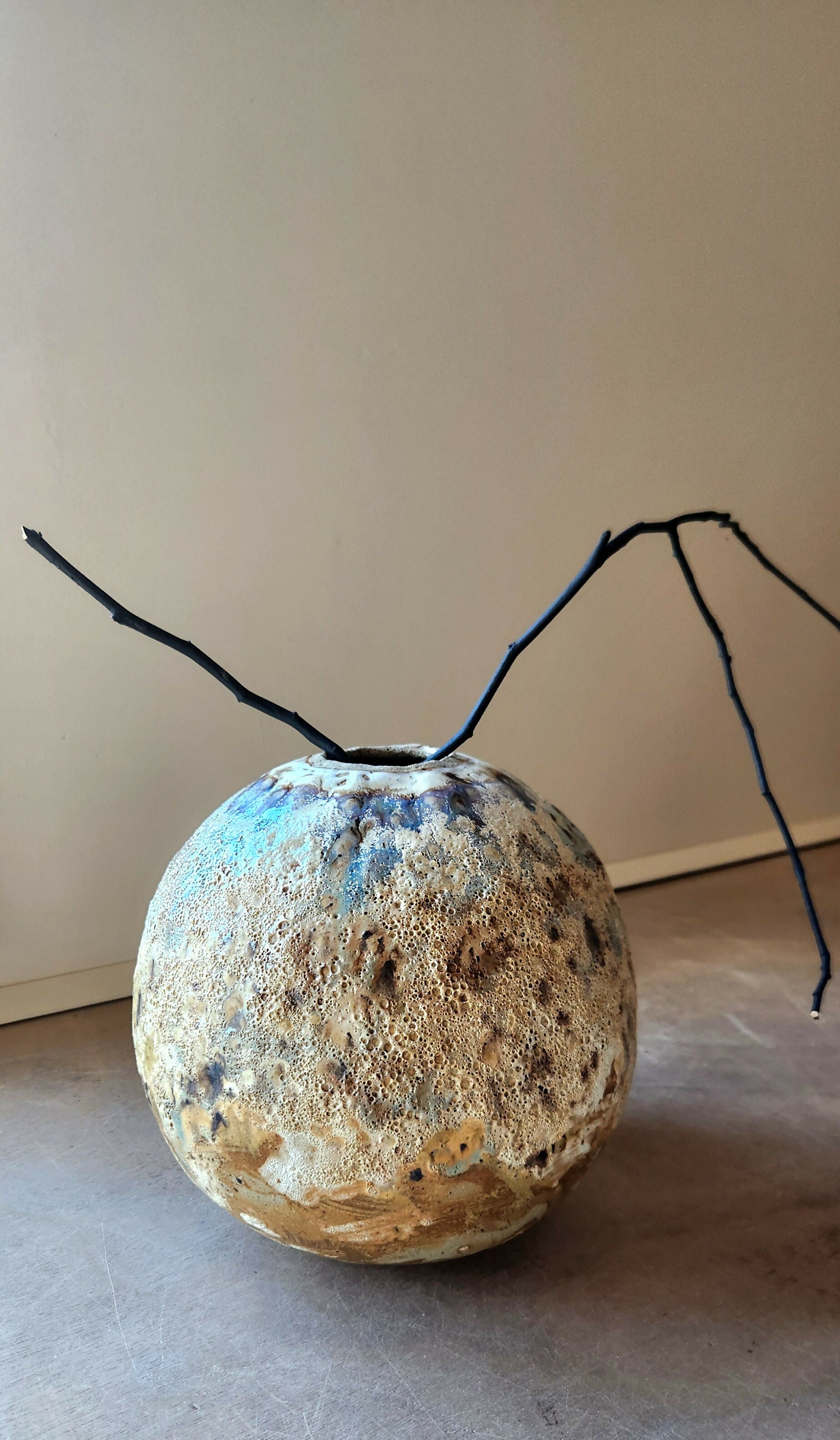 This rounded form has been hand-built with coils to display a more imperfect organic feel. Multiple glazes have been used in varying layers to add texture, and earthy tones similar to cappuccino froth. The inside has been glazed, then been high fired in a gas burner kiln.