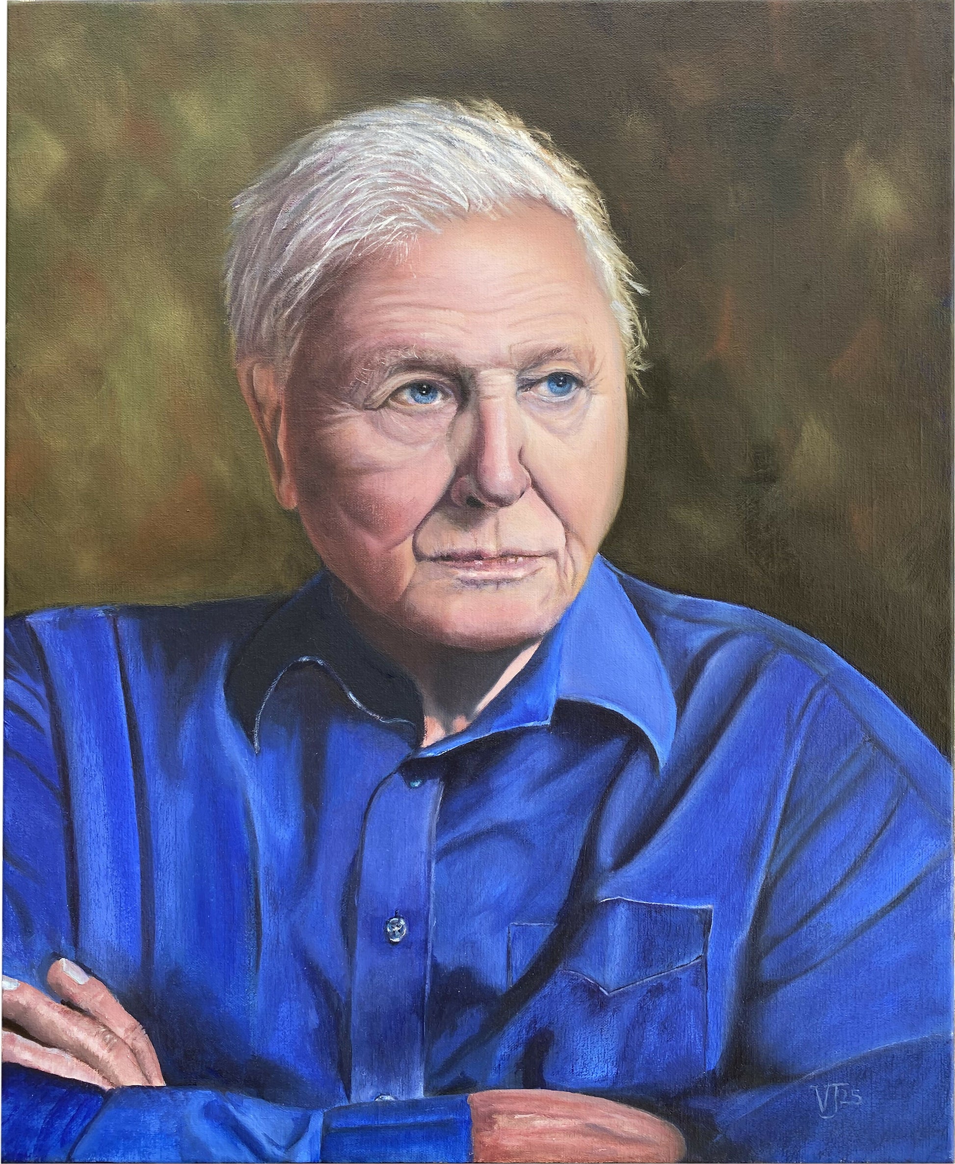 A portrait of David Attenborough. Oil on Canvas. 50cm high x 40 cm wide. Unframed.