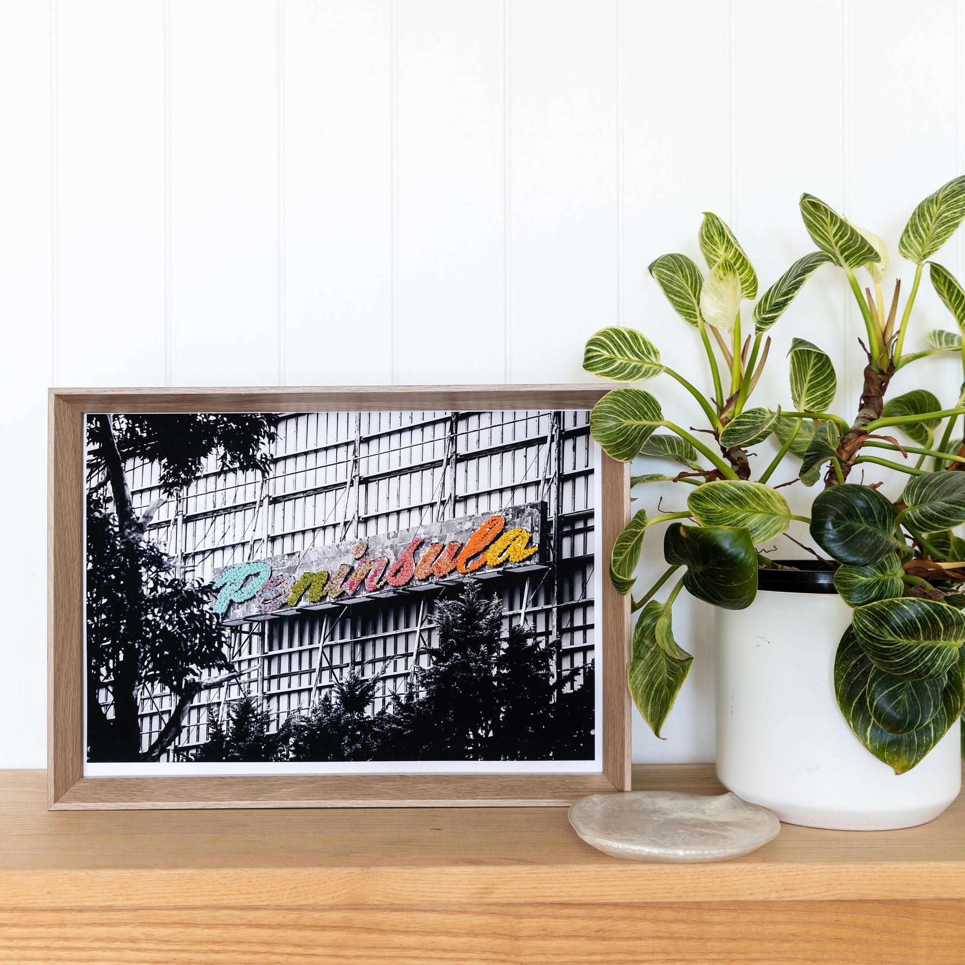 Using my B&W fine art photograph, 'Dromana 3 Drive In, 2016' as source material, the iconic 'Peninsula' neon sign on the back of one of the original screens has been brought to bold technicolour life with over 400 painstakingly hand embroidered french knots.