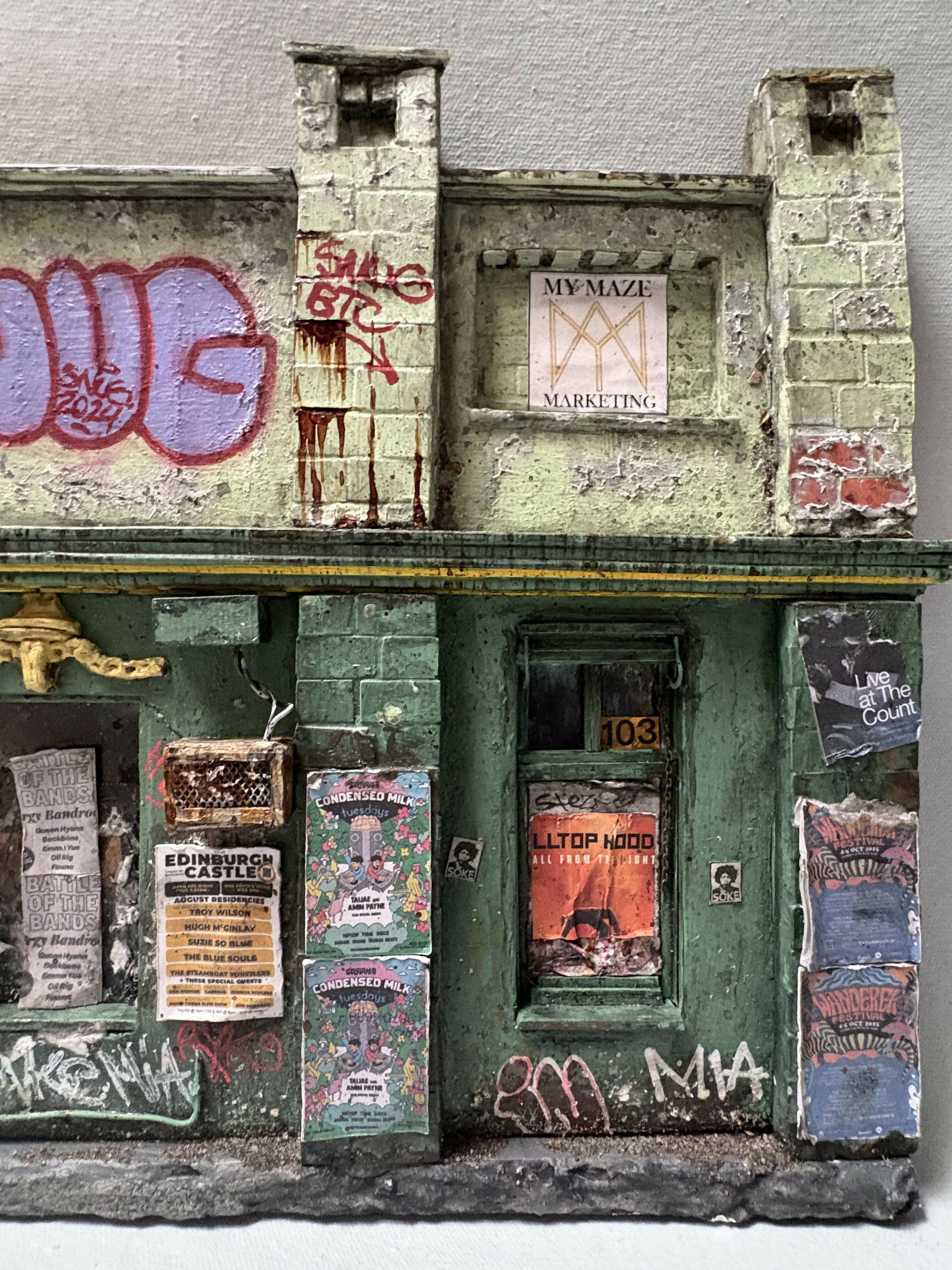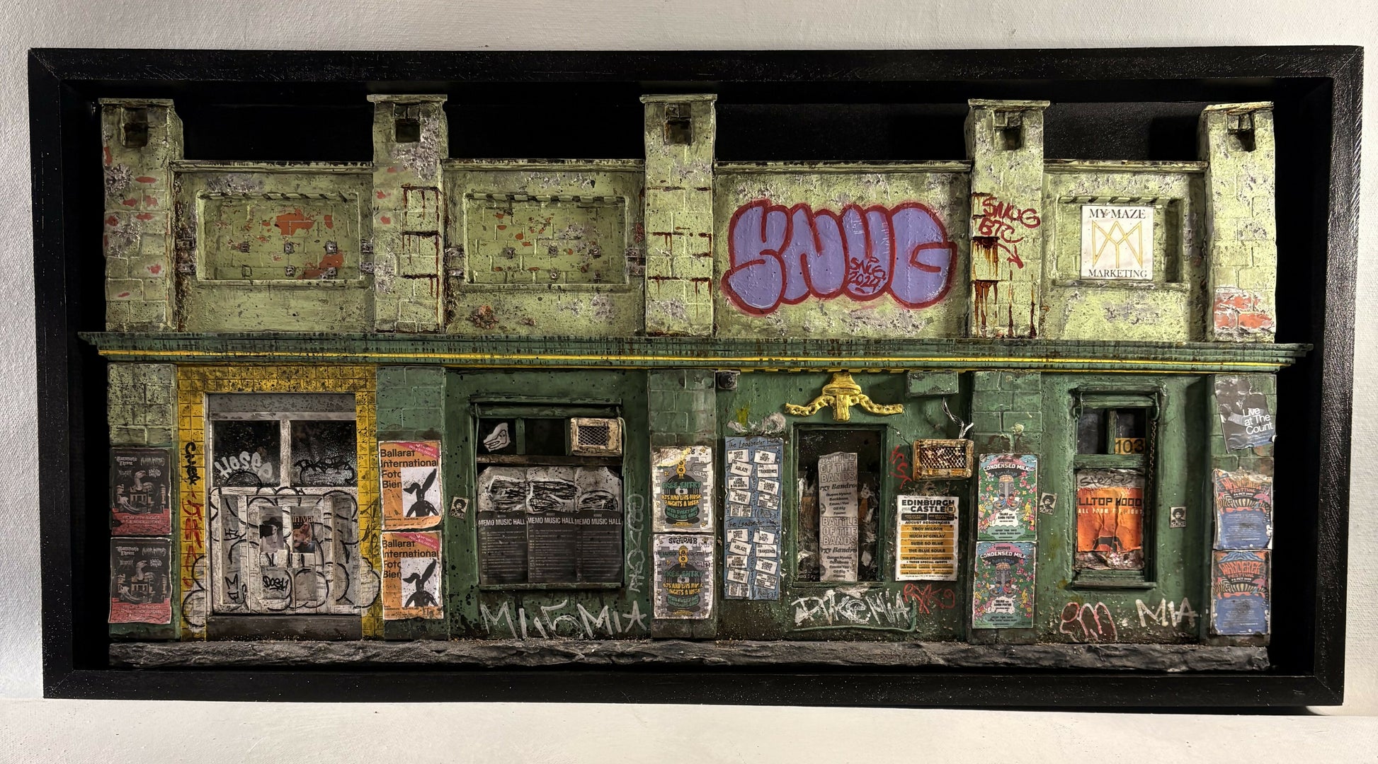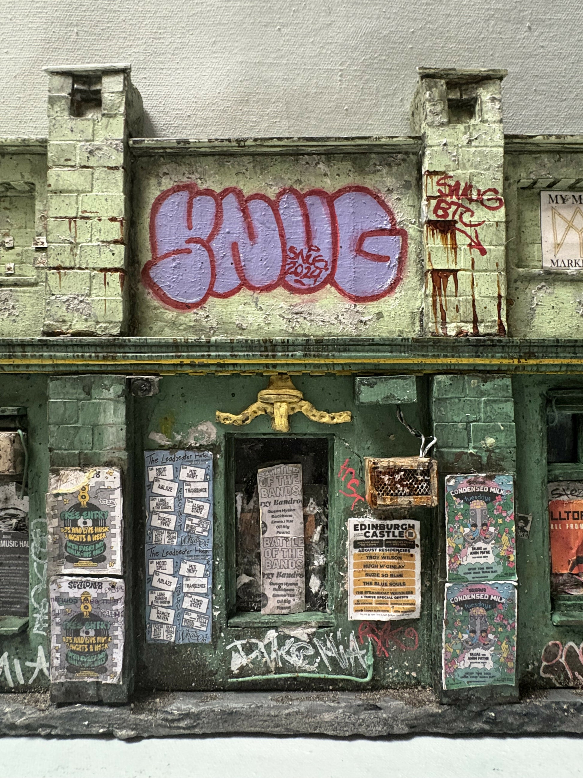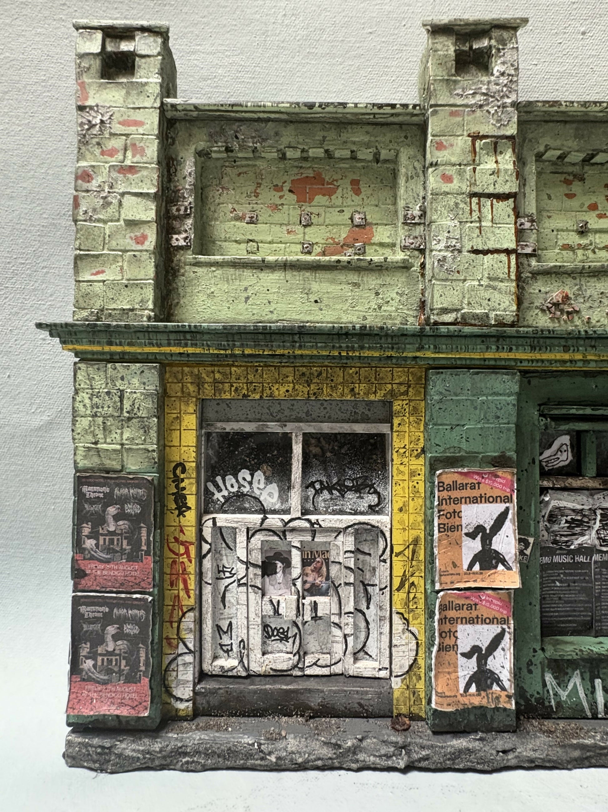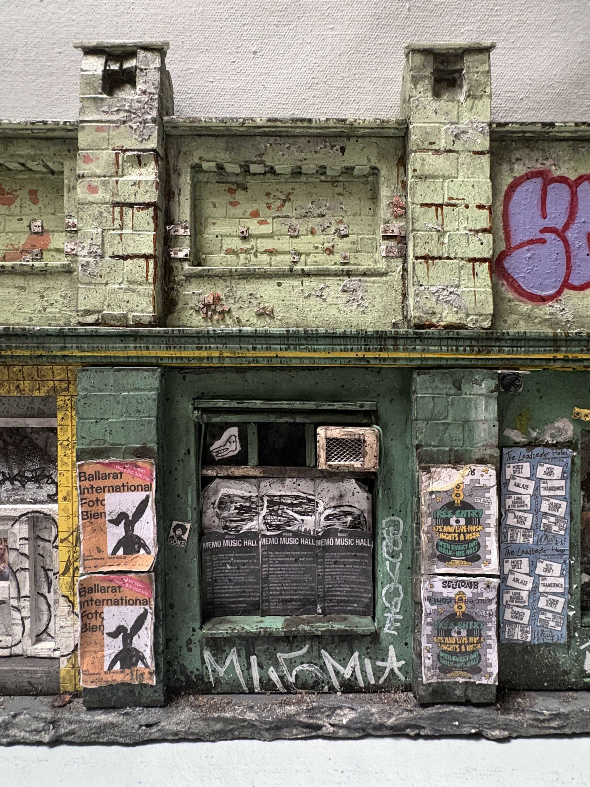 This Handmade miniature recreates the old Eckersley Soda & Co factory in Southbank, Melbourne - a historic building now in a state of disrepair with its weathered facade, graffiti, and various layers of venue posters plastered across its walls.