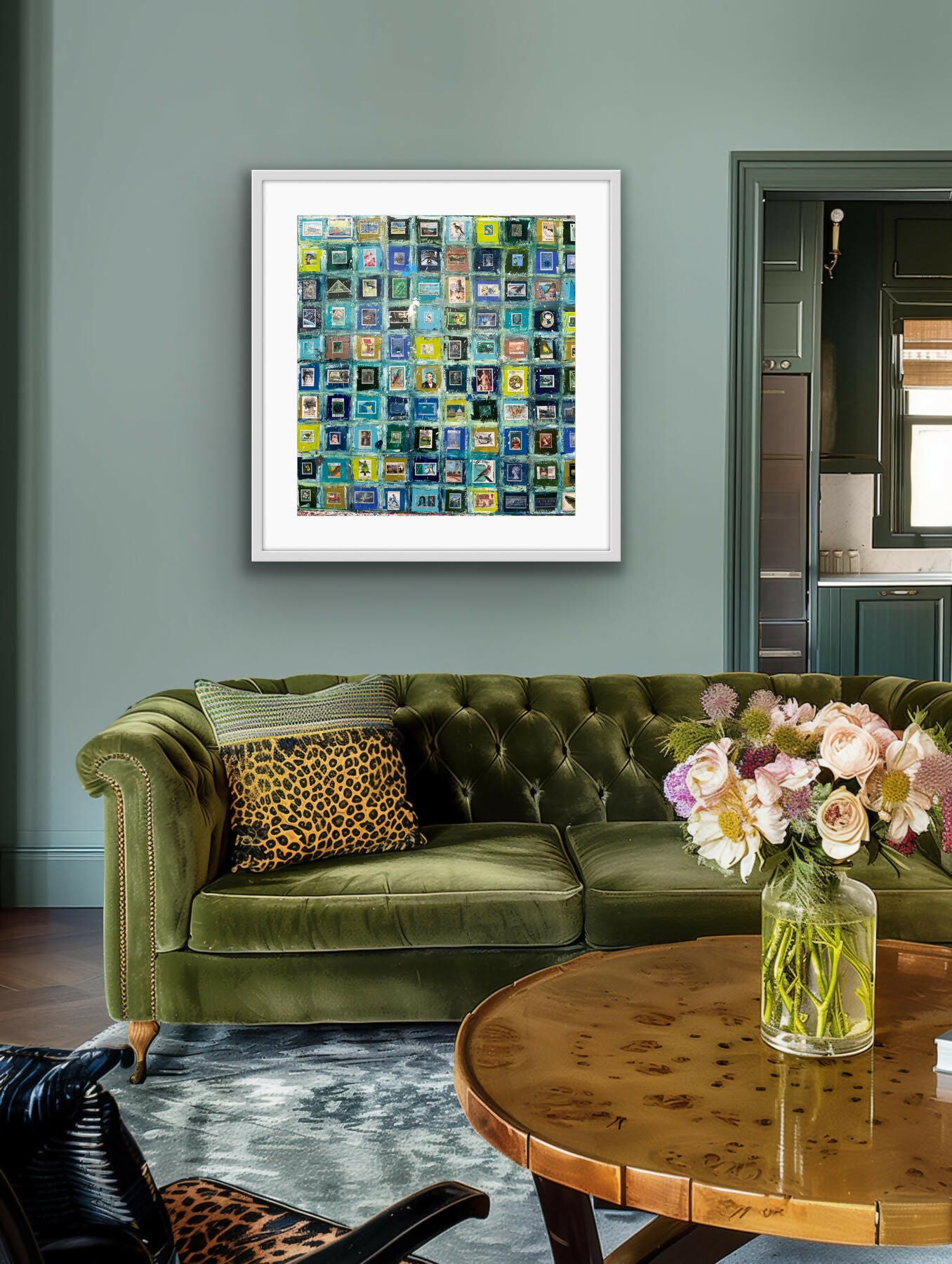 A vibrant grid based artwork composing of numerous postage stamps, embedded in painted squares layered in blues and greens. Each stamp carries its own story, together creating a mosaic of wonder. This piece radiates nostalgia.