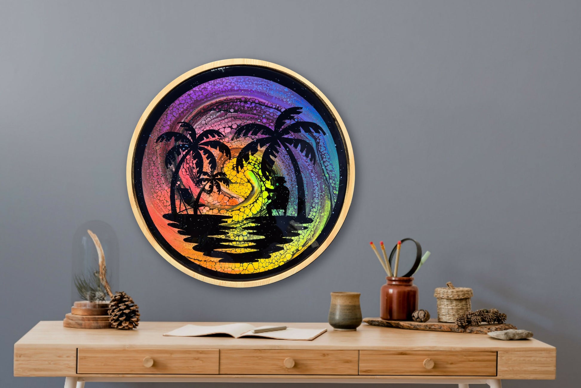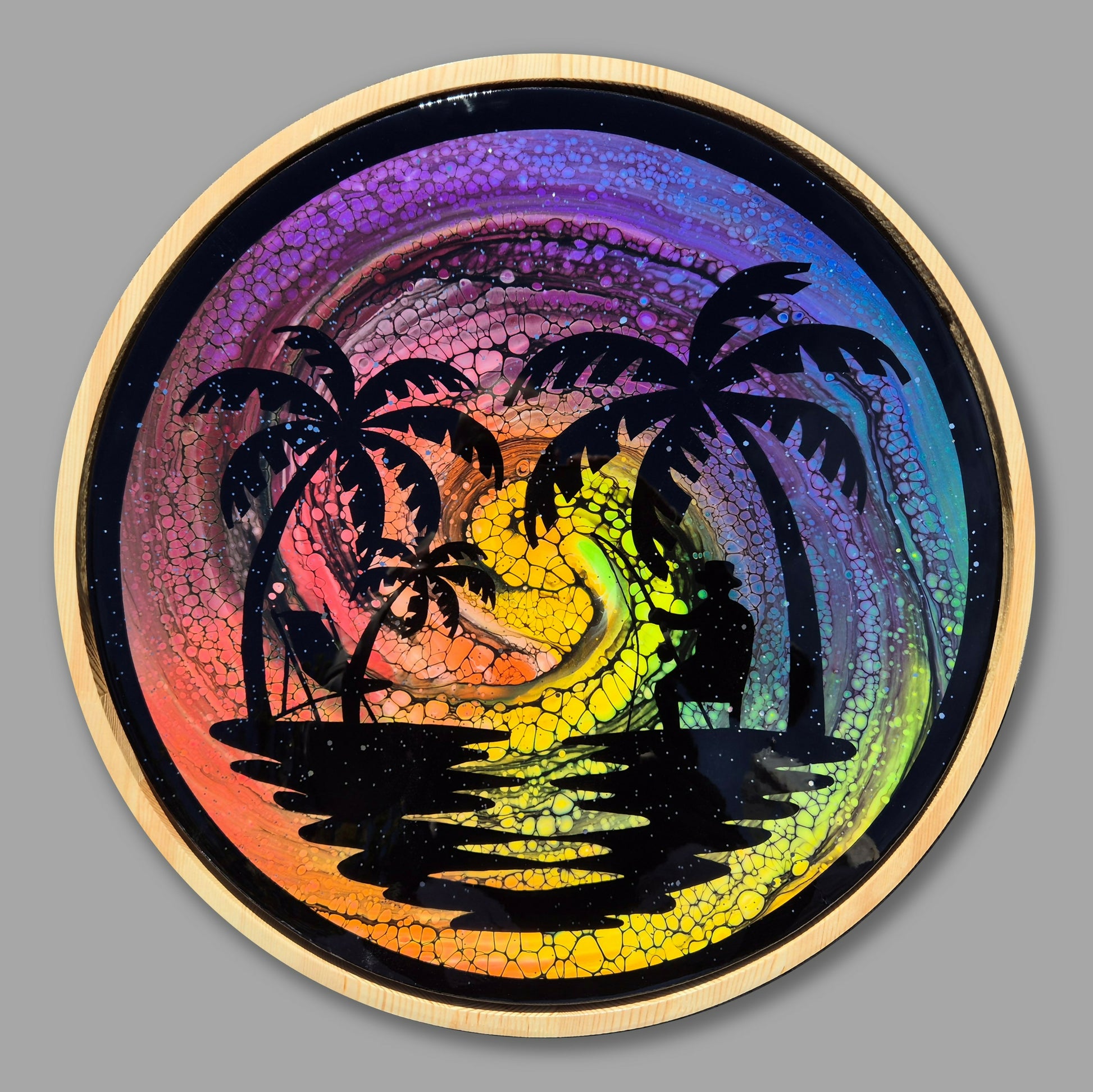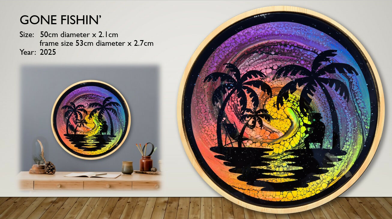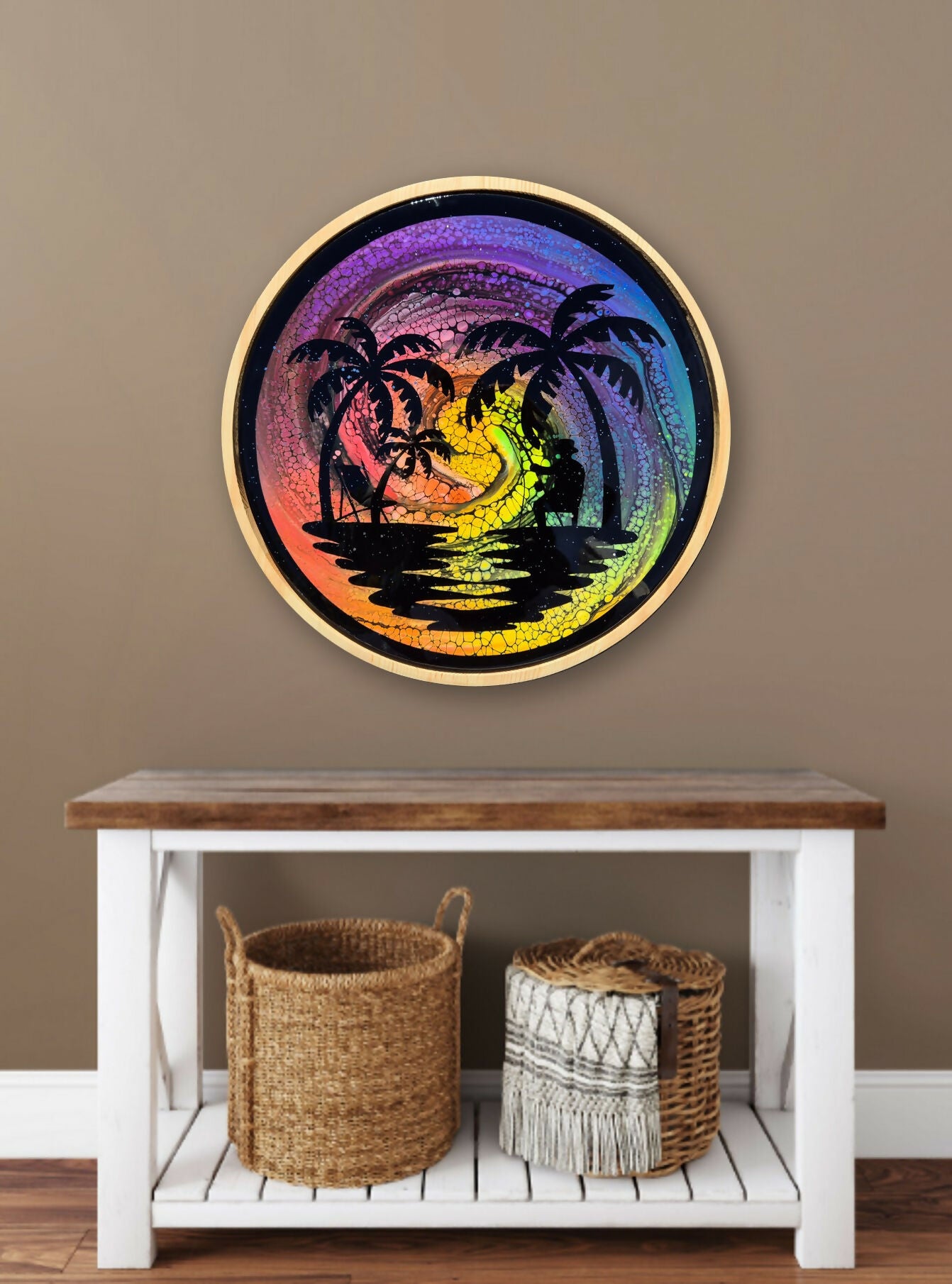 This gorgeous piece is an unusual framed round canvas (canvas size 50cm diameter, frame size 53cm diameter). A gorgeous rainbow sunset over the water. Finished with glitter infused resin, it is guaranteed to bring the focal point in any room.