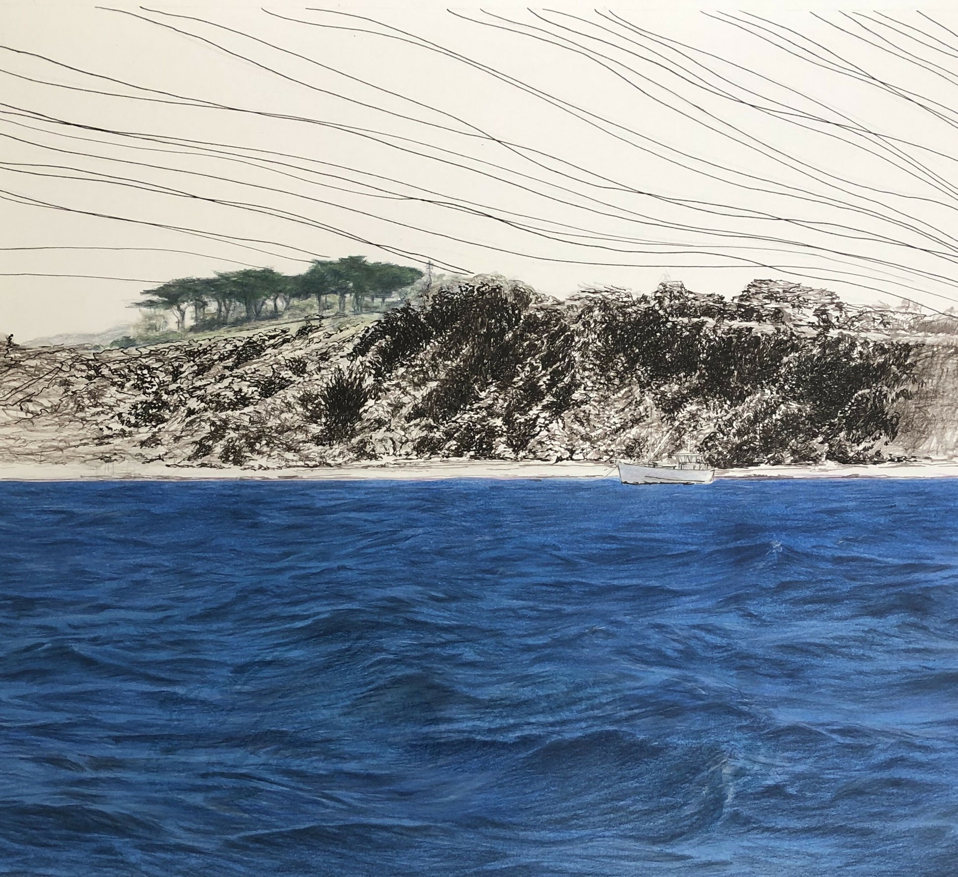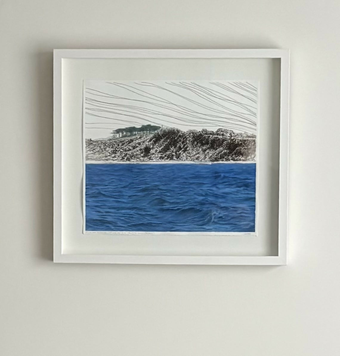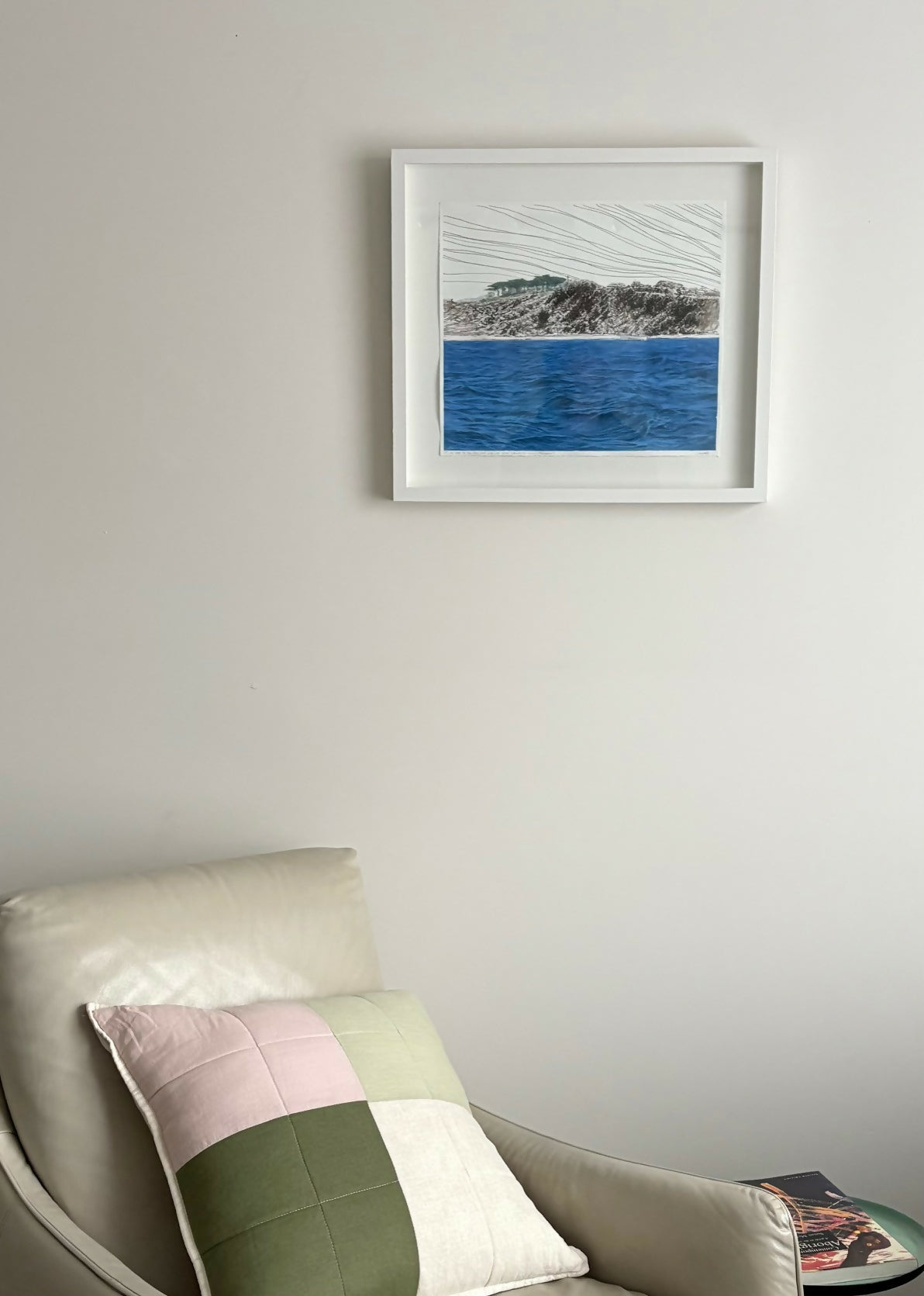 Mixed media drawing on paper using watercolour, gouache, colour pencil, ink and woodcut print. Float mounted in a white frame using archival techniques behind art glass.