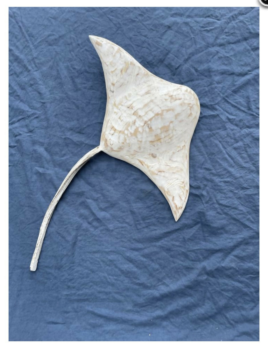 A wall hung sculpture of a stingray created from recycled timber finished in lining white.