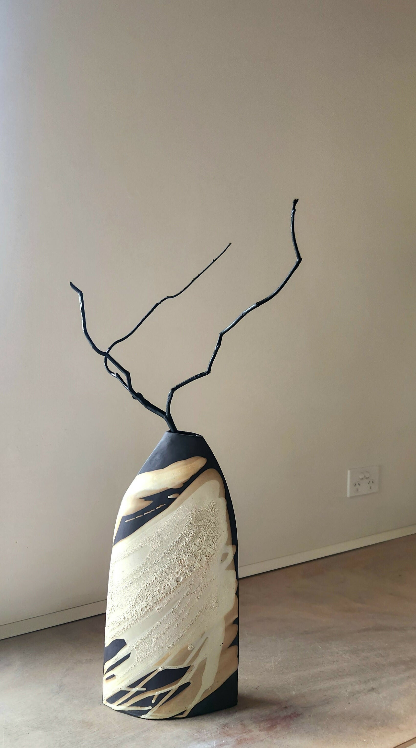 This form has been made using the slab hand-building technique. A glaze has been poured over the form to crate movement and texture, contrasting the clay color. The form has been glossy glazed inside then high temperature fired in a gas burner kiln.