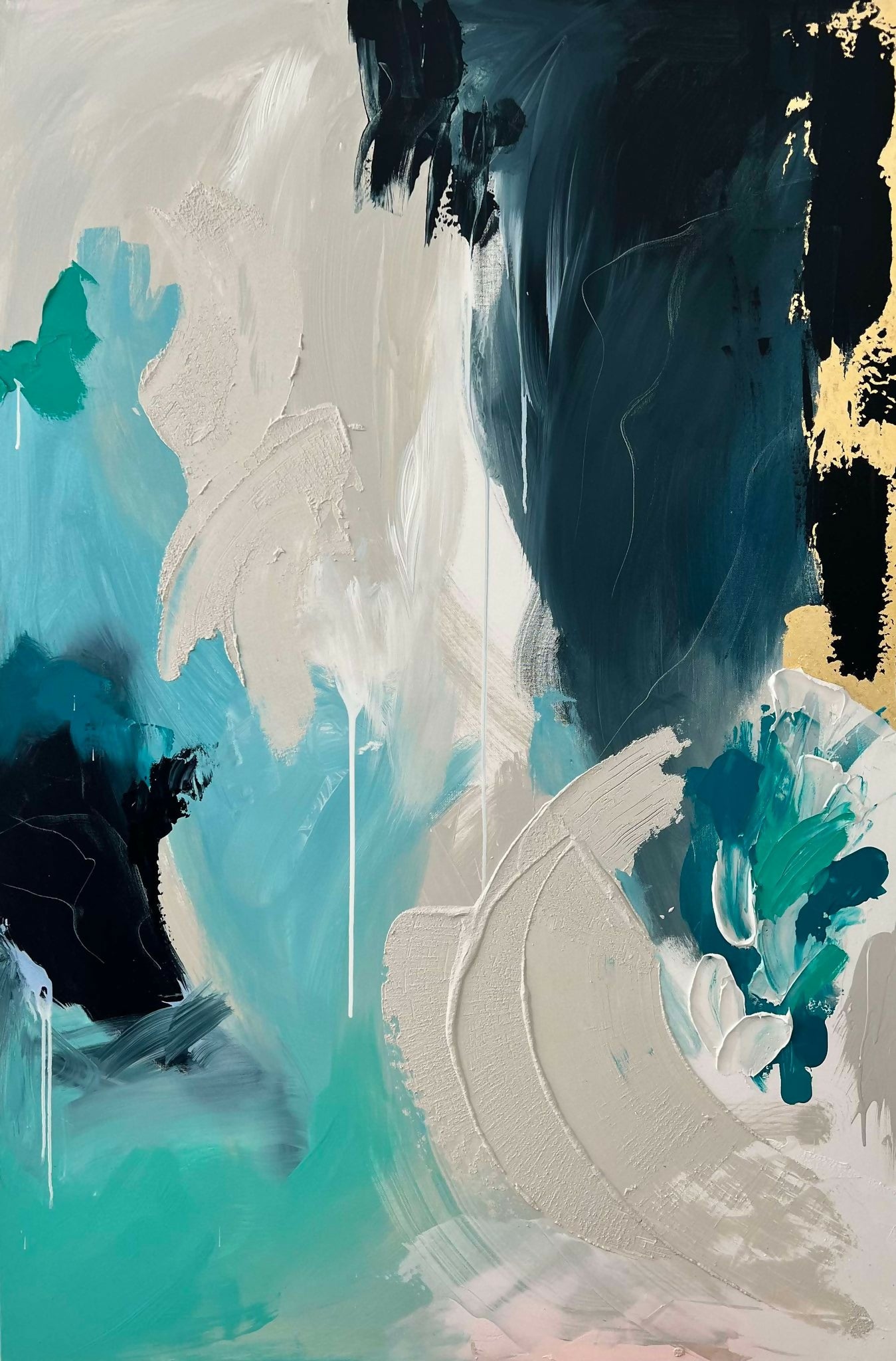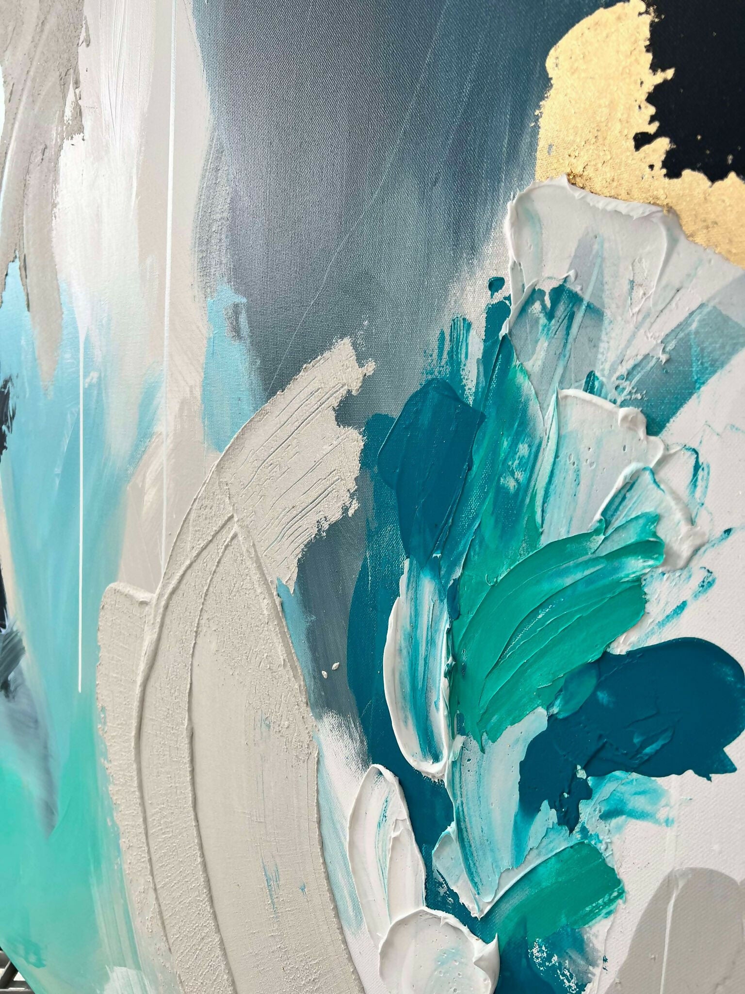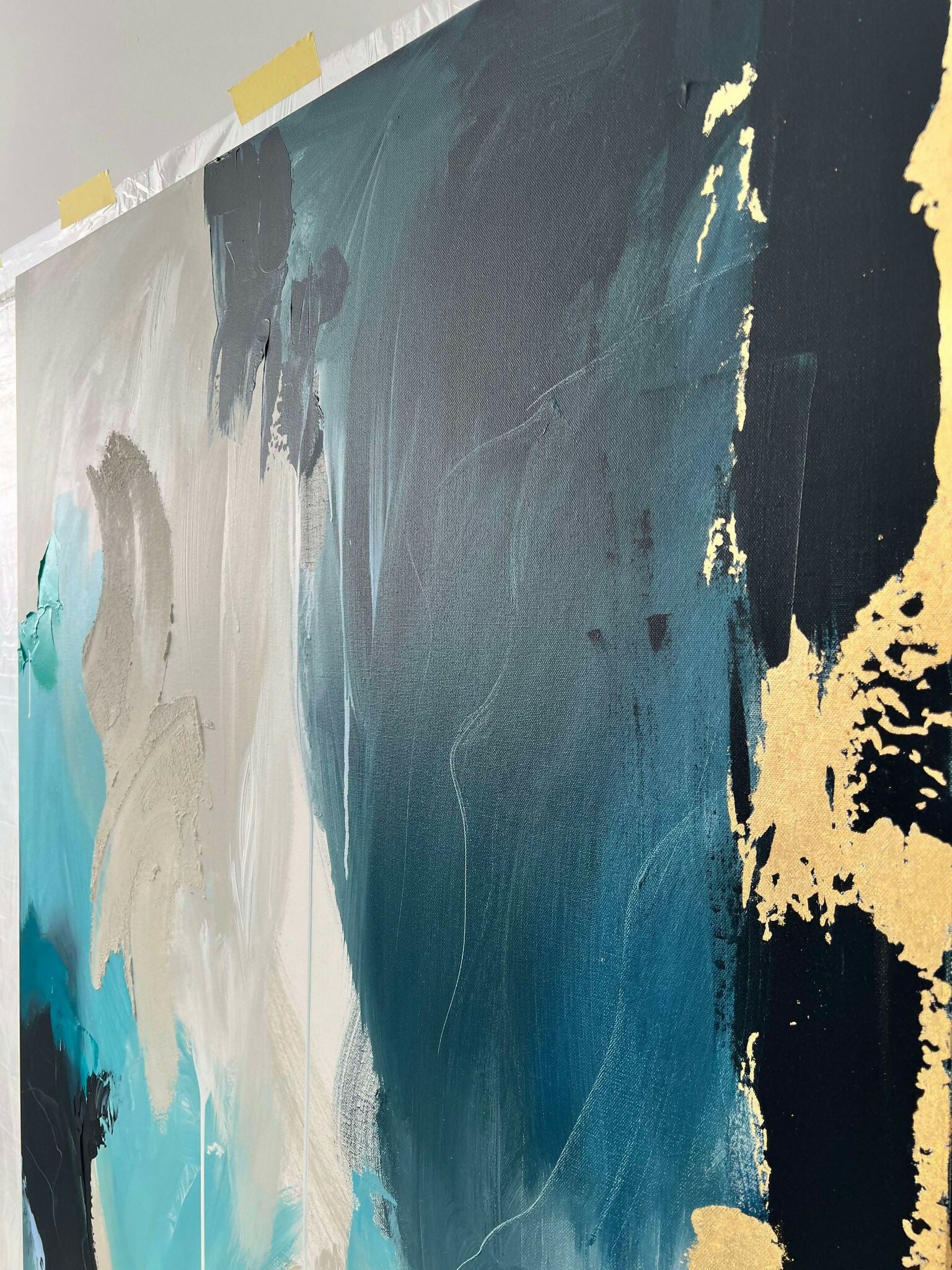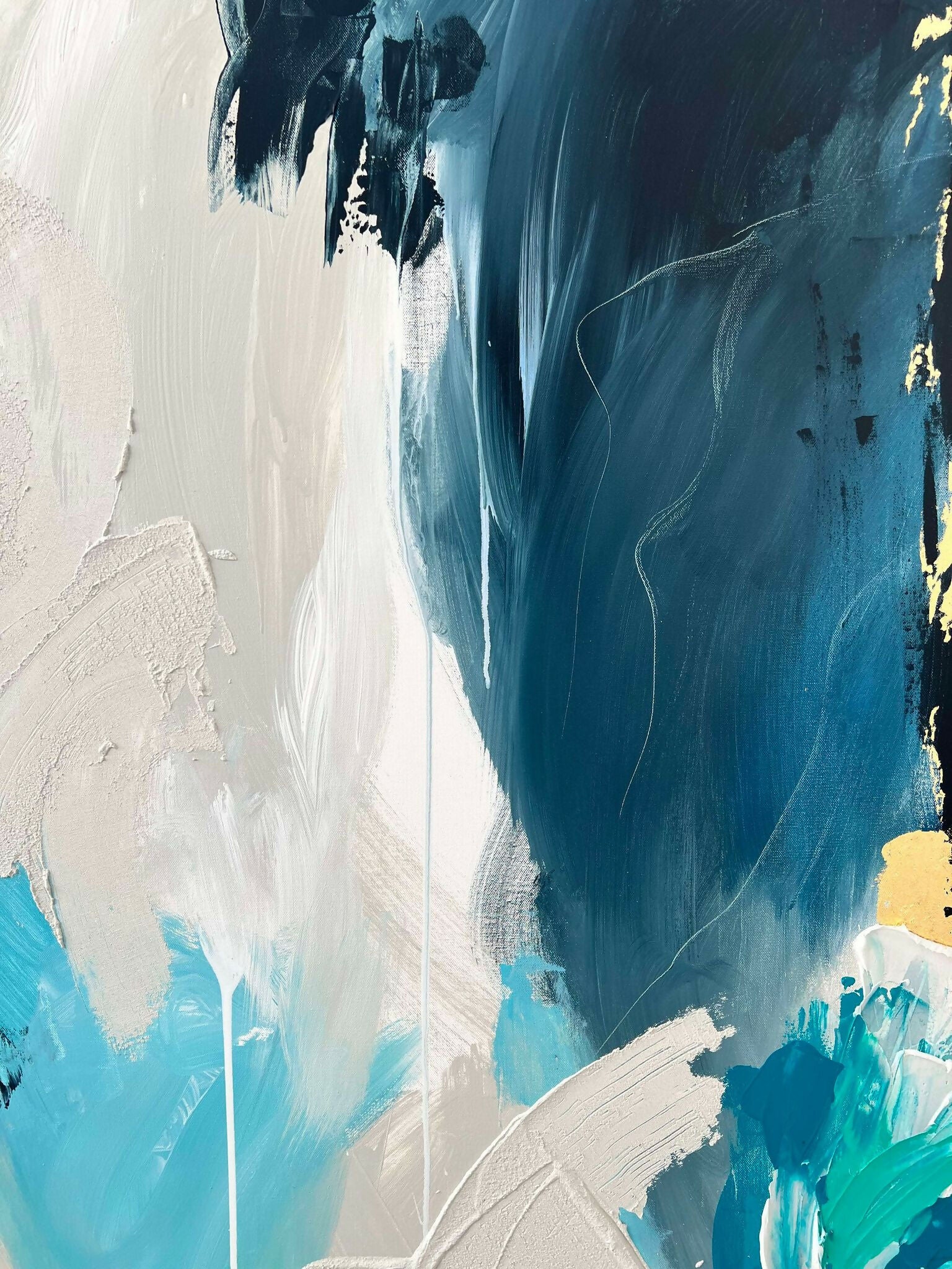 Lead to Water - 101 x 152 - Experience a captivating abstract artwork combining calming blue tones with a textured sand background. Tranquil drops cascade gracefully, while golden leaf accents offer elegance and warmth. A serene oasis for any modern space.