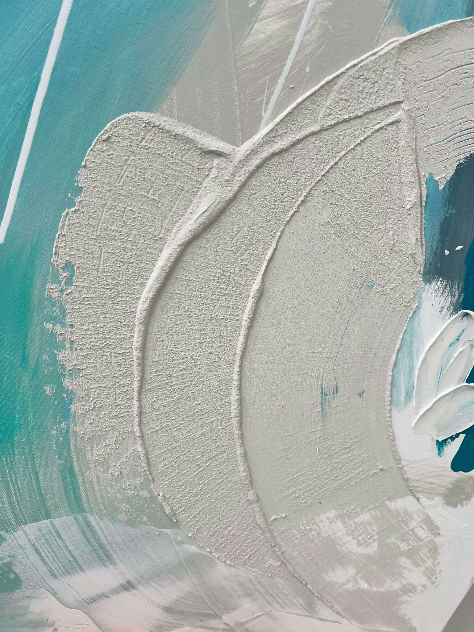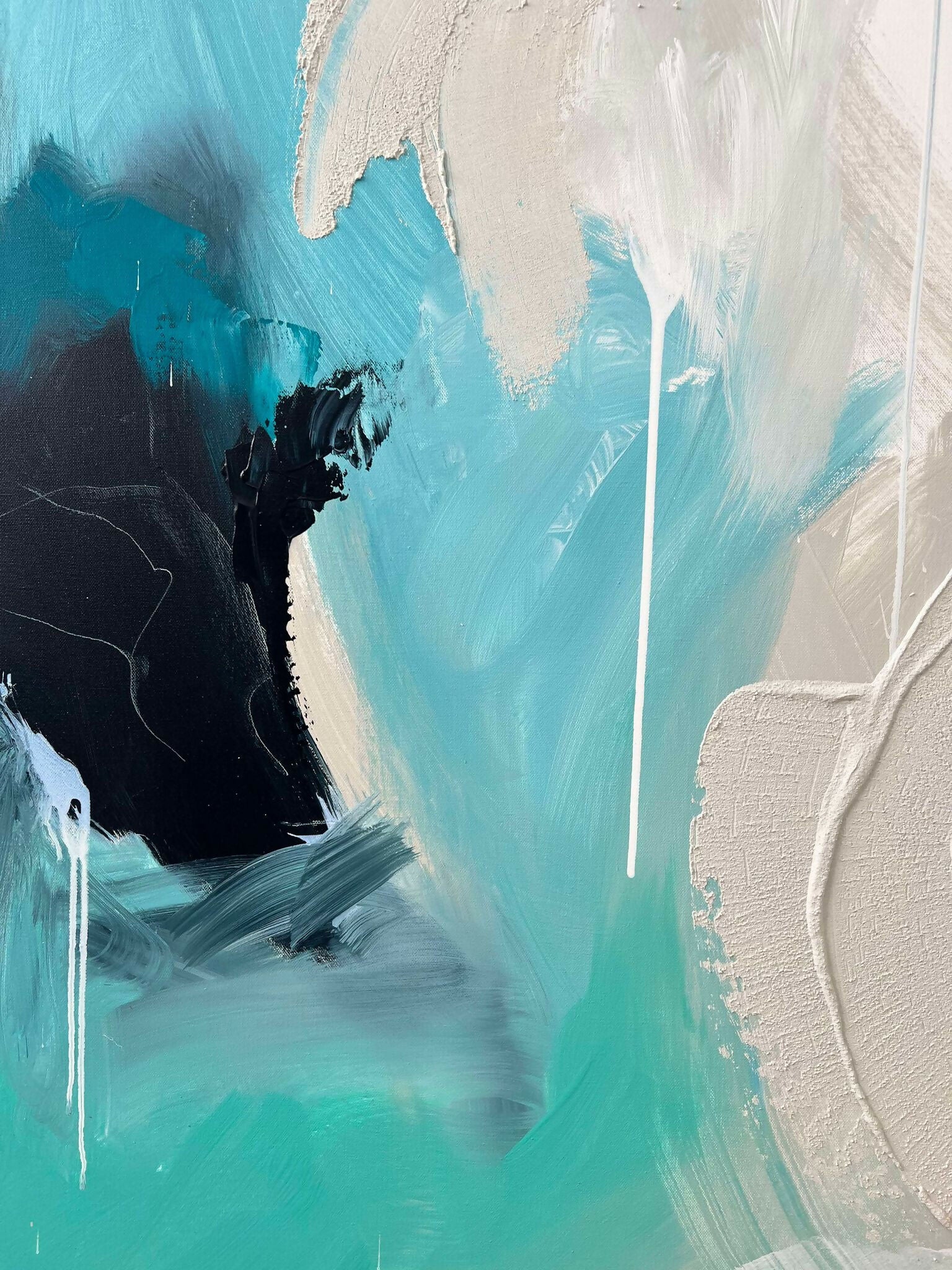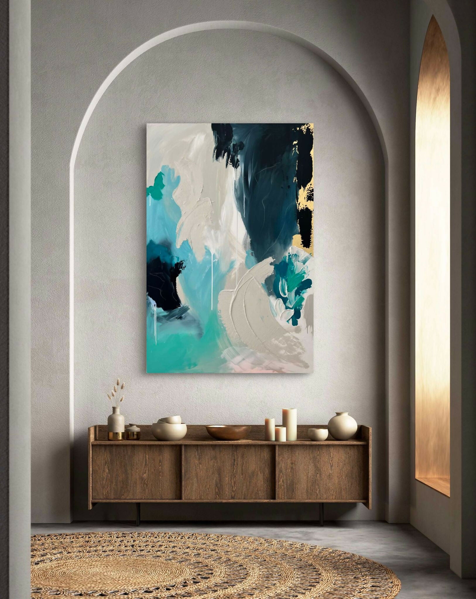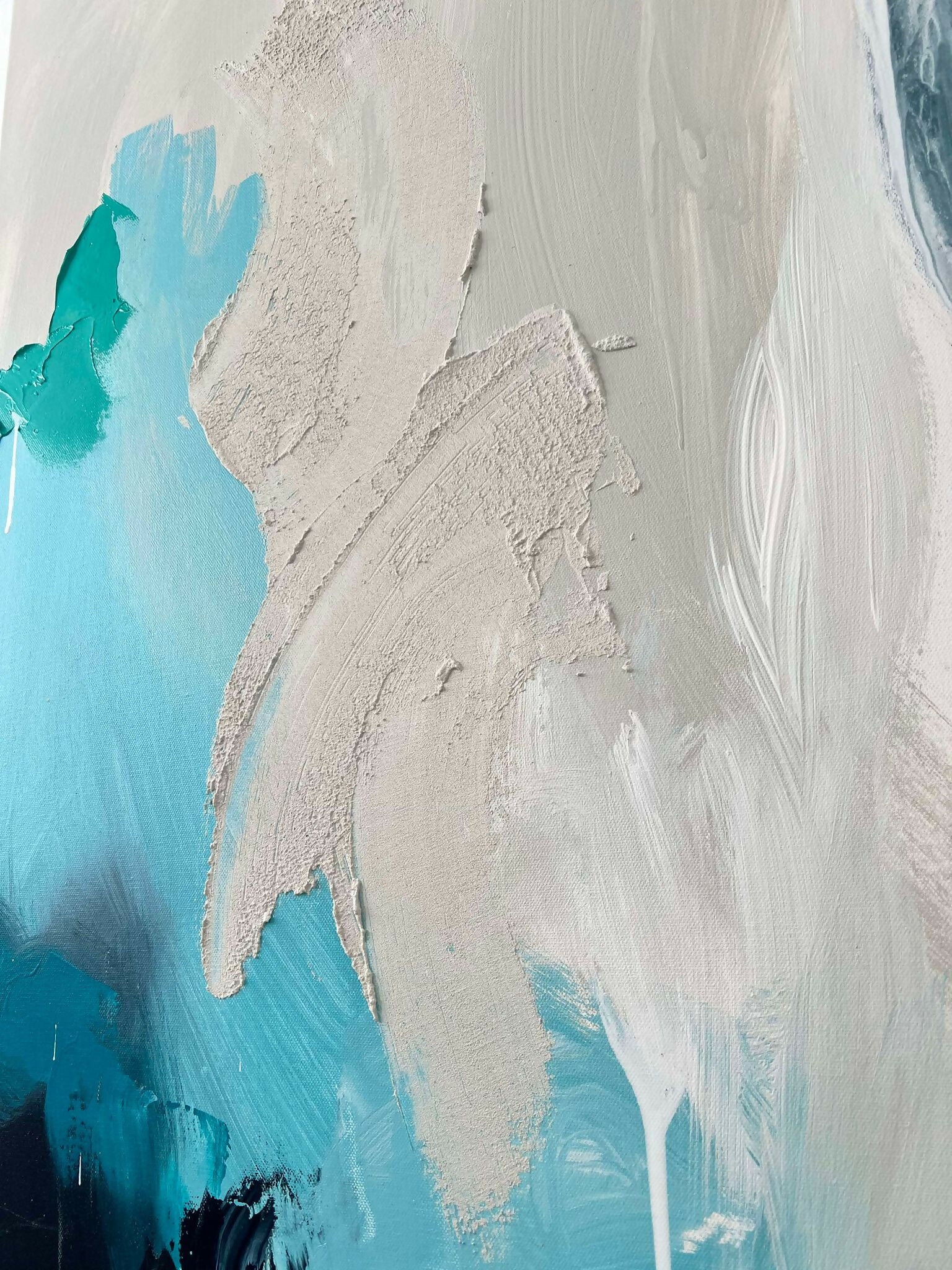 Lead to Water - 101 x 152 - Experience a captivating abstract artwork combining calming blue tones with a textured sand background. Tranquil drops cascade gracefully, while golden leaf accents offer elegance and warmth. A serene oasis for any modern space.