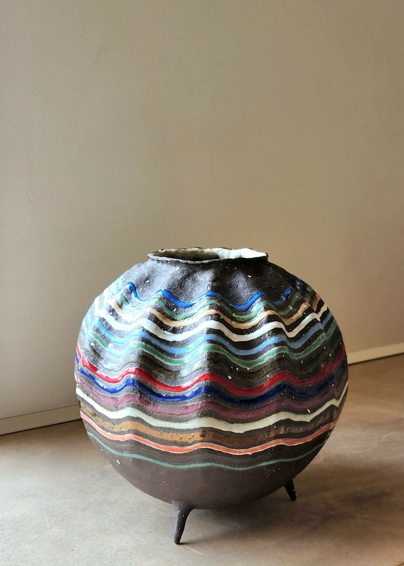 This unique piece has been made using a brilliant chocolatey black clay and hand-building techniques. A joyful variety of colored glazes have been painted on to emphasise the stretched ridge features of the piece, then high fired in a gas burner kiln.
