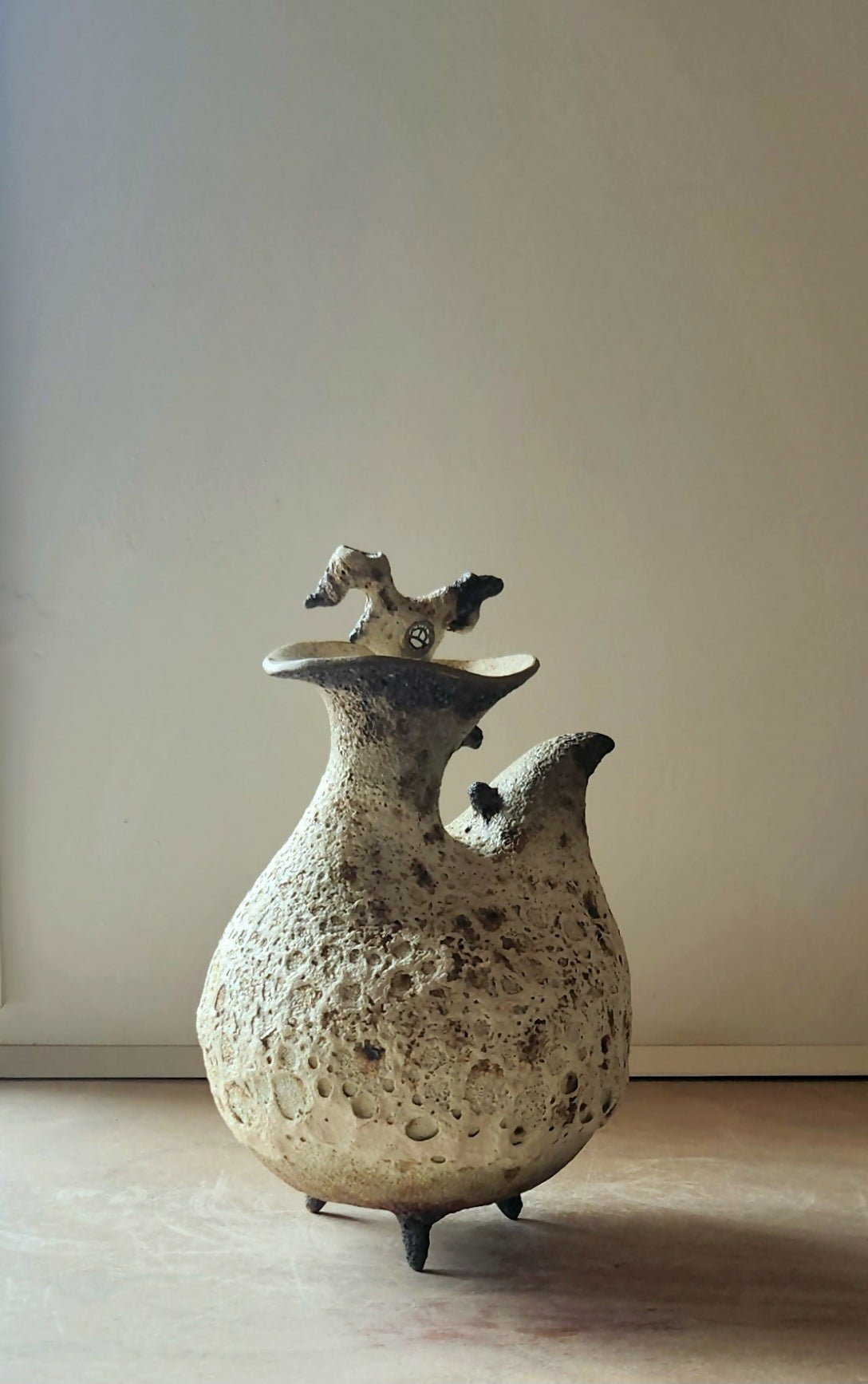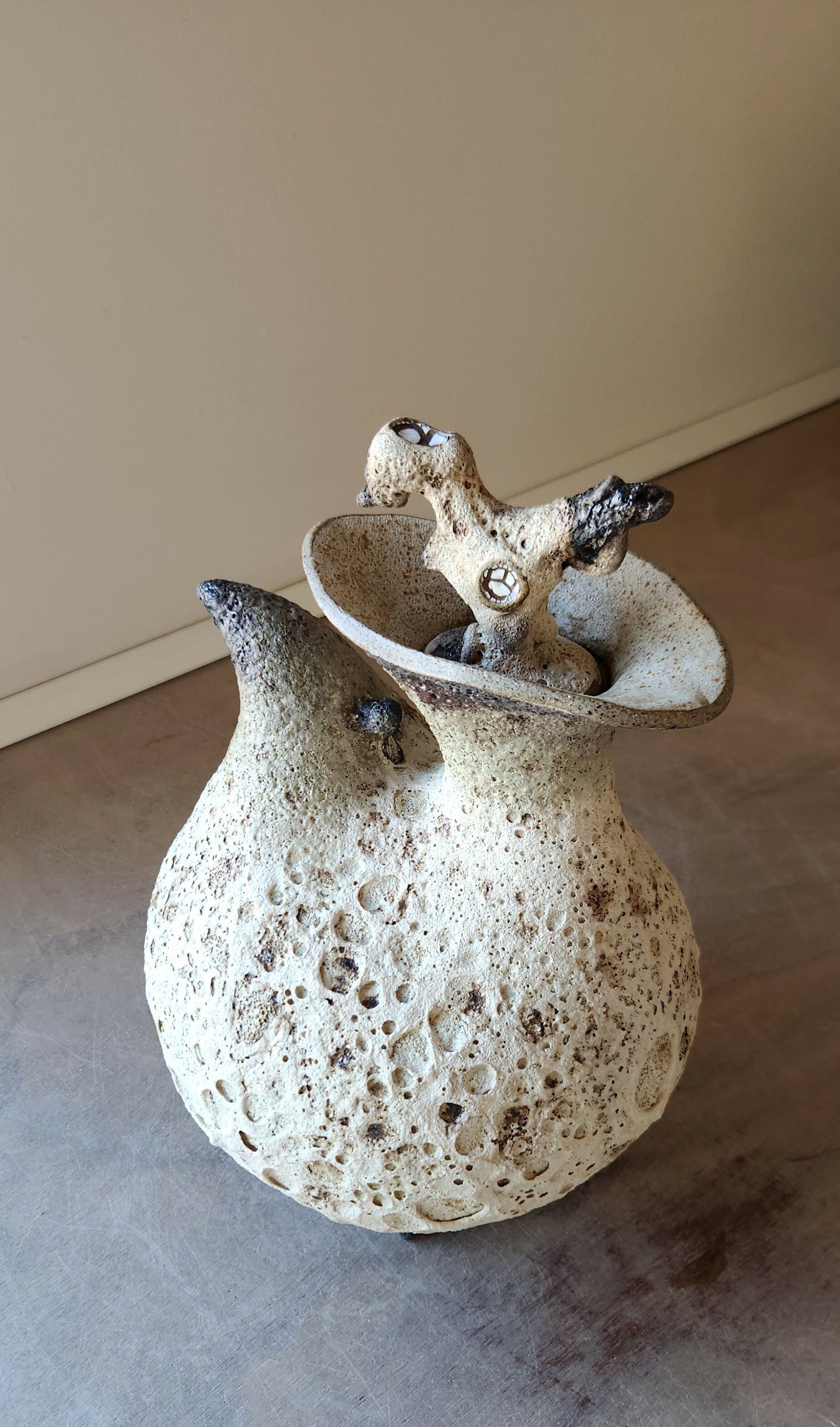 A hand-built form made from a sandy colored clay, fired in a gas burner kiln.