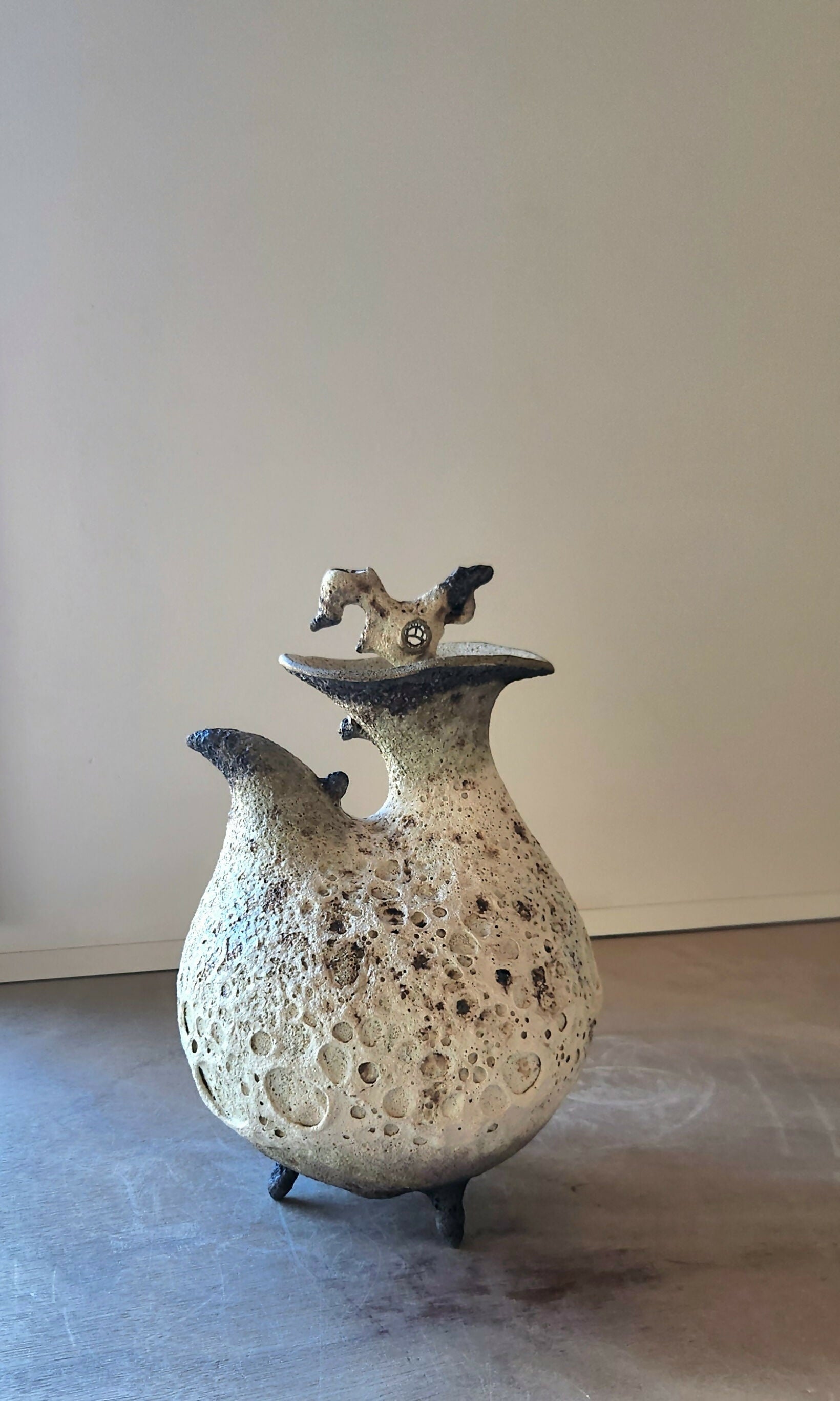Portraying a playful caricature, it is decorated with a sculptural lid, and shaded with a moon-like glaze.