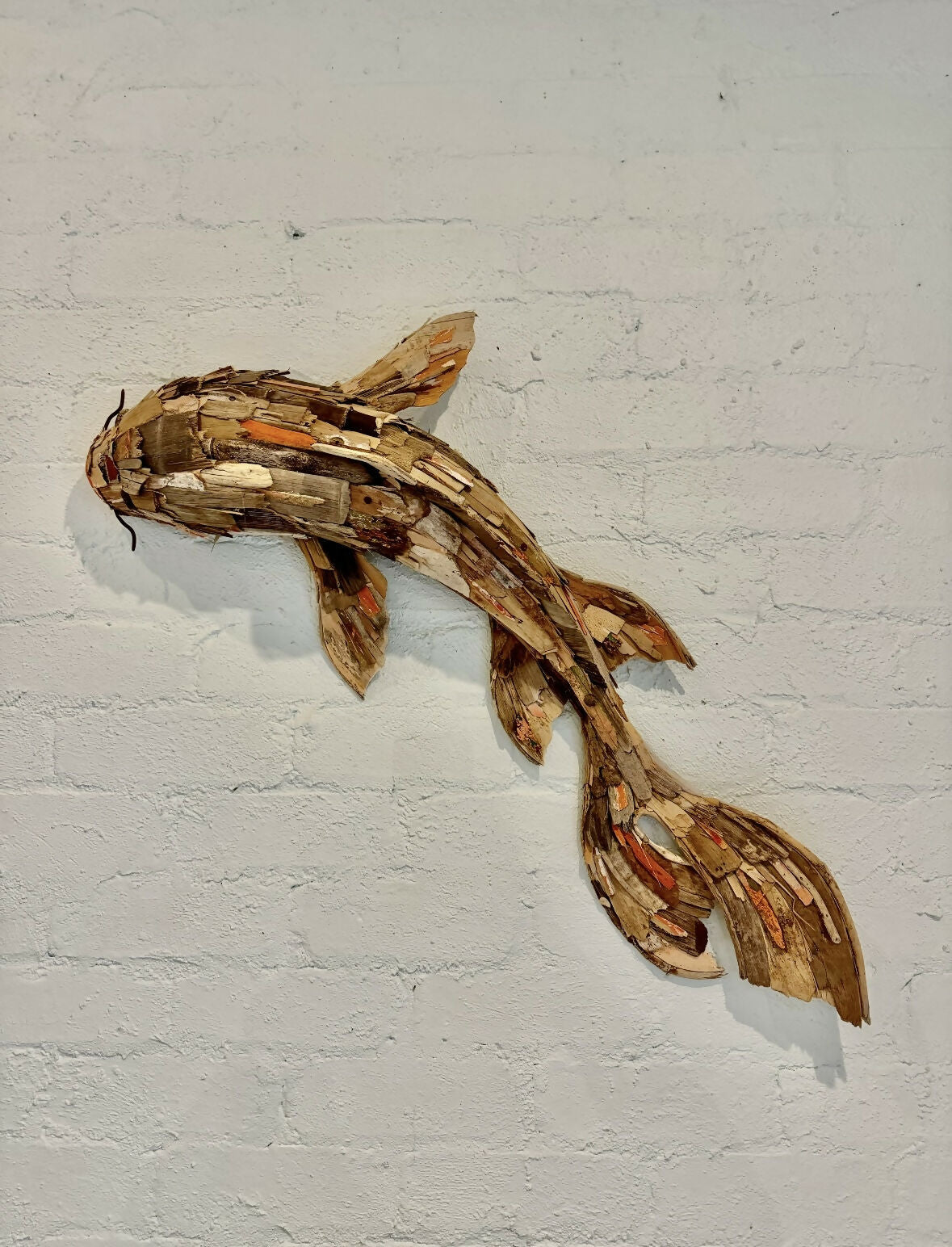 A wall hung sculpture of a Koi fish created from driftwood, including bamboo driftwood collected from Japan.