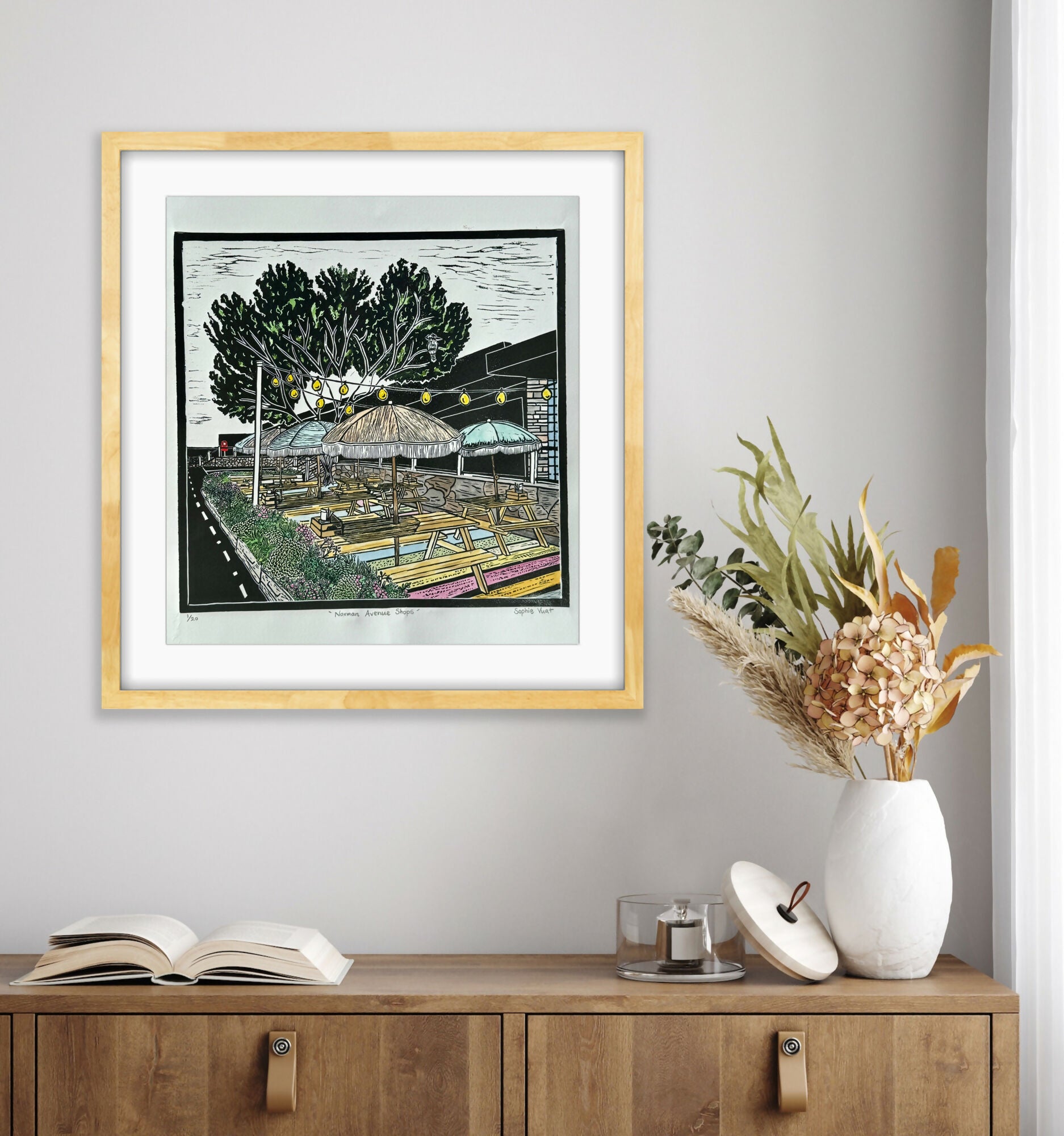 Framed in oak with a white mat, the work measures 55 cm wide and 65 cm high.