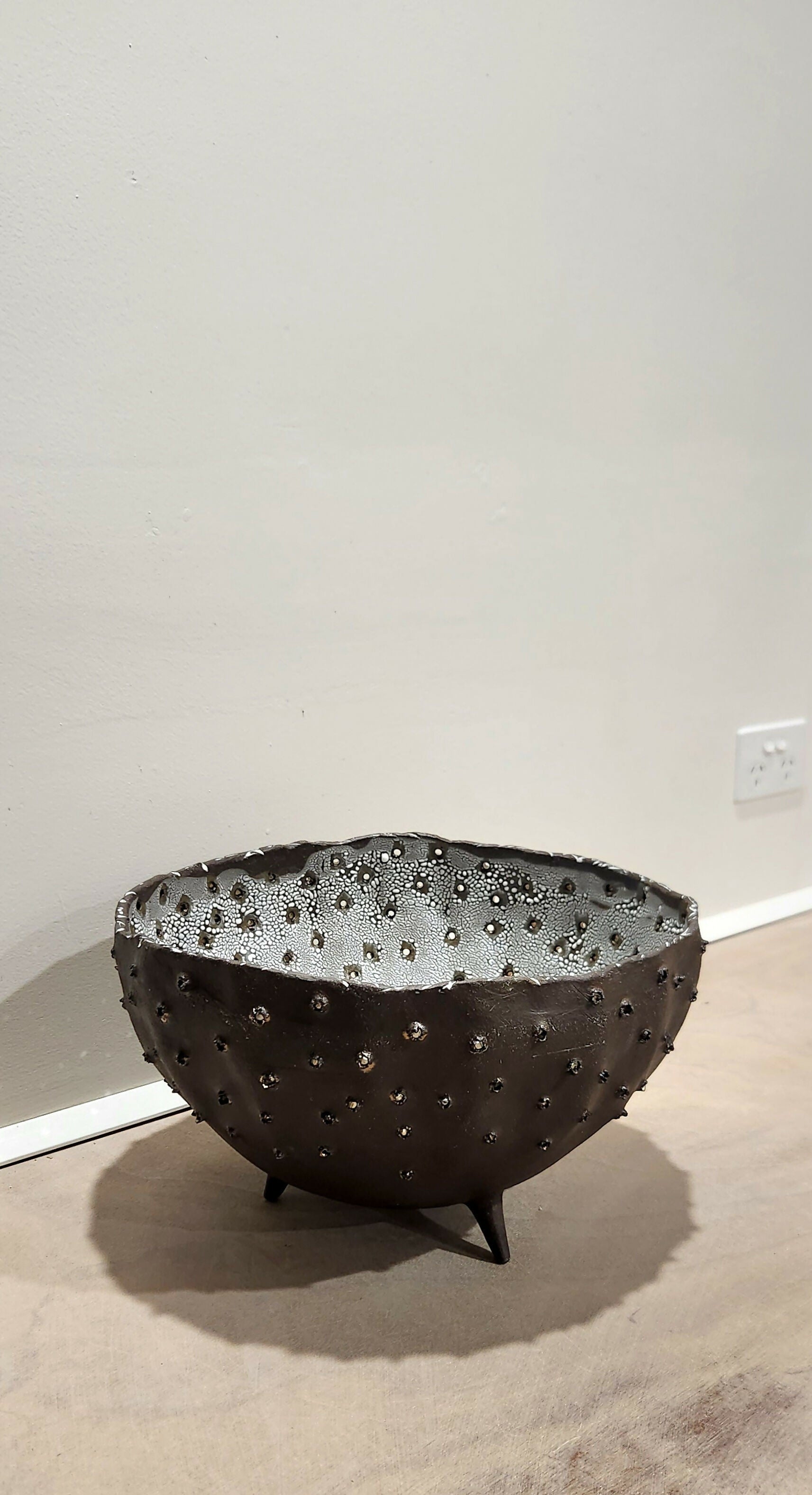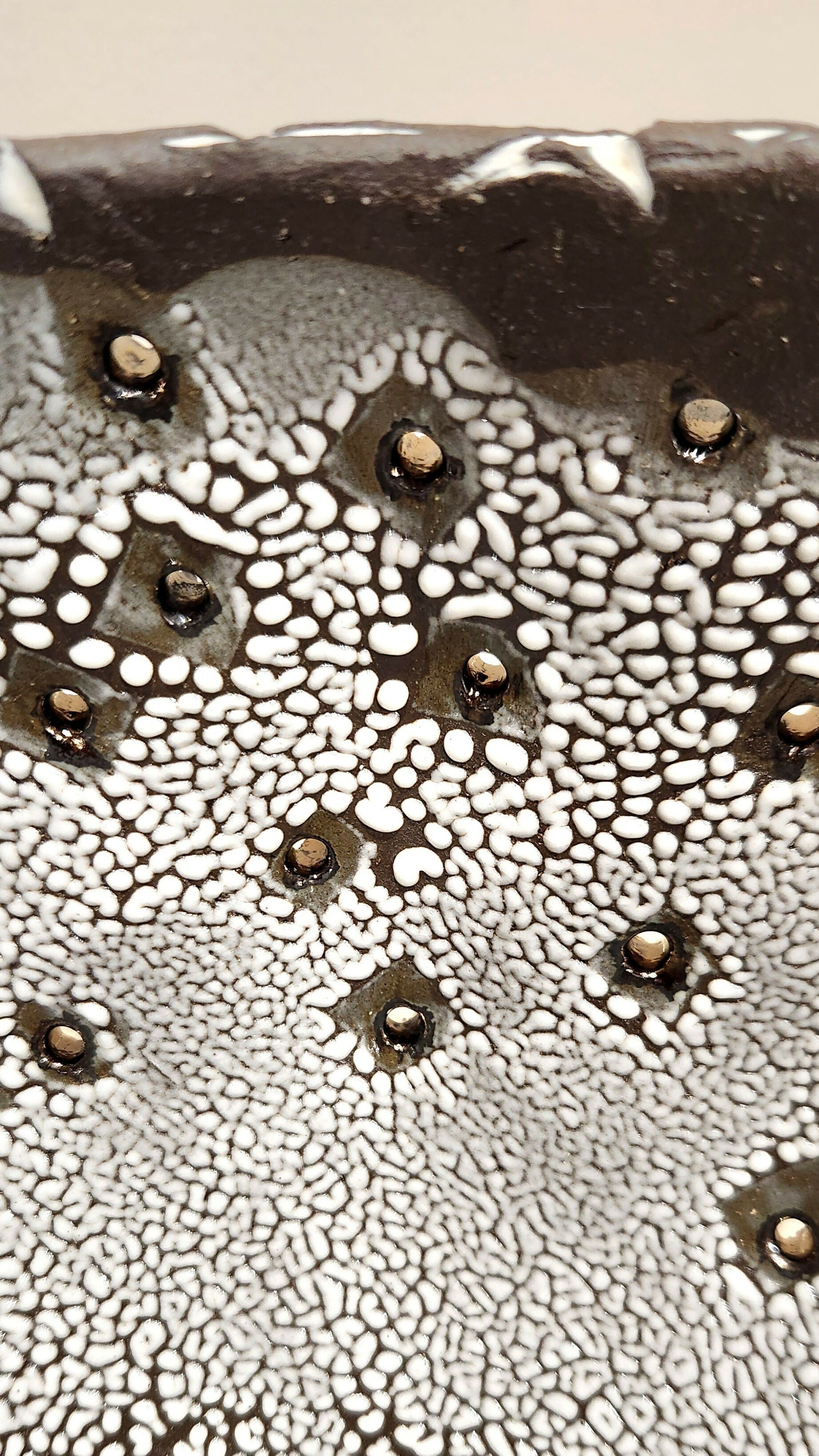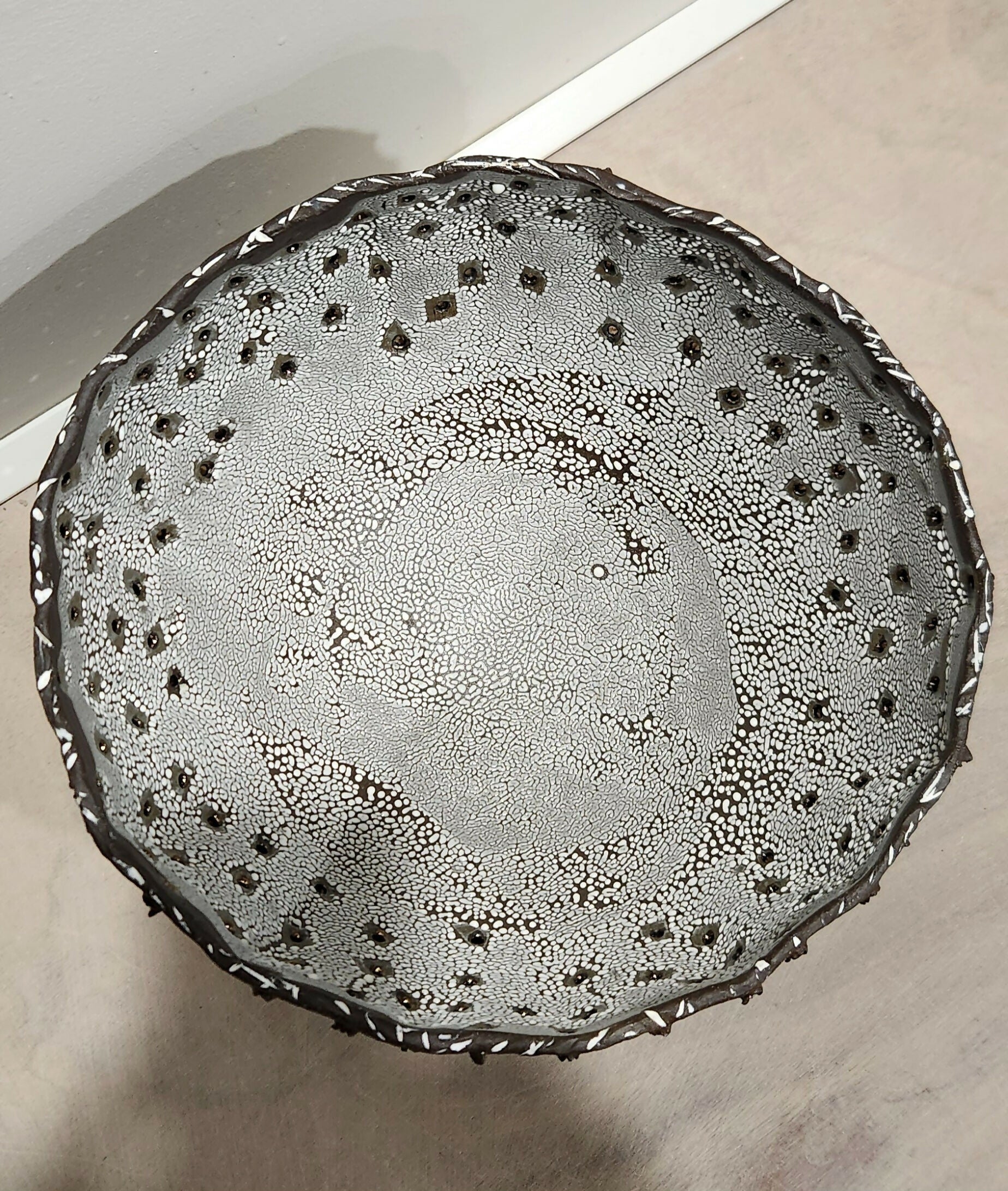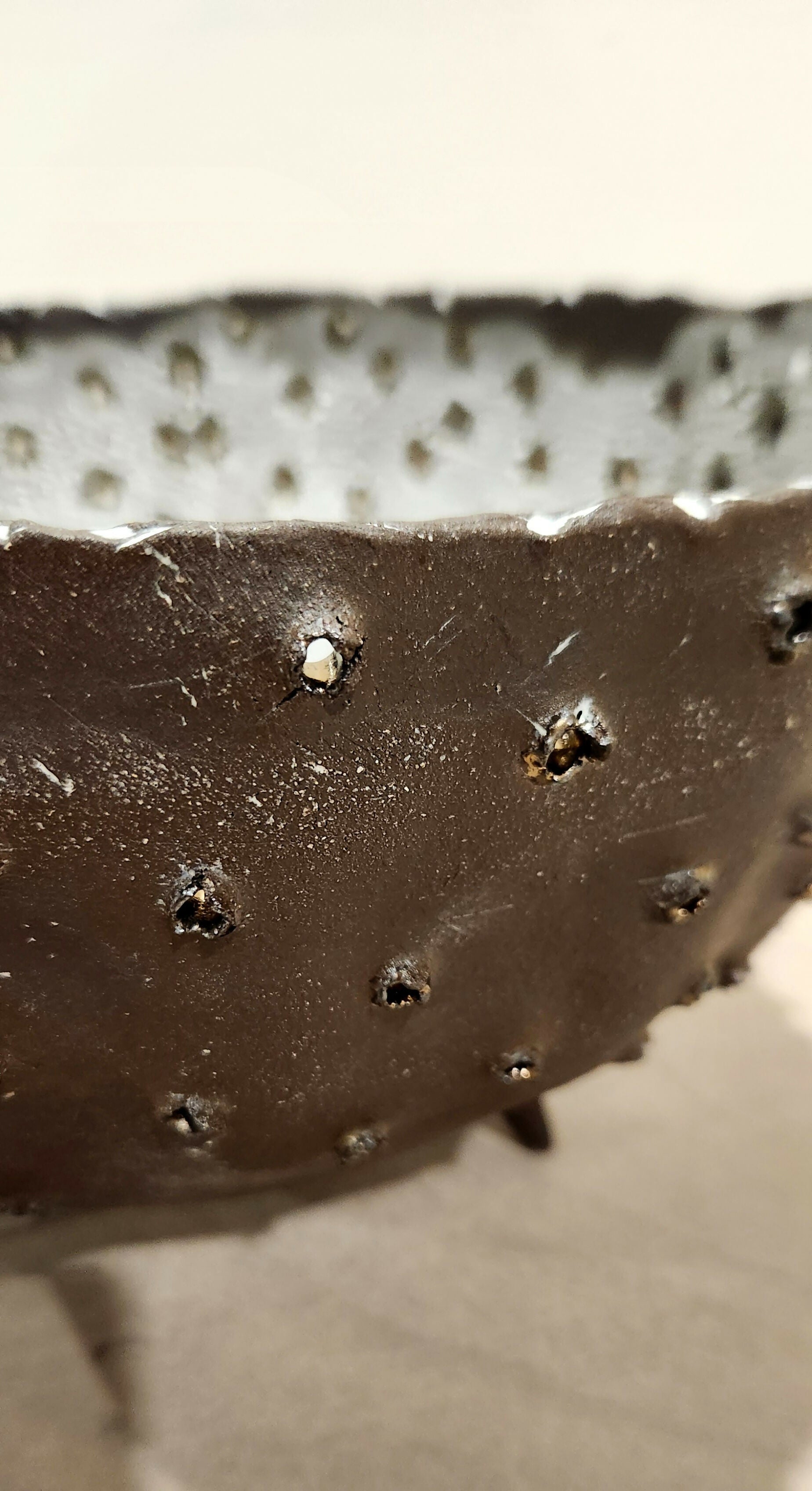 This large sculptural, yet functional piece, has been made using a delicious chocolatey black clay, high fired in a gas burner kiln. The bowl features the raw organic clay itself on the exterior, whilst the interior has been poured with a glossy beaded glaze. It's surface has small holes punctured through to give it a unique texture, which are lined & highlighted with a brassy glaze The vessel is food safe.