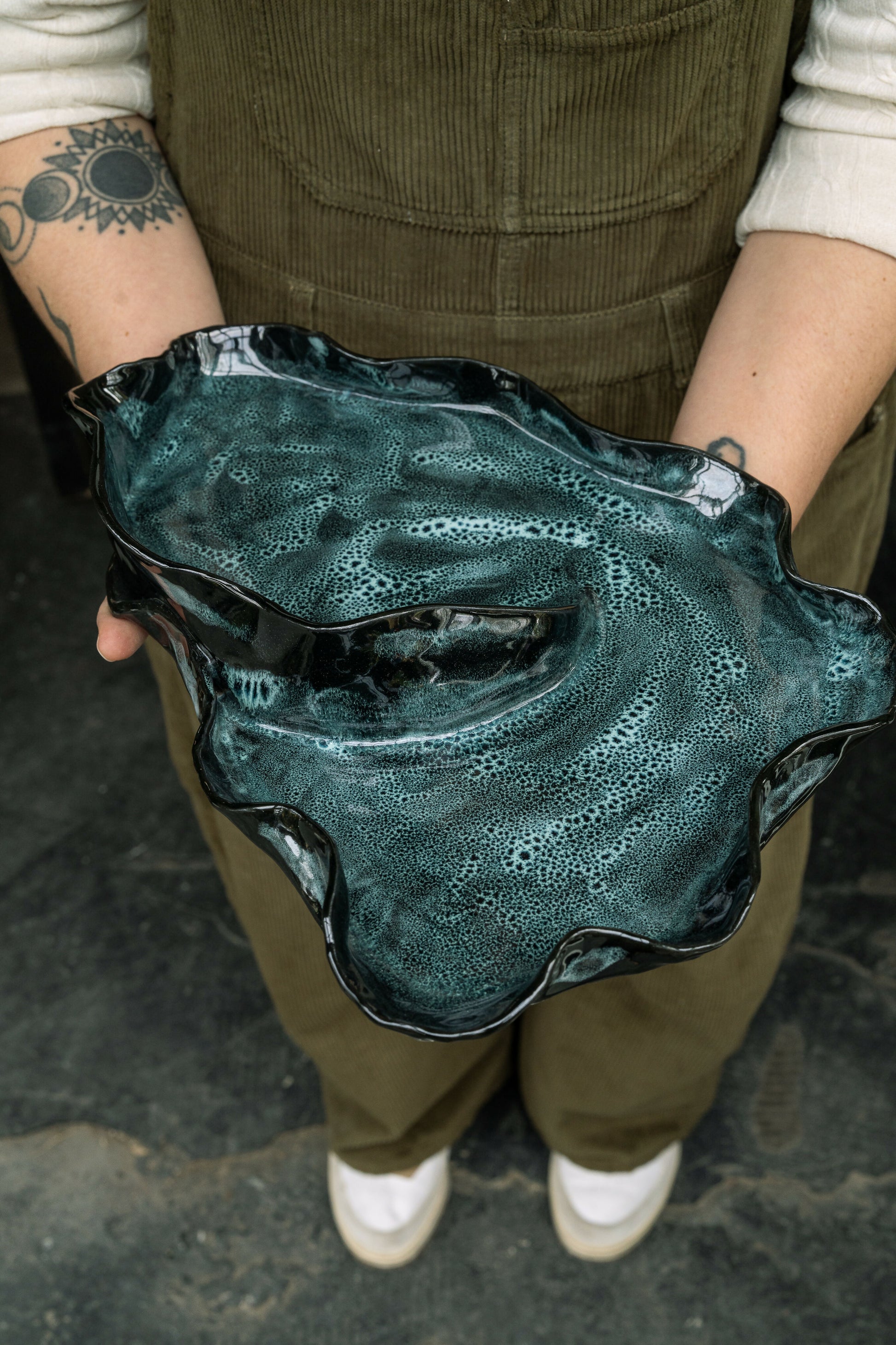 This piece is a platter, but it’s also a love letter to the ocean. Inspired by the captivating coastline of the Mornington Peninsula, it masterfully expresses the deep, unruly essence of the region's back beaches. The rich blues and teals of the glaze swirl together with the dynamic energy of ocean tides, while a subtle speckled texture evokes the mesmerizing spray inside waves as they crash against the rocks. Each organic curve is meticulously designed to create a sense of natural flow, bringing the dramatic beauty and serenity of the sea directly to your table.