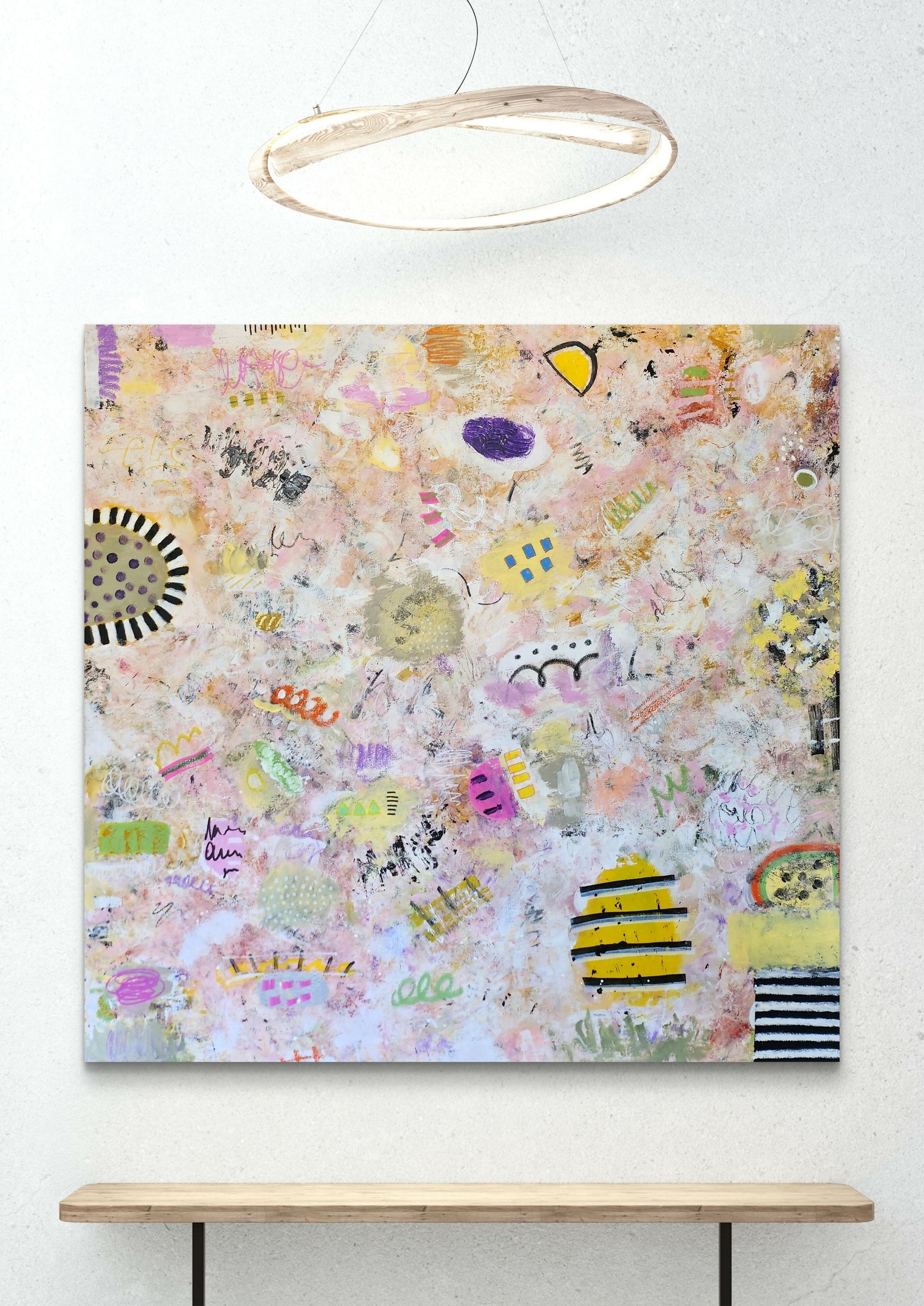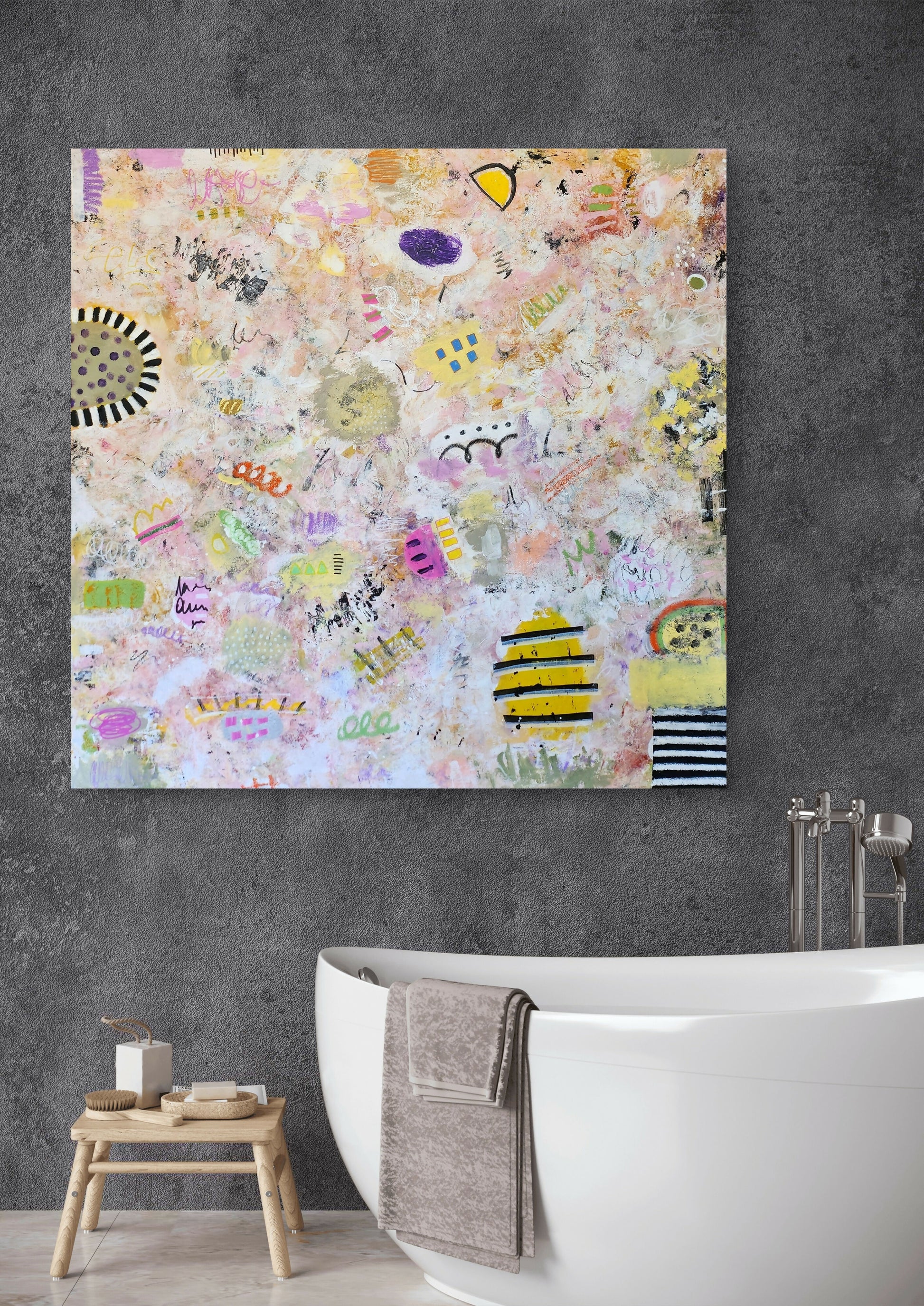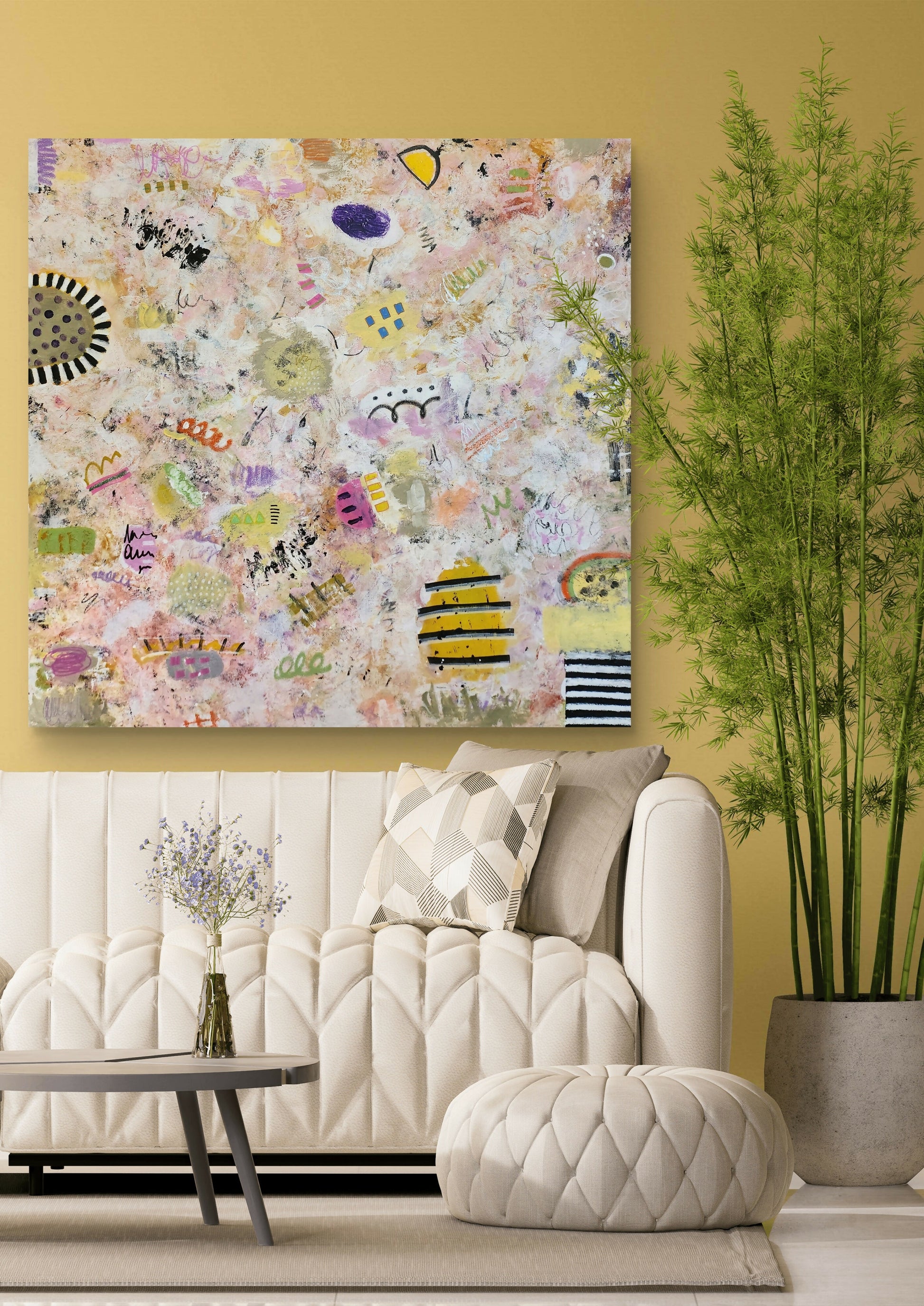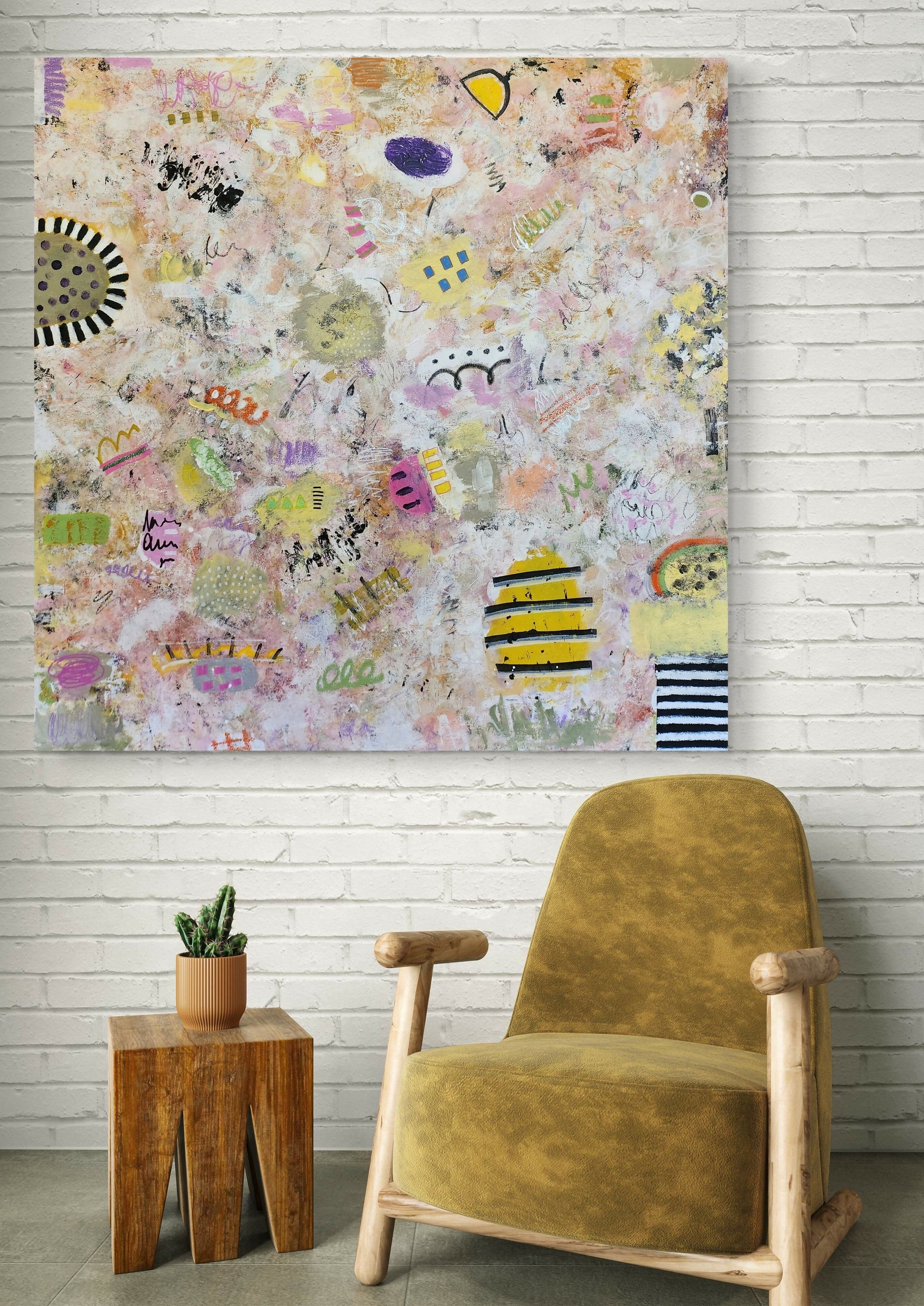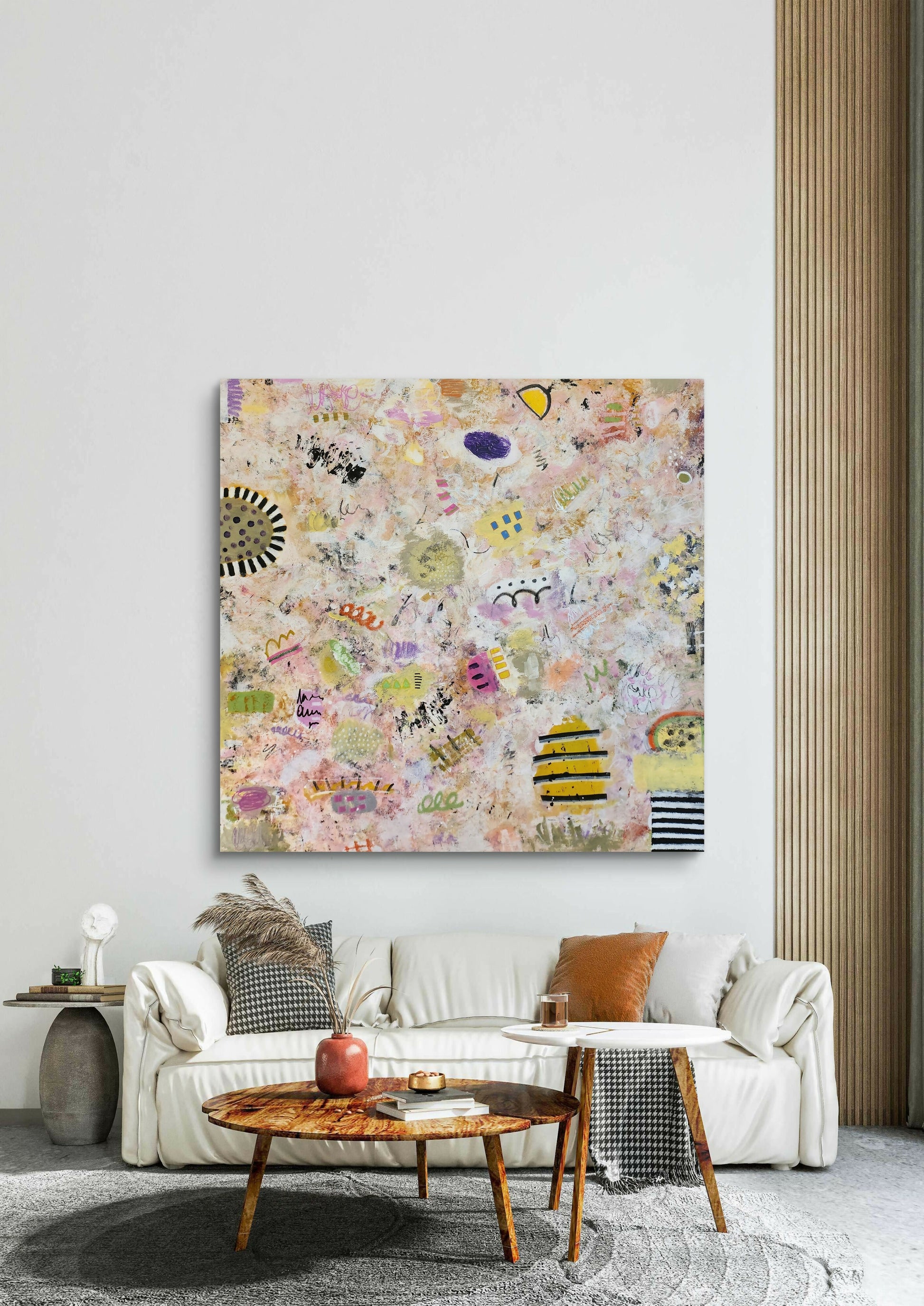 This abstract painting is full of playful shapes, soft colours and lively marks. The gentle background makes the bright details stand out, inviting the eye to move around and discover new things each time you look. It feels light, joyful, and open for everyone to see their own story inside it.