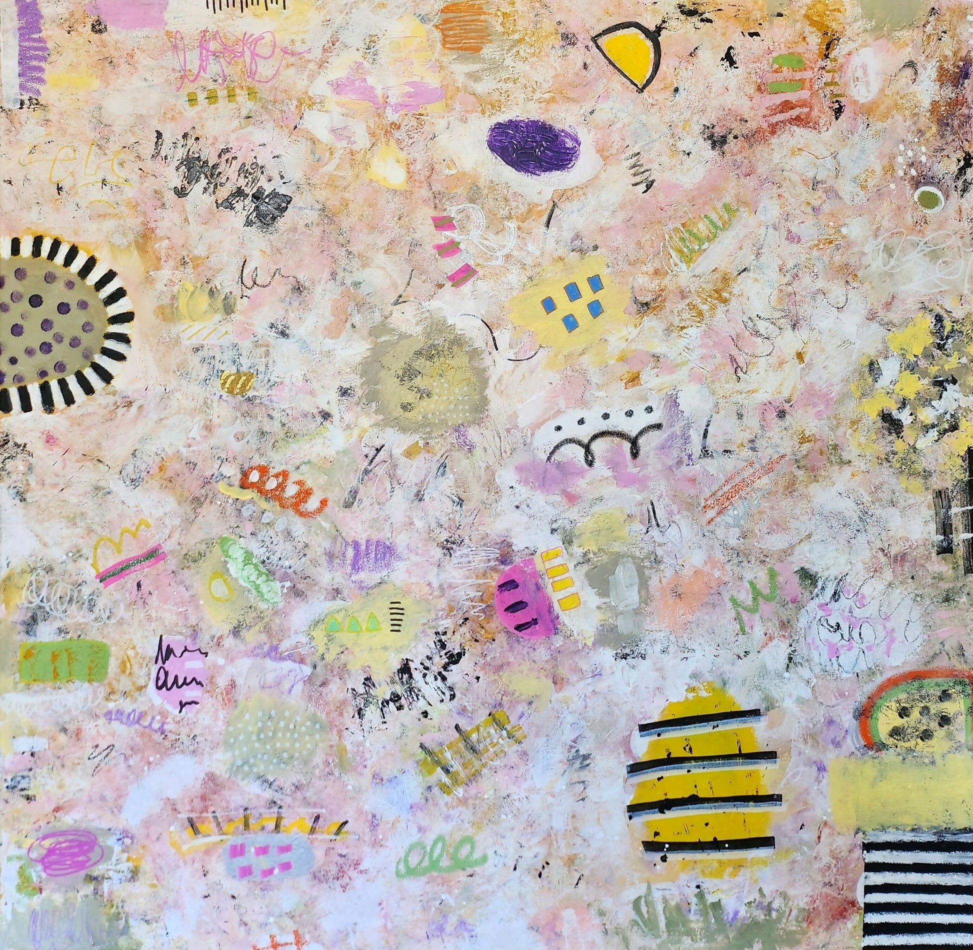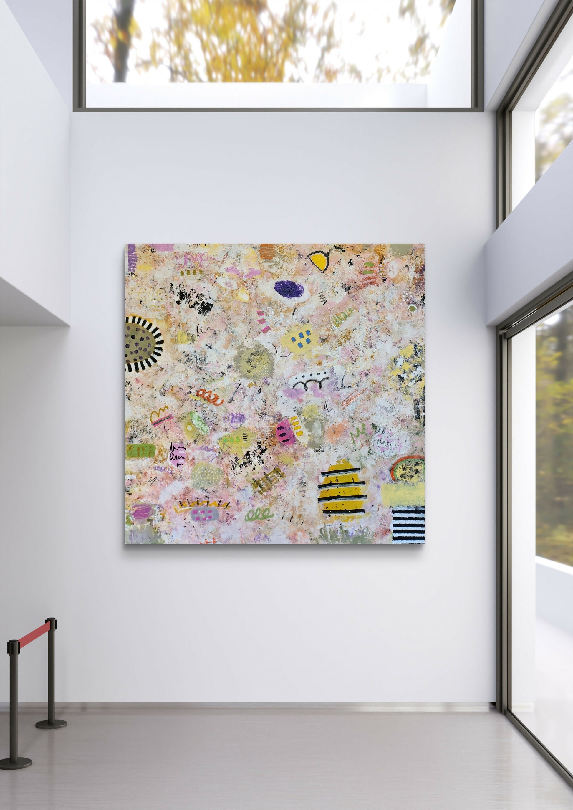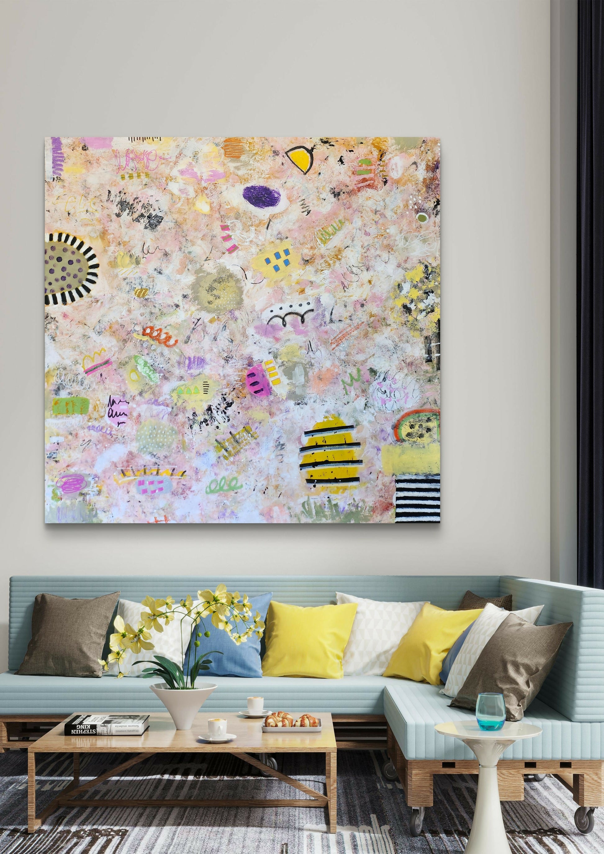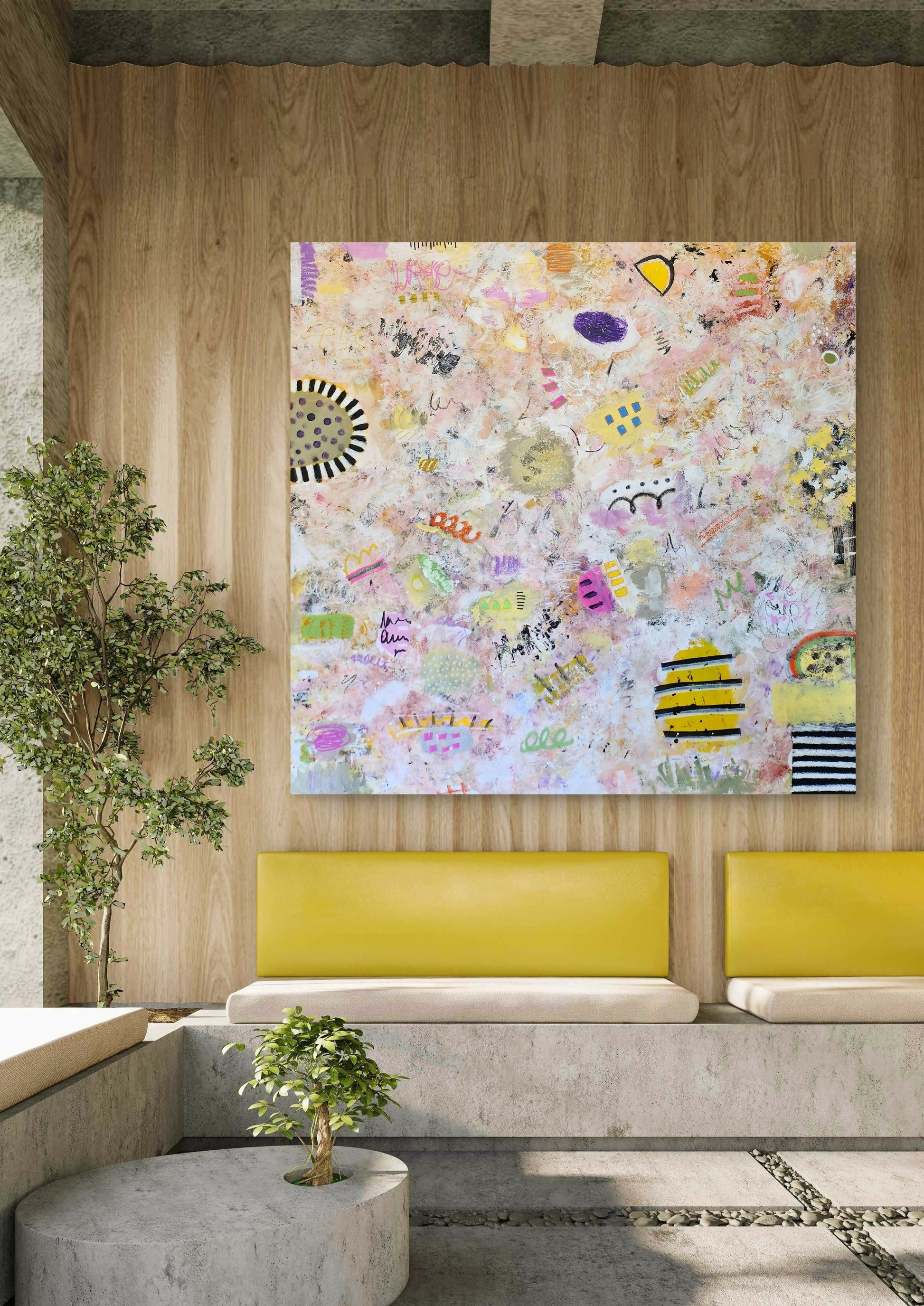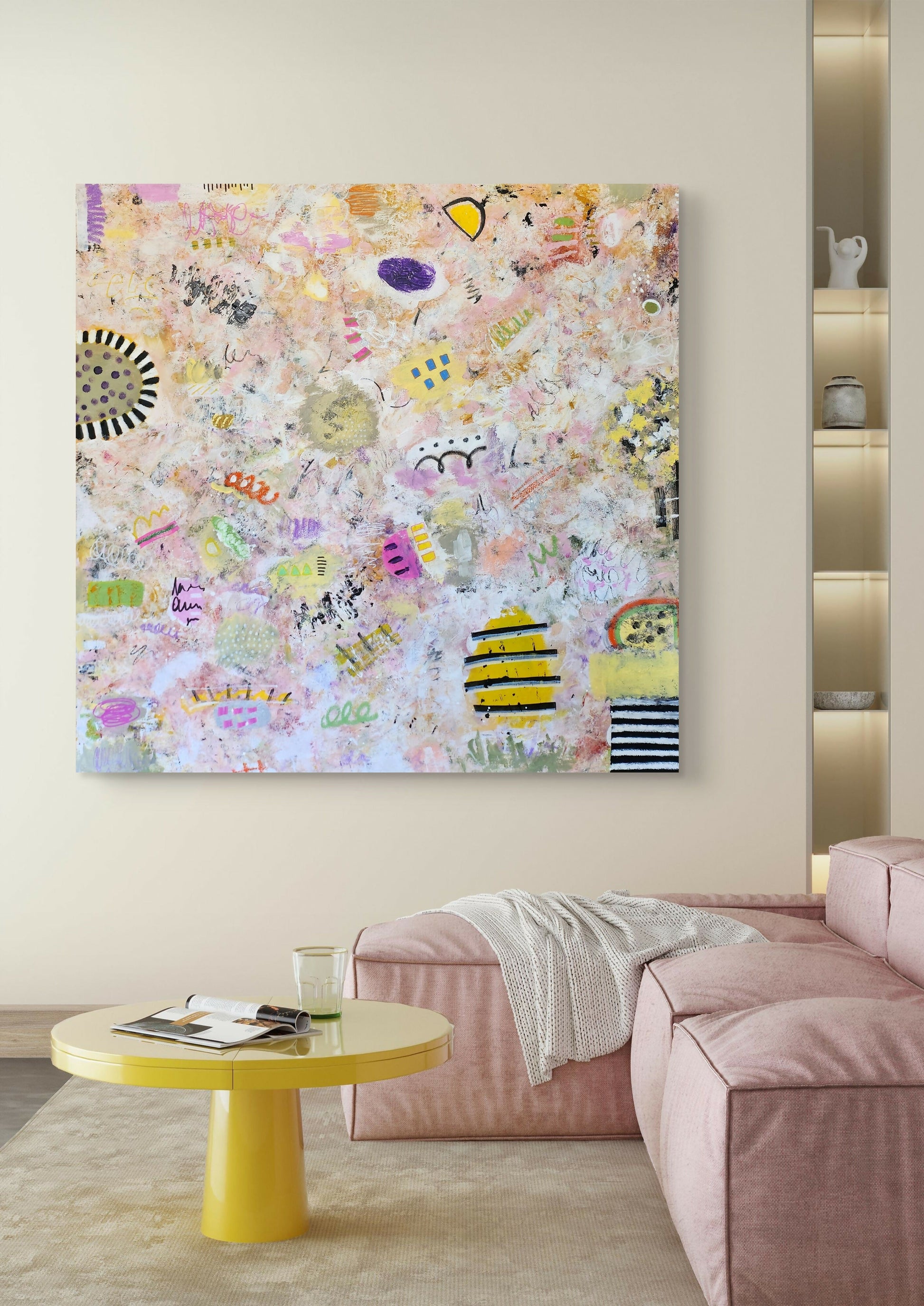 This abstract painting is full of playful shapes, soft colours and lively marks. The gentle background makes the bright details stand out, inviting the eye to move around and discover new things each time you look. It feels light, joyful, and open for everyone to see their own story inside it.