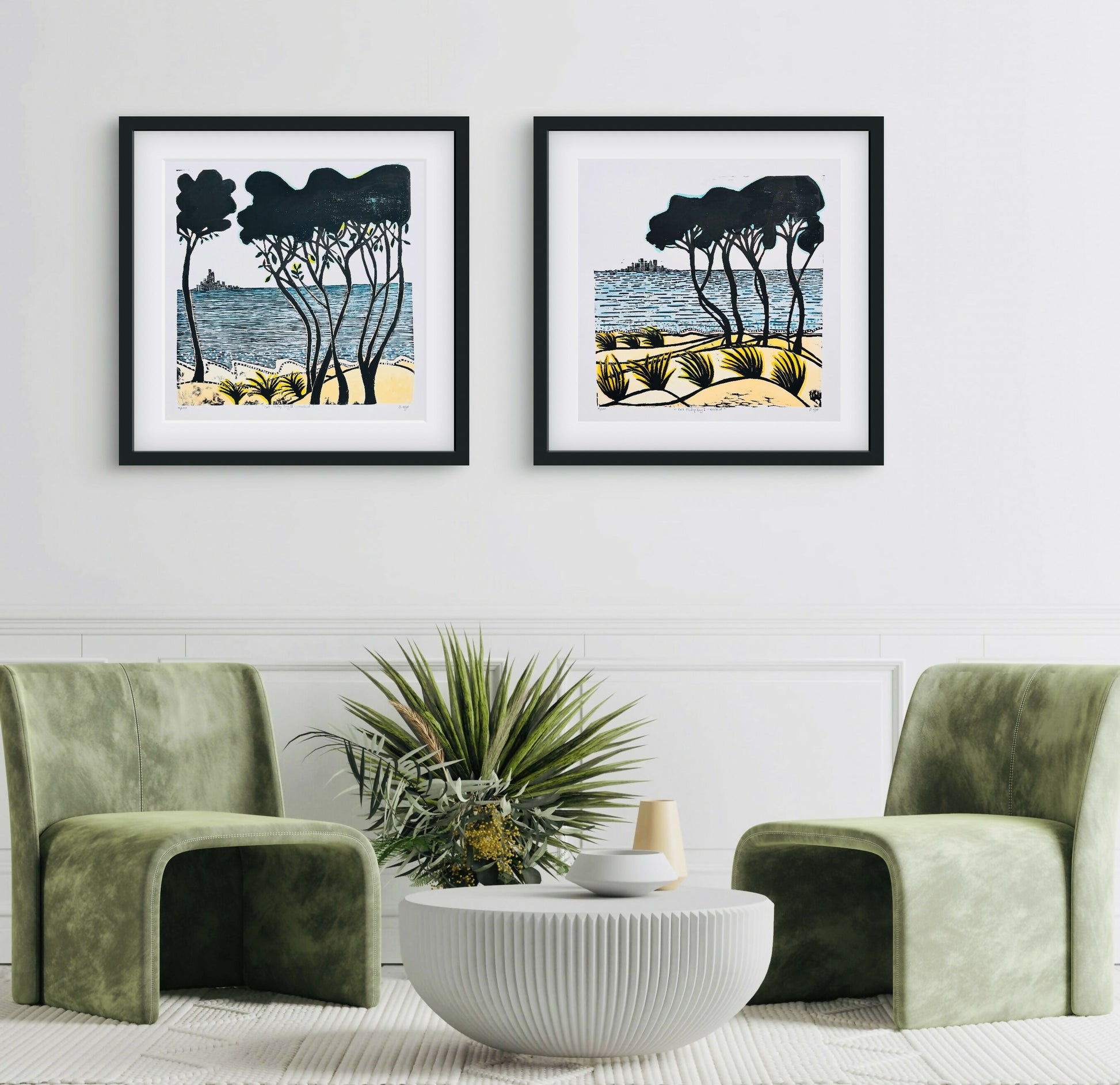 In these prints, I’ve tried to capture not just the coastline, but the feeling of the Mornington Peninsula—the trees standing guard over beaches, the wind moving through scrub, the vast sky meeting the water. It’s a landscape etched into memory, and now, into a woodcut print.