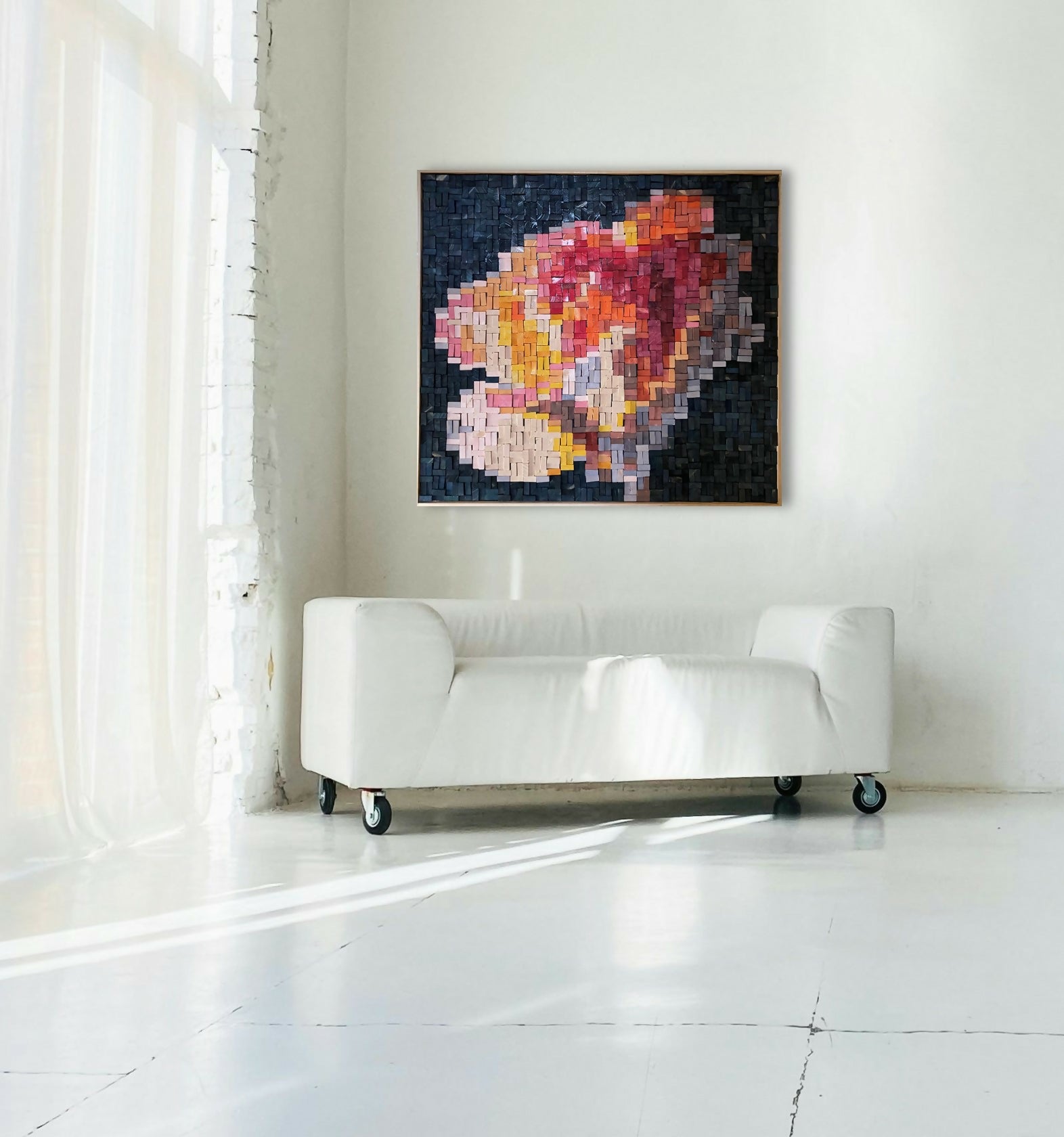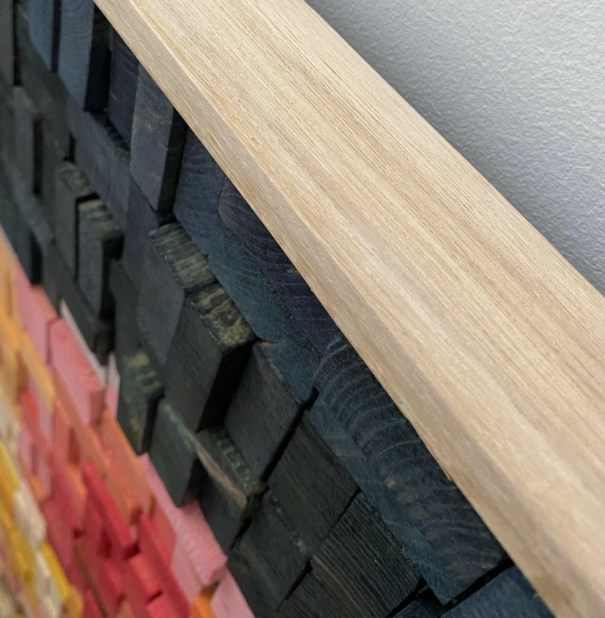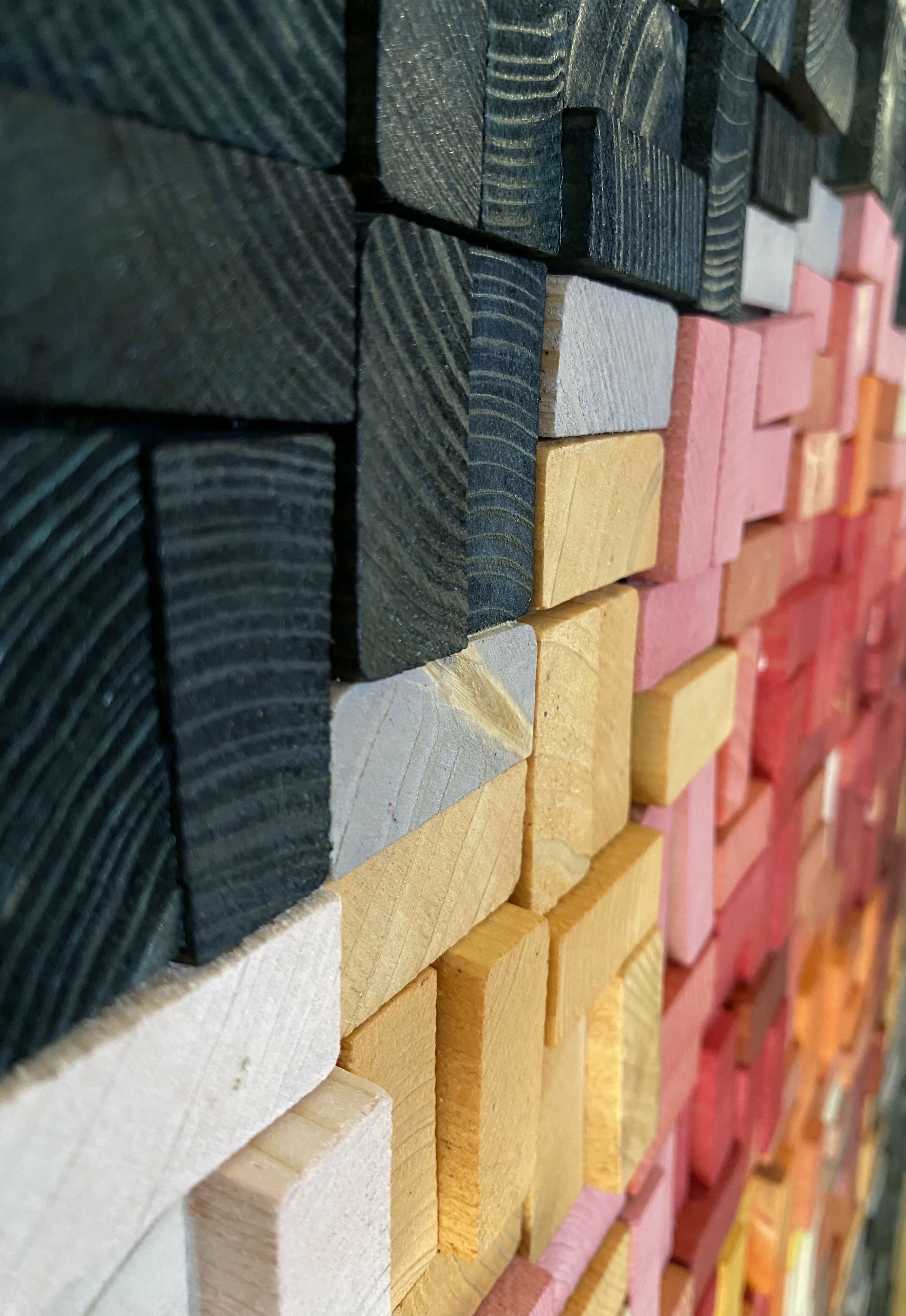 'Rosa' is an abstract of a rose made up of approx. 900 40x20mm, stained, varnished wood blocks of varying depths. It's been framed in a varnished 42mm x 12mm natural hardwood floating frame.