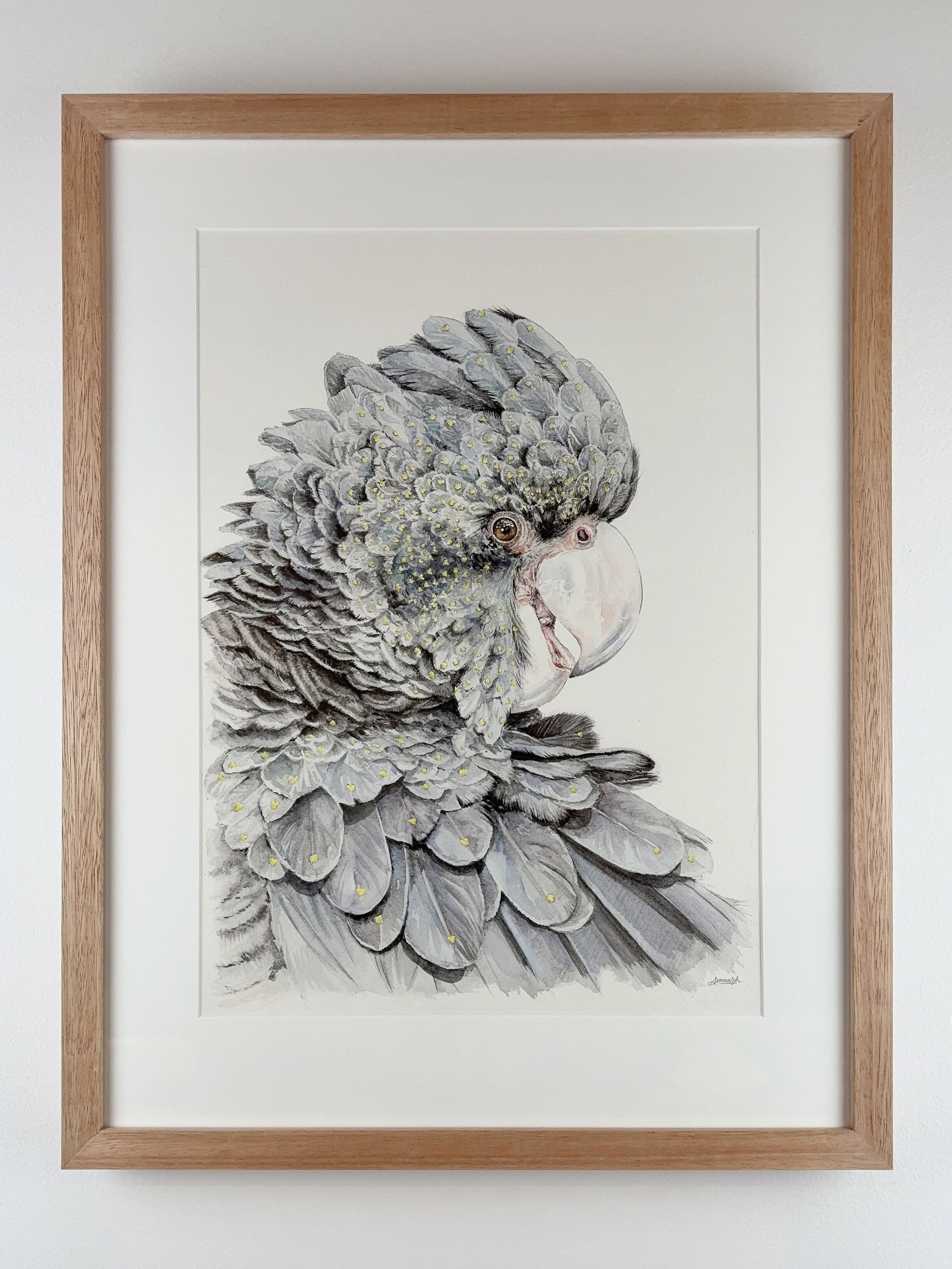 Framed in natural flooded gum timber with white mat board.