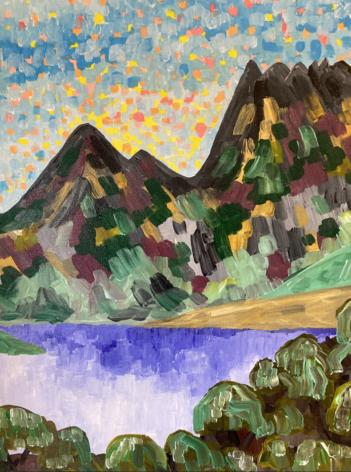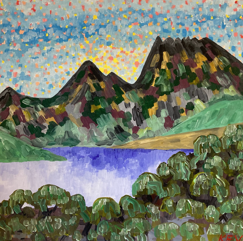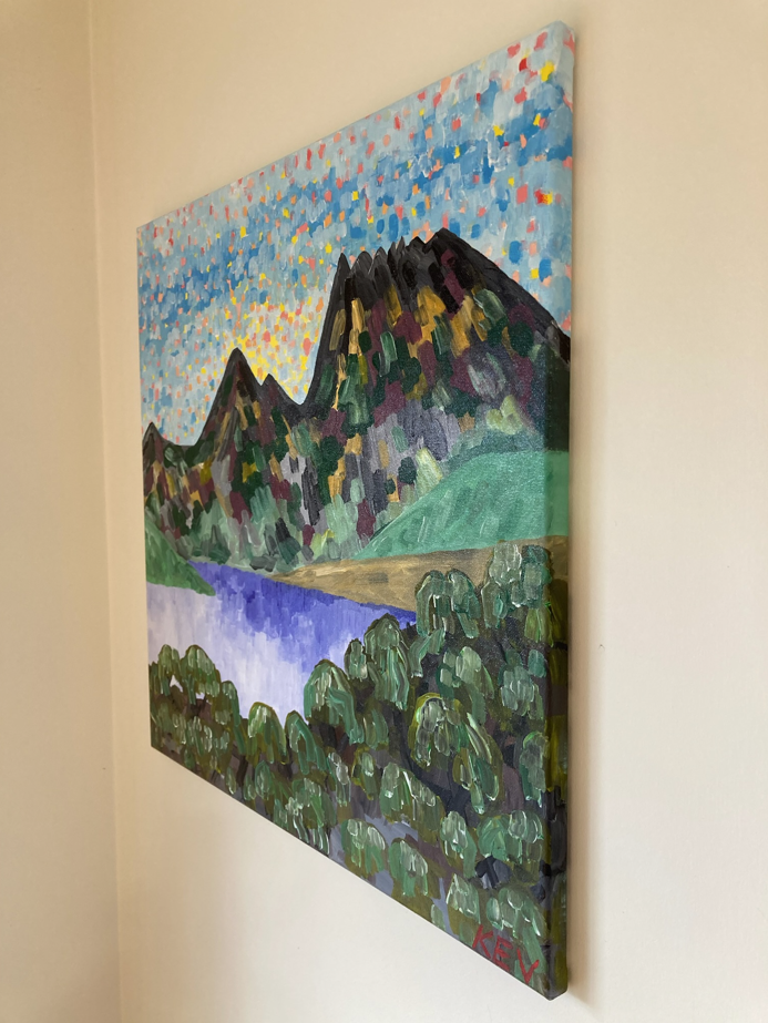 Description: Beautiful and vibrant, this painting captures the ruggedness of Cradle Mountain, with the tranquility of the reservoir at the base range.