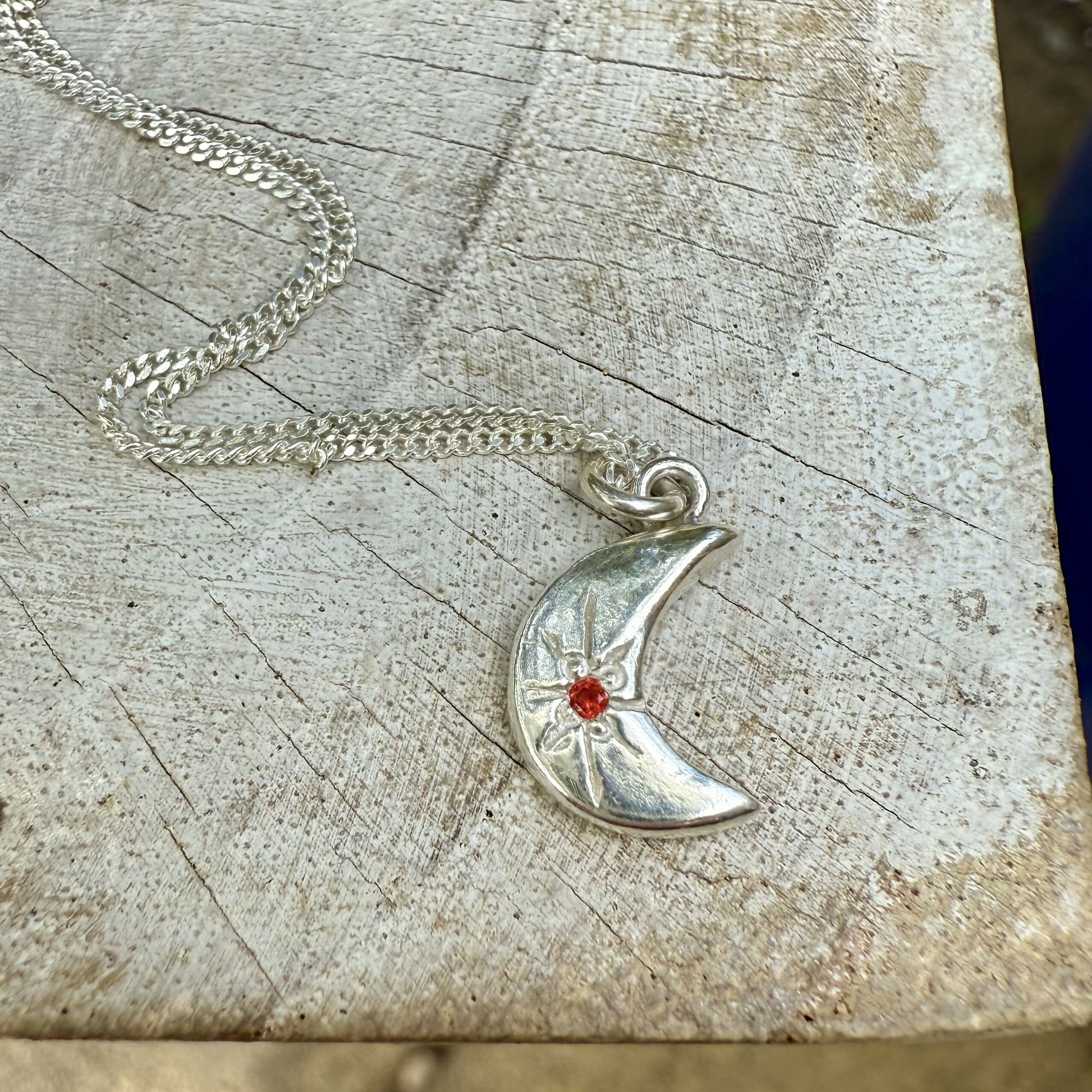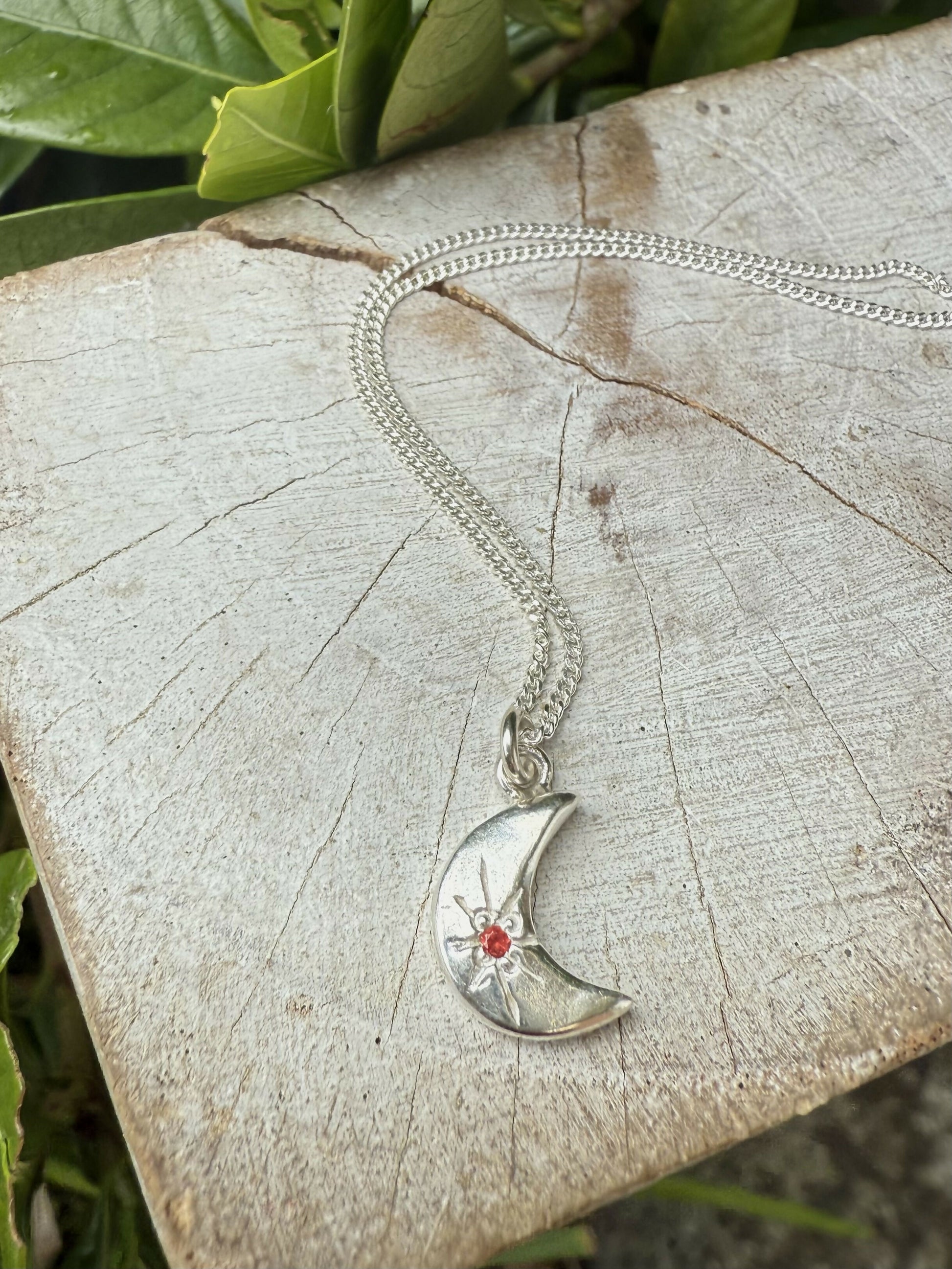 Small Silver Crescent Moon Necklace with Sapphire Star.