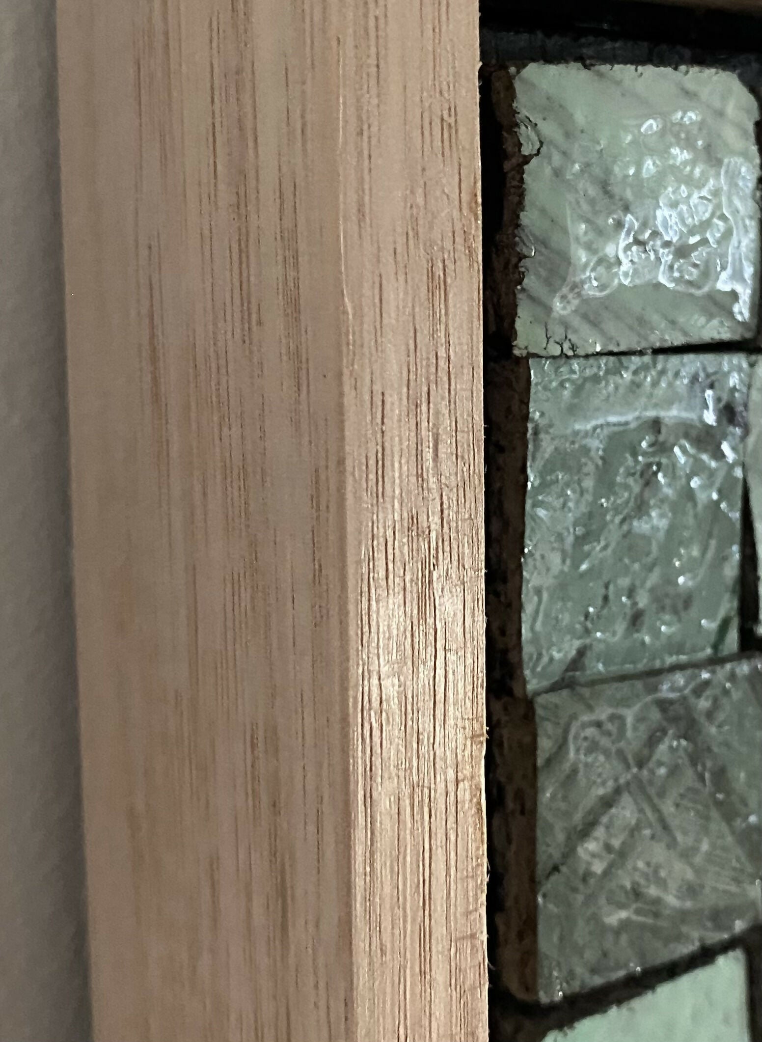 'Sixty Minutes Max is a semi-abstract image of a cassette tape, made up of approx. 2000 25x25mm, paintd, varnished polyurethane compound blocks of varying depths. It's been framed in a varnished 42mm x 12mm natural hardwood floating frame.