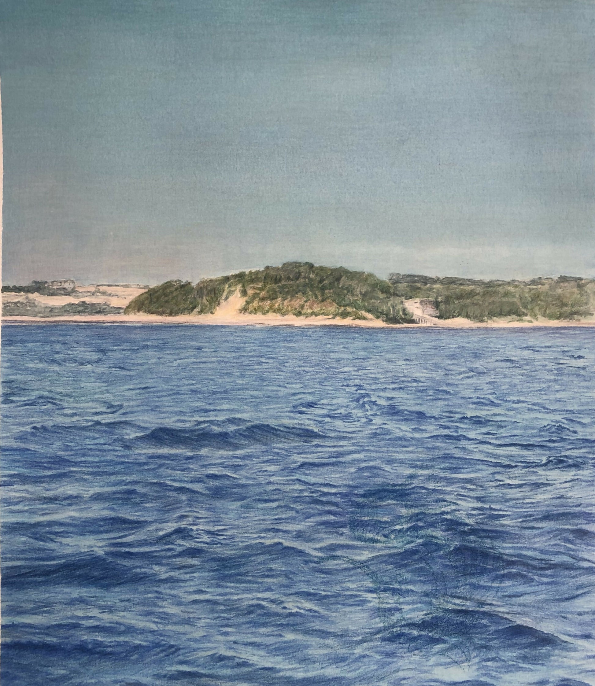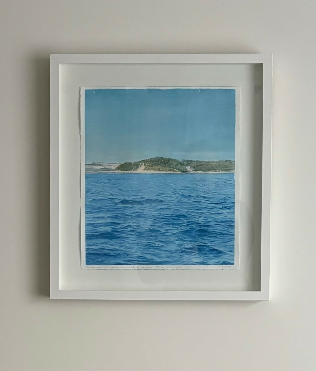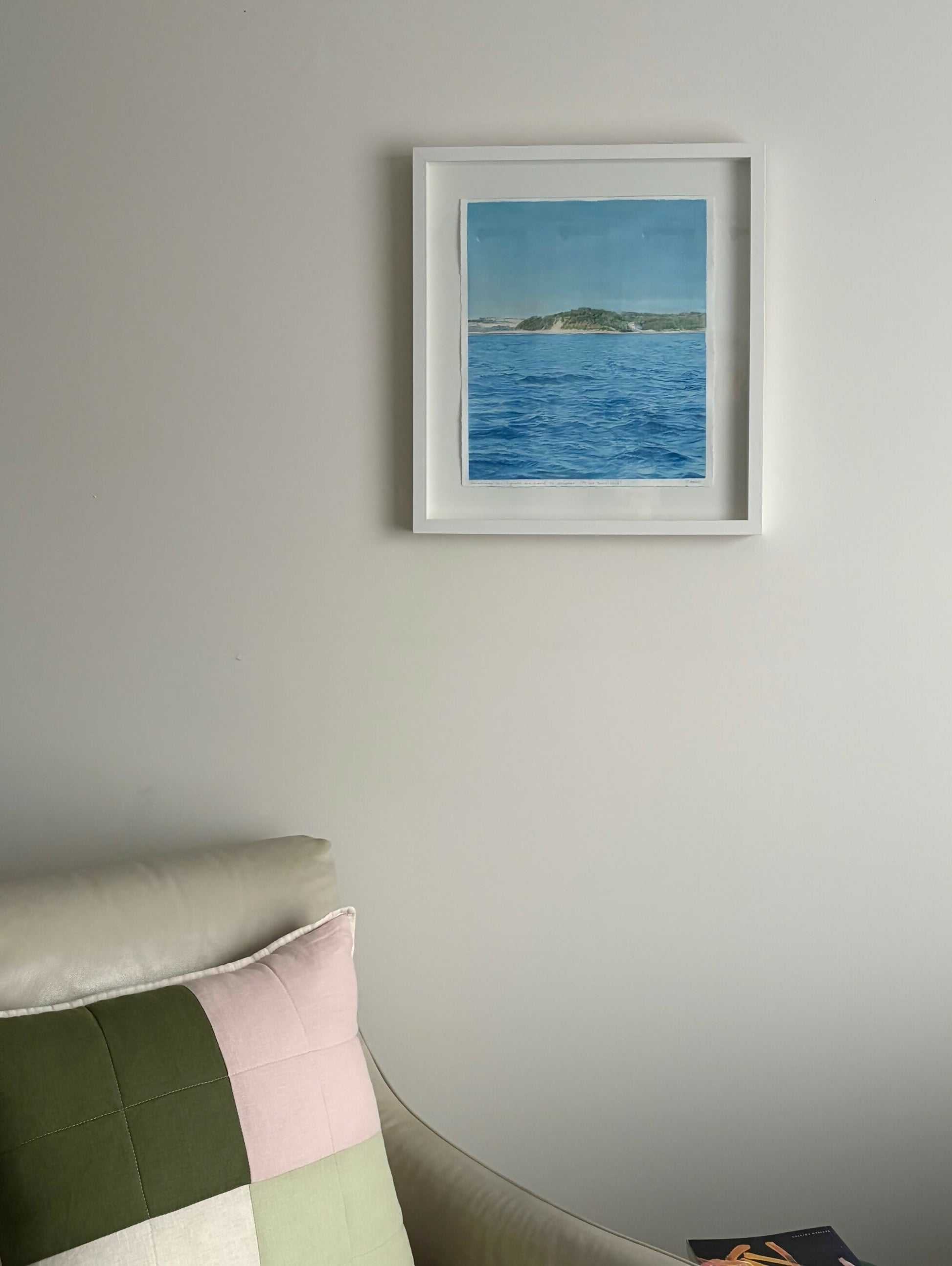 Mixed media drawing on paper using watercolour, gouache, colour pencil, ink and woodcut print. Float mounted in a white frame using archival techniques behind art glass.