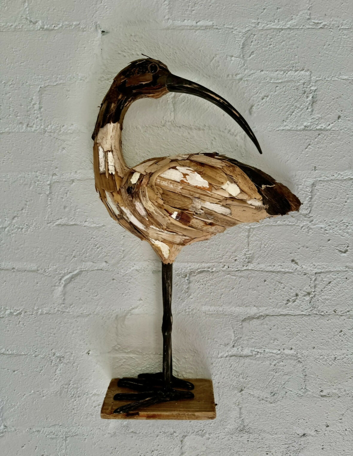 A wall hung sculpture of an Australian White Ibis created from driftwood.