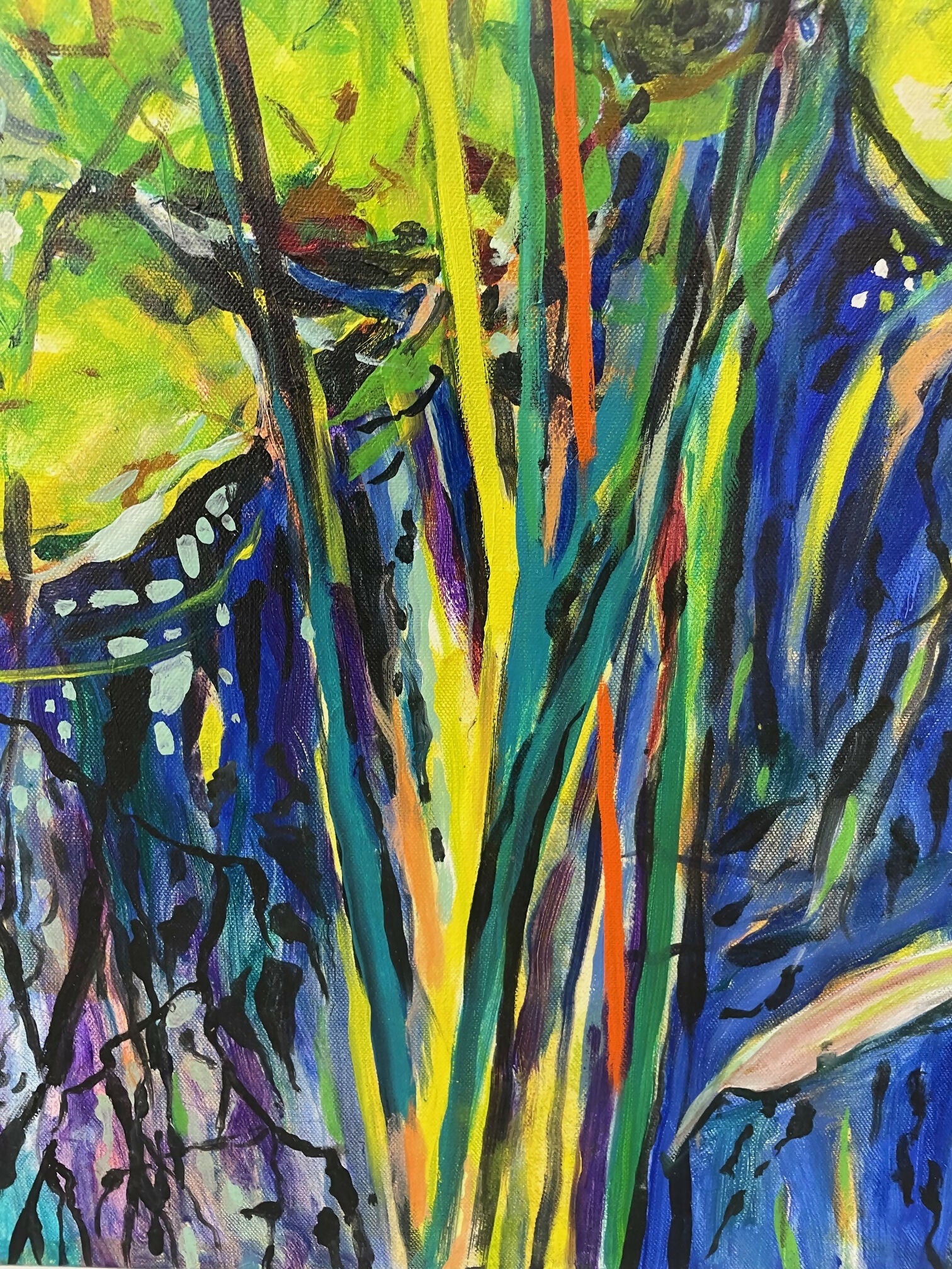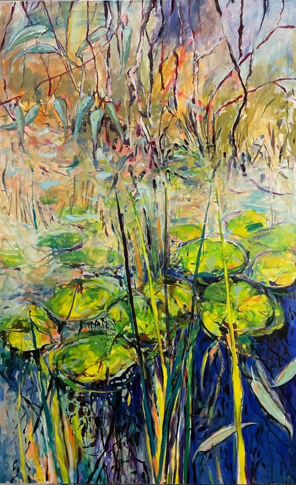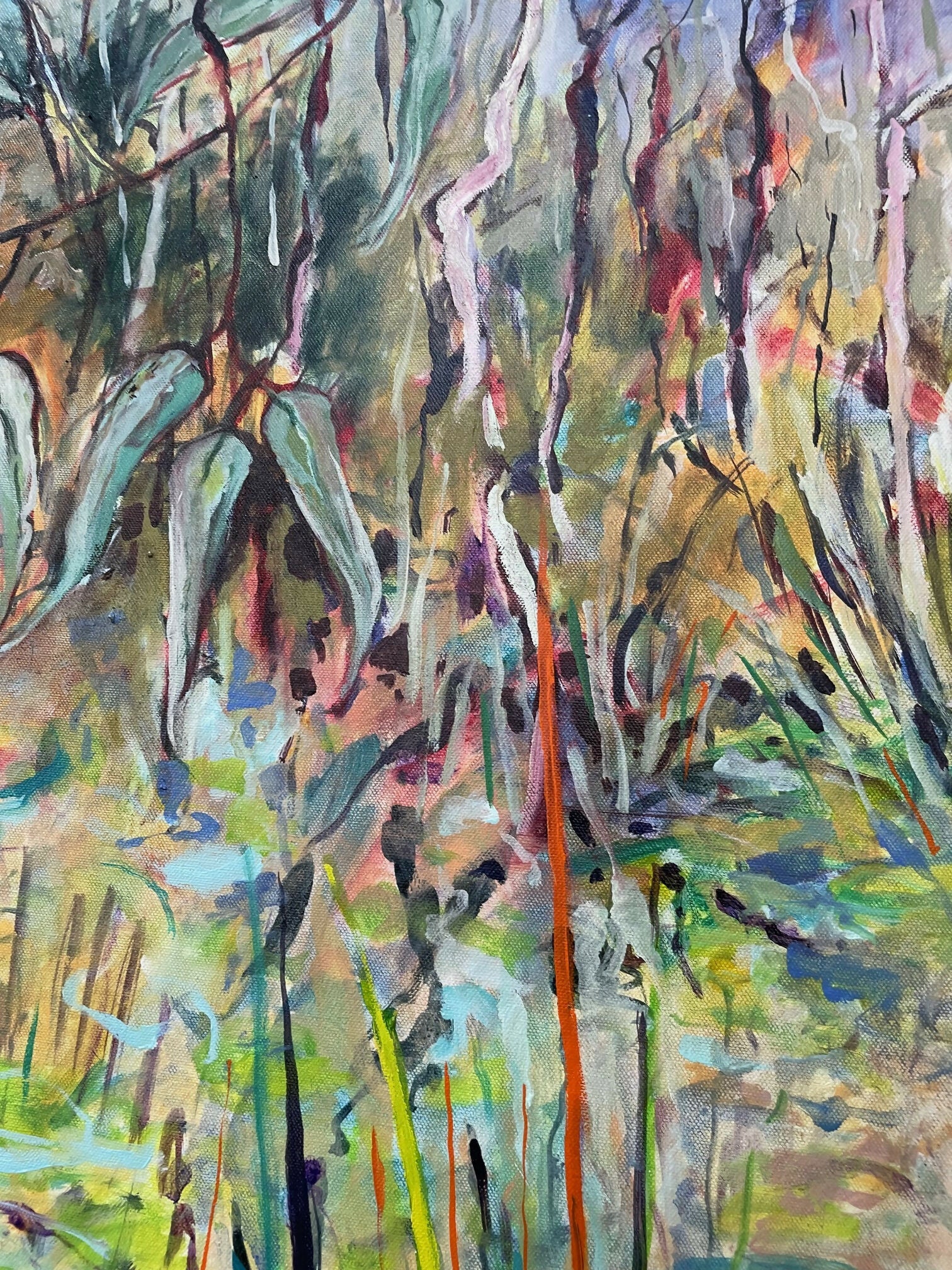 This painting is based on a fresh water pool where the opportunity is afforded to play with the ideas of light, reflections, transparency and the texture of the grasses and bush undergrowth in and around this wetland.