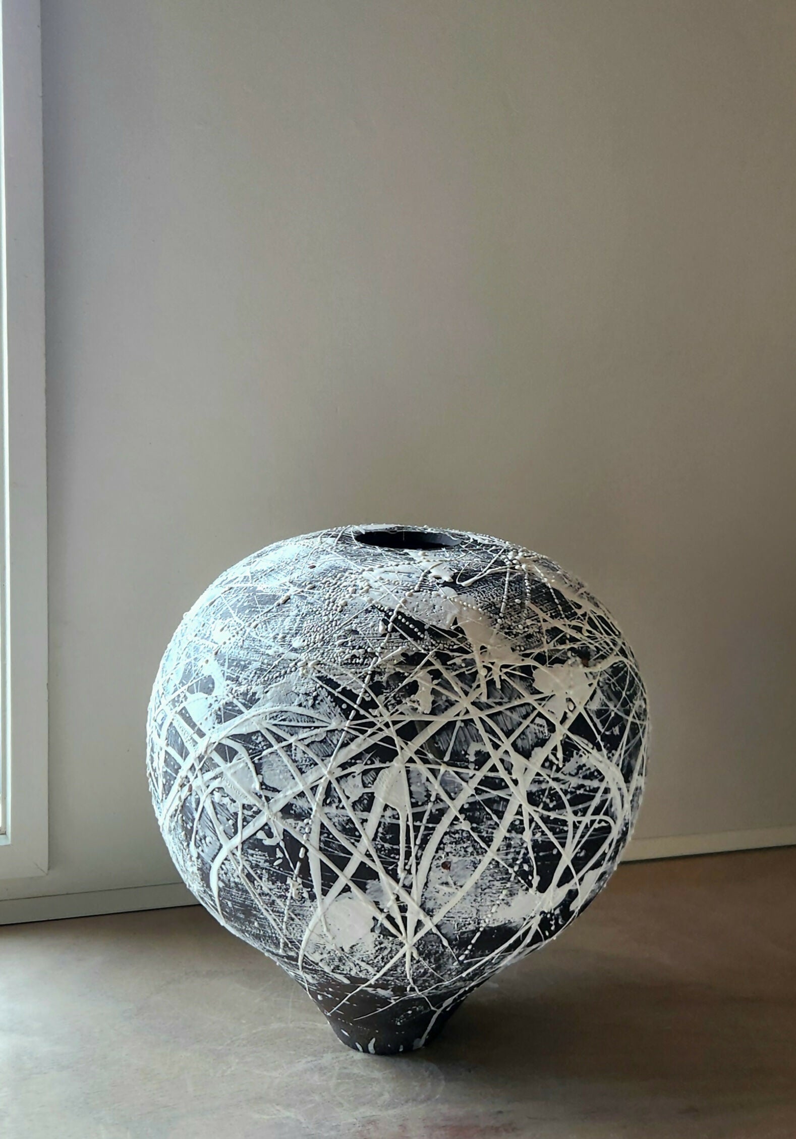 This large piece has been made using a brilliant chocolatey black clay, fired in a gas burner kiln. The base has been wheel thrown, then built up using hand rolled coils to expand the top half of the form. A white slip has been splashed on the form creating a surface decoration with dynamic movement, enhanced by a white glossy, globule type glaze, and a few brassy highlights.