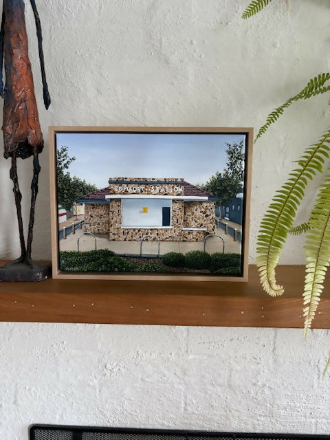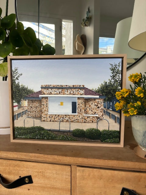 “The Comfort Station” acrylic in 40x30cm canvas with a floating natural timber frame.
