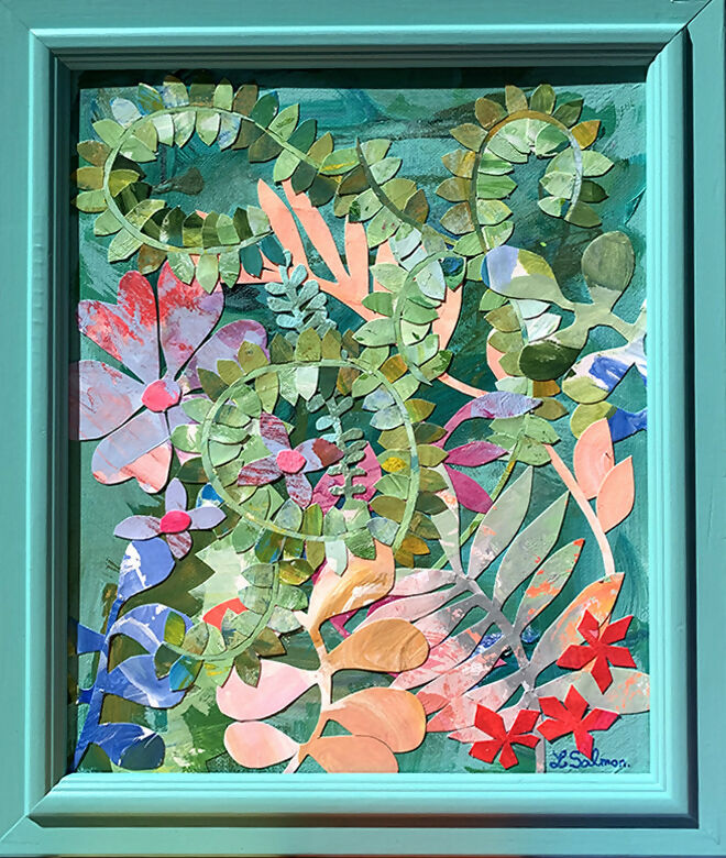 ‘The Jungle of my Heart’ is intricate and detailed, built up with layers of texture and colour. This upcycled frame make the artwork pop!