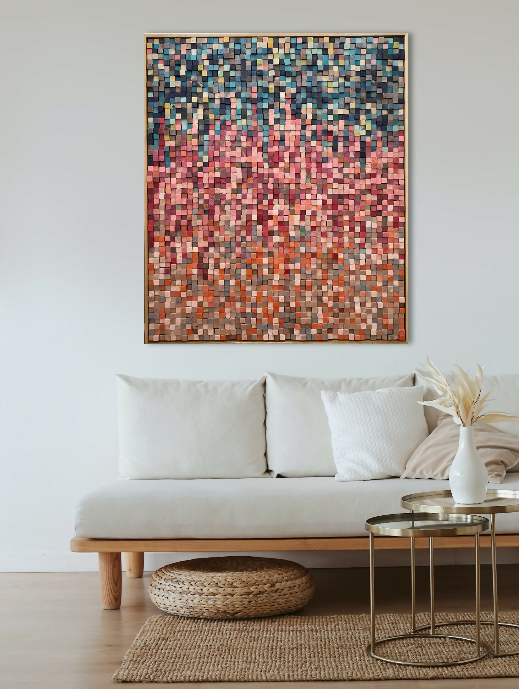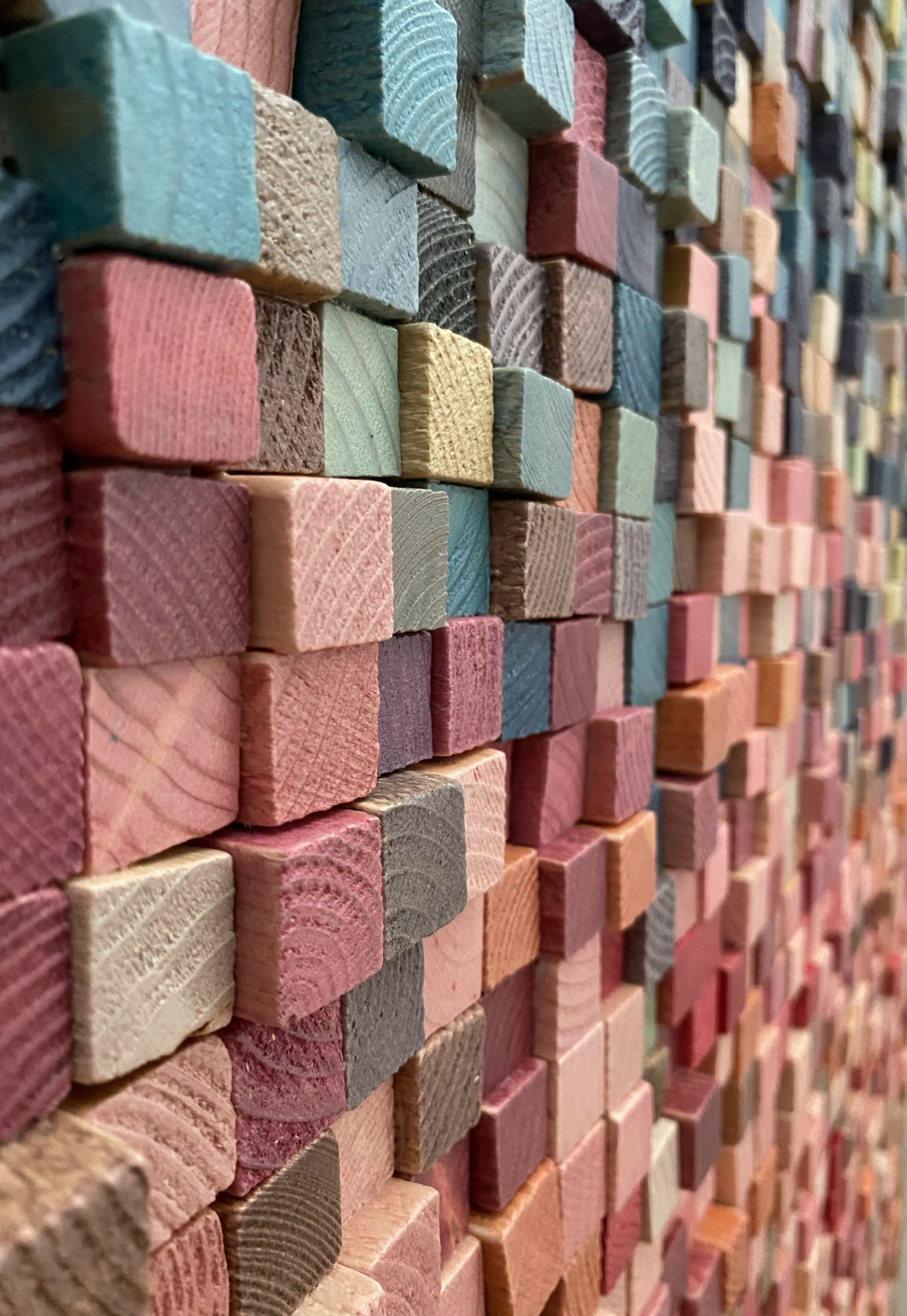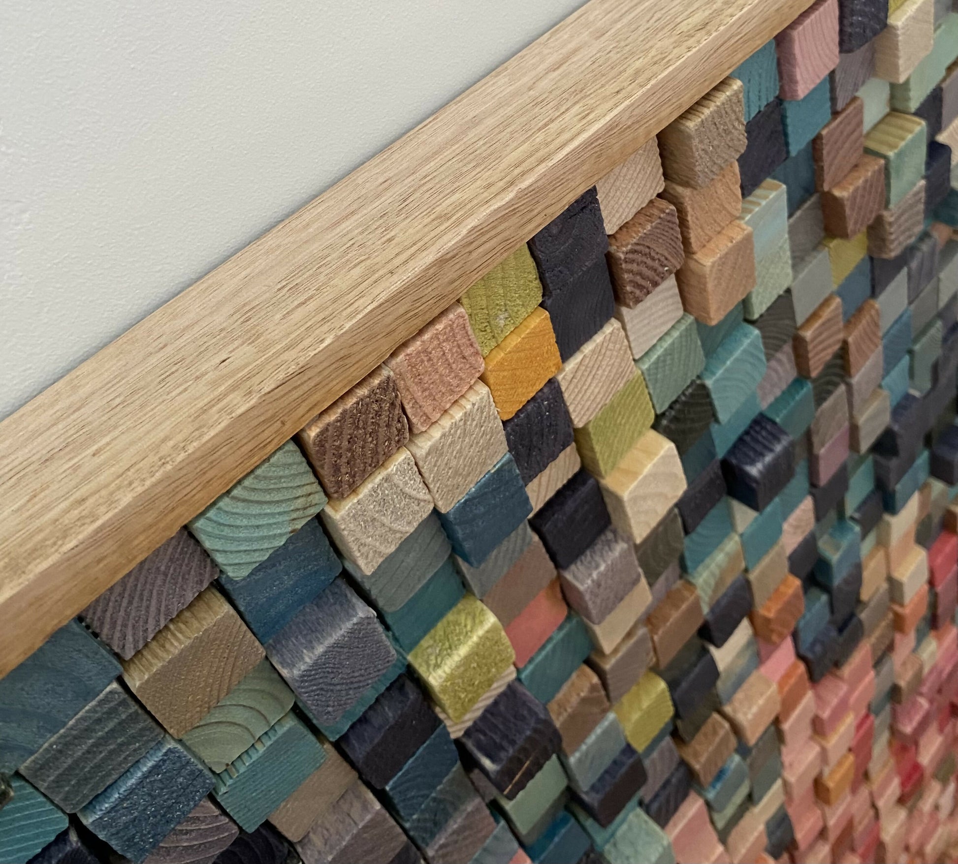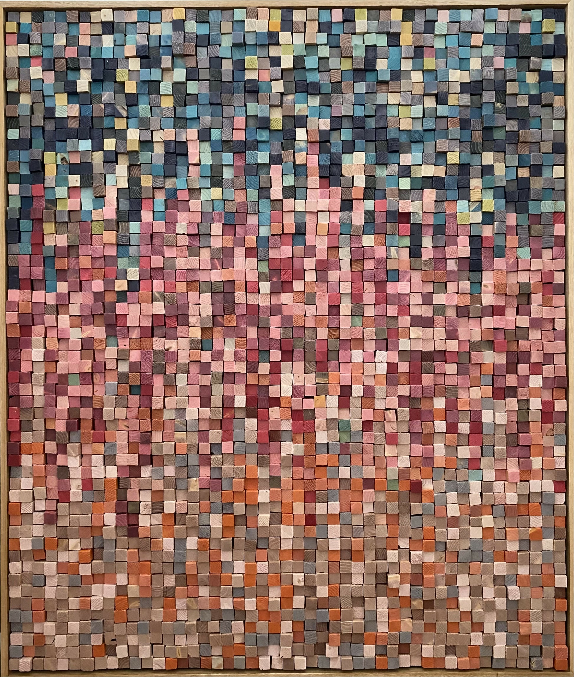 'Trickle Down' is an abstract made up of approx. 3000 20x20mm, stained, varnished wood blocks of varying depths. It's been framed in a varnished 42mm x 12mm natural hardwood floating frame.
