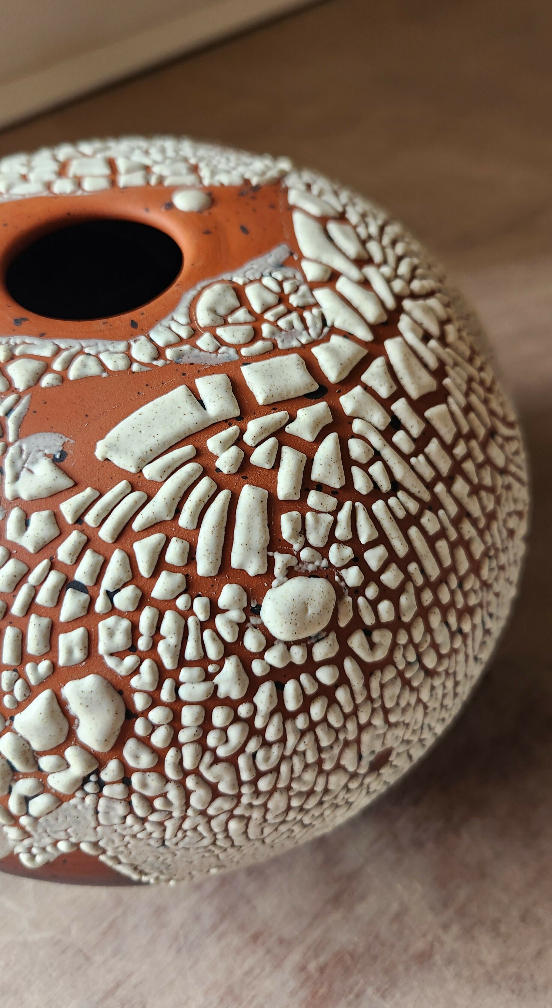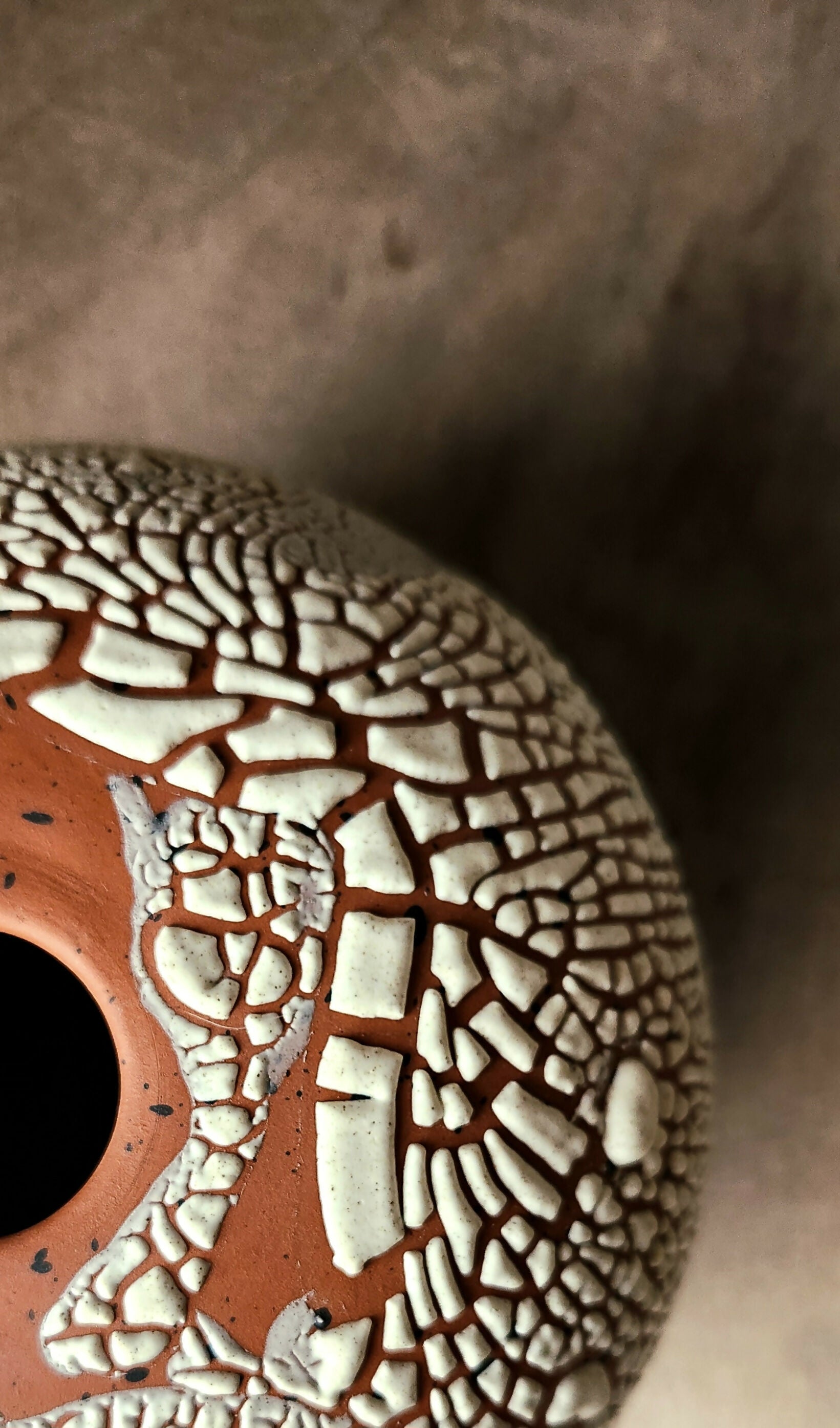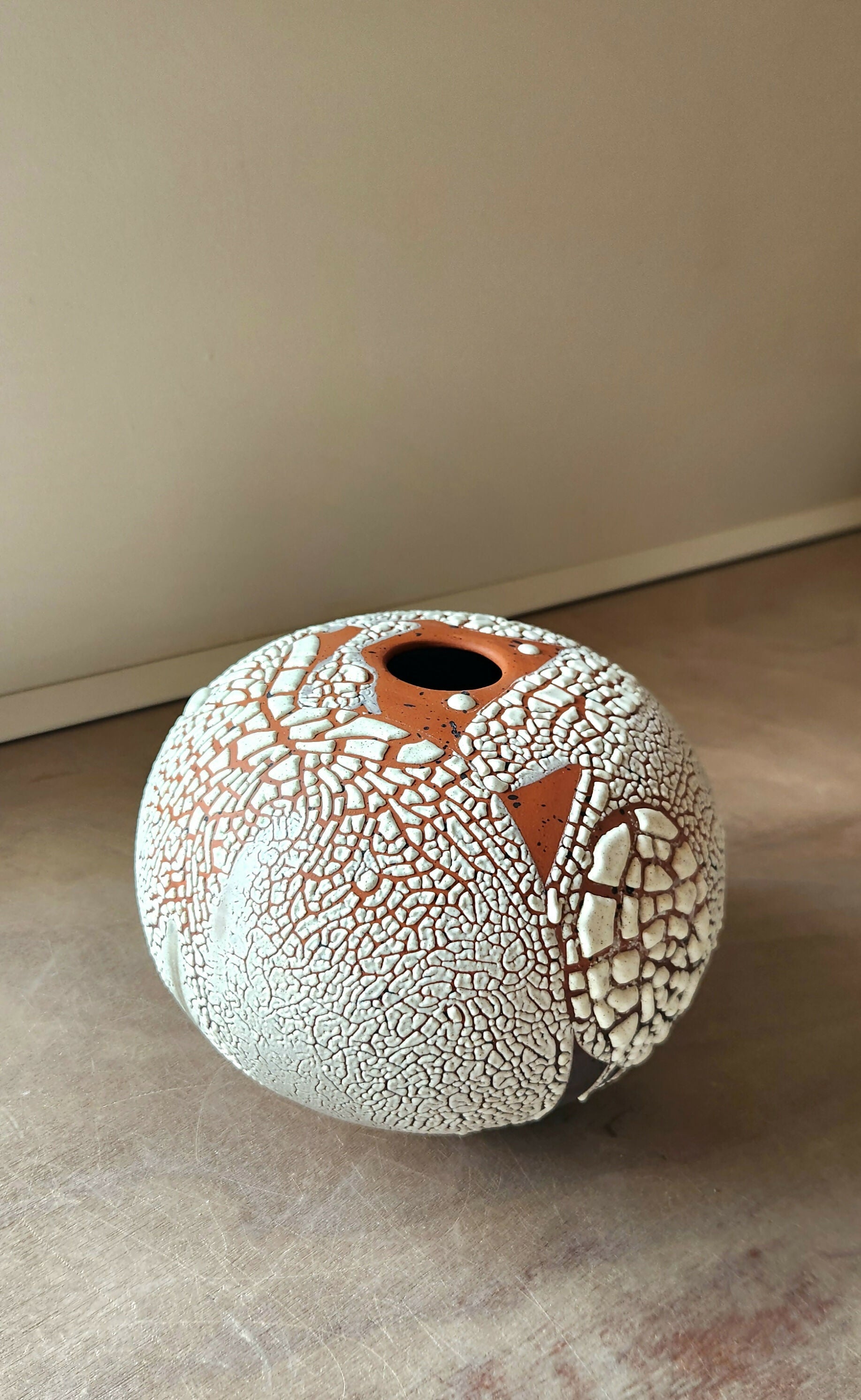 A wheel thrown form decorated with a puffy, satin crawling glaze.