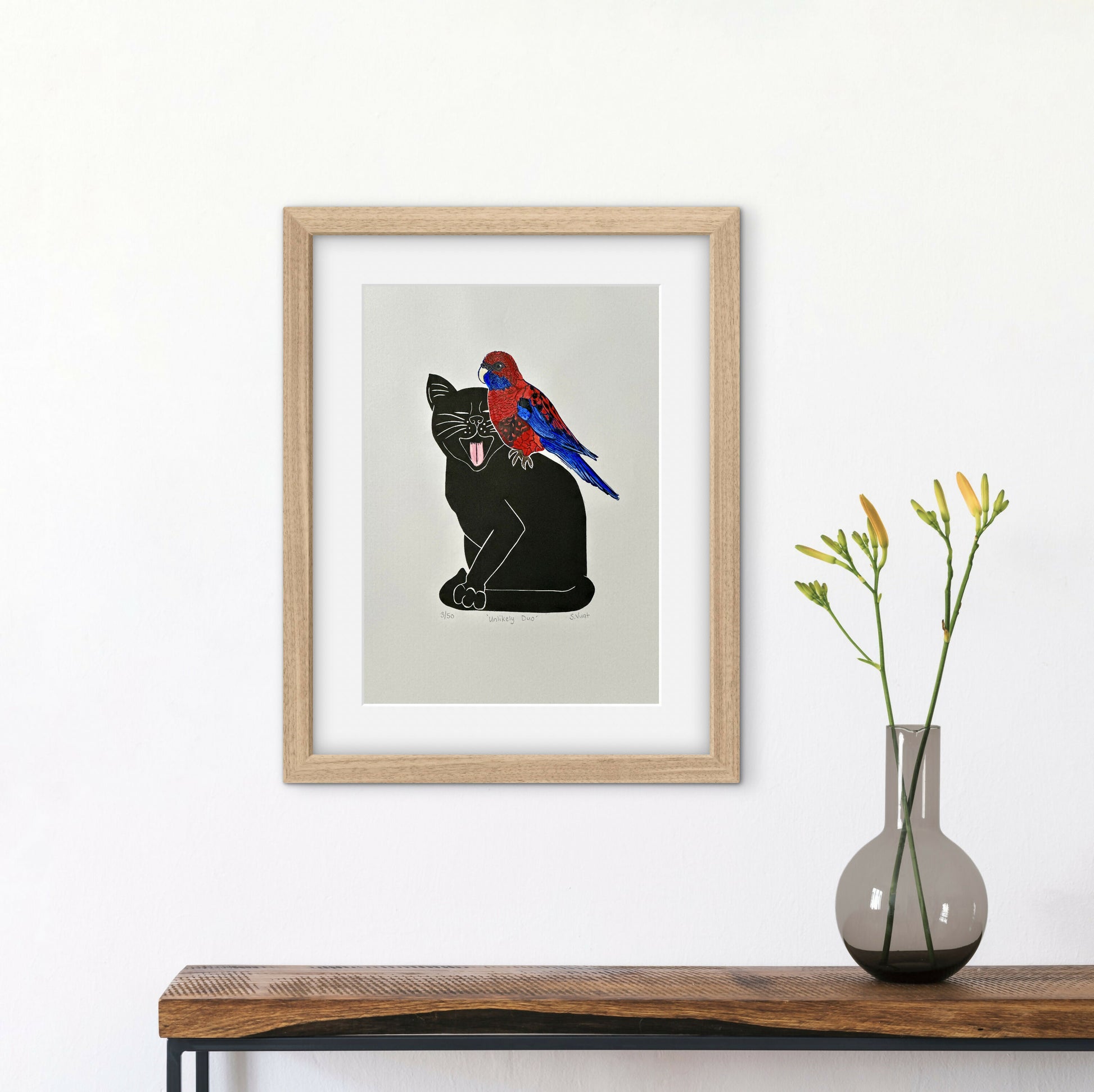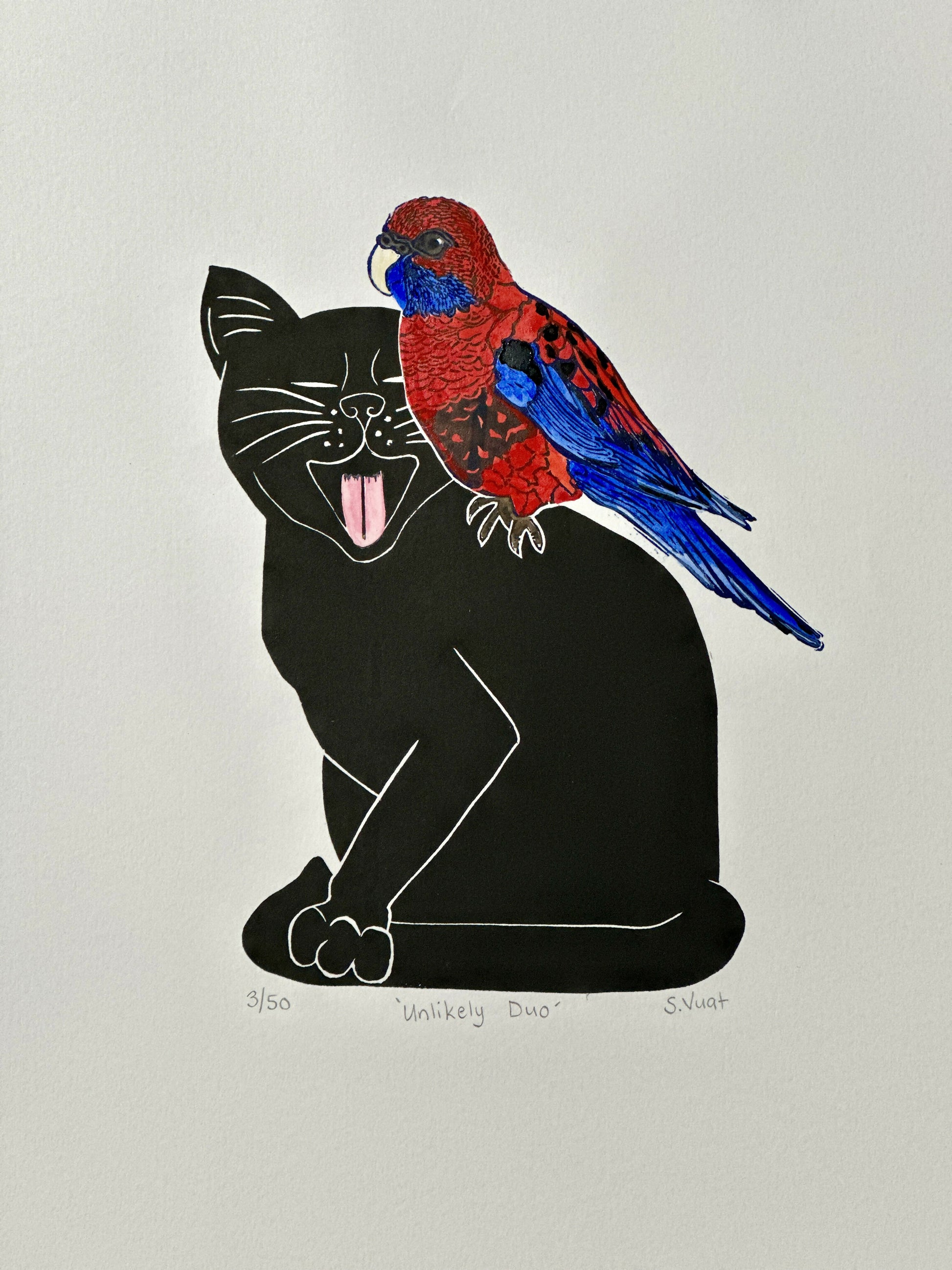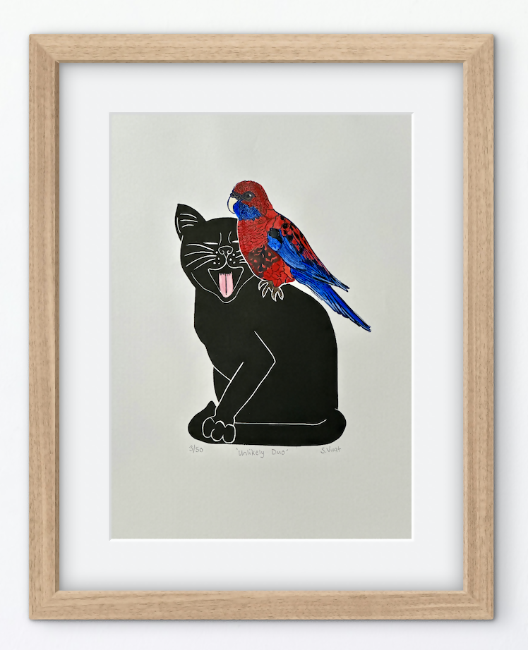 This work is a handcarved 'jigsaw' style lino cut print. It is made from two lino cuts rolled with different coloured inks, that fit together seamlessly.