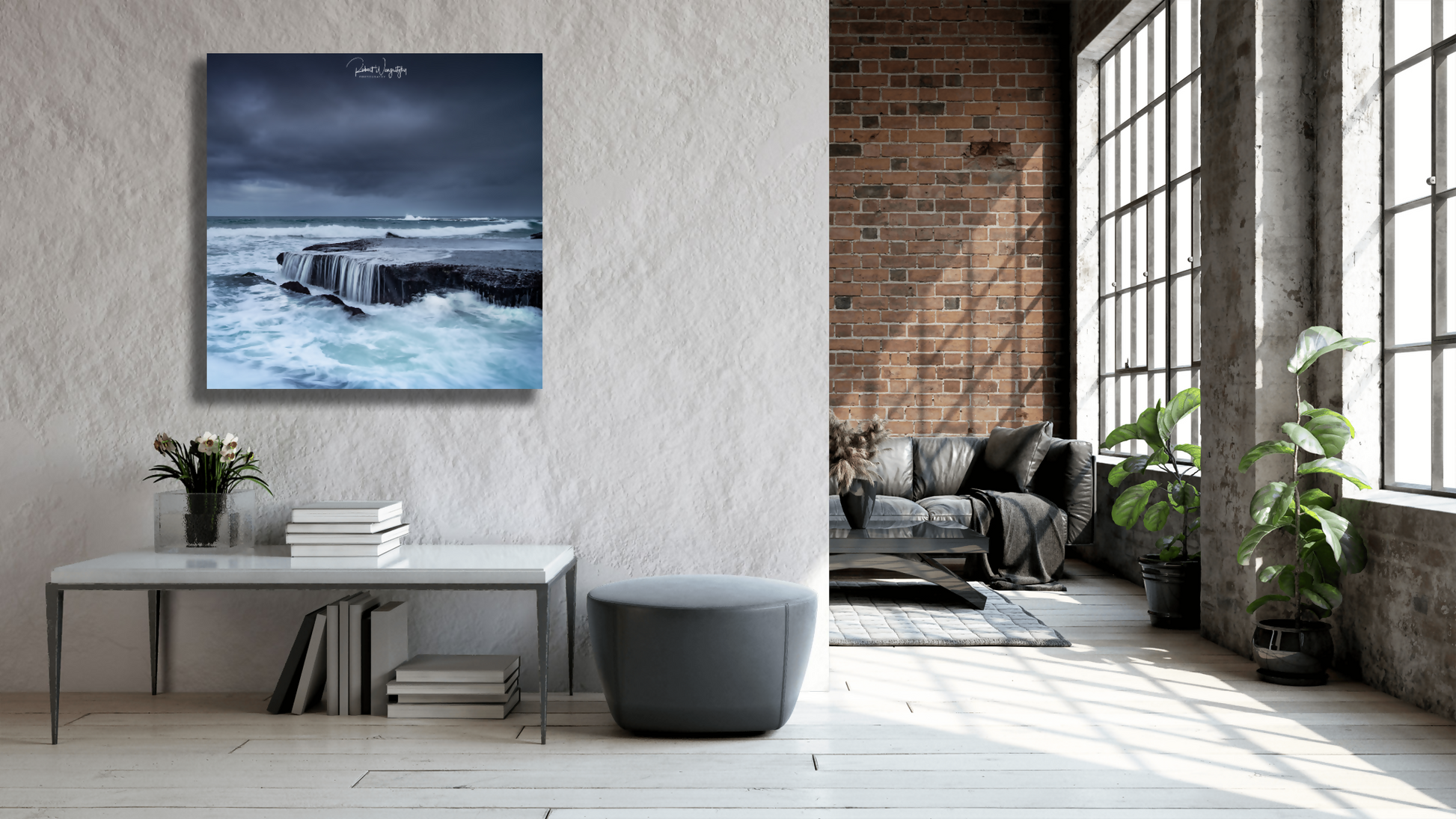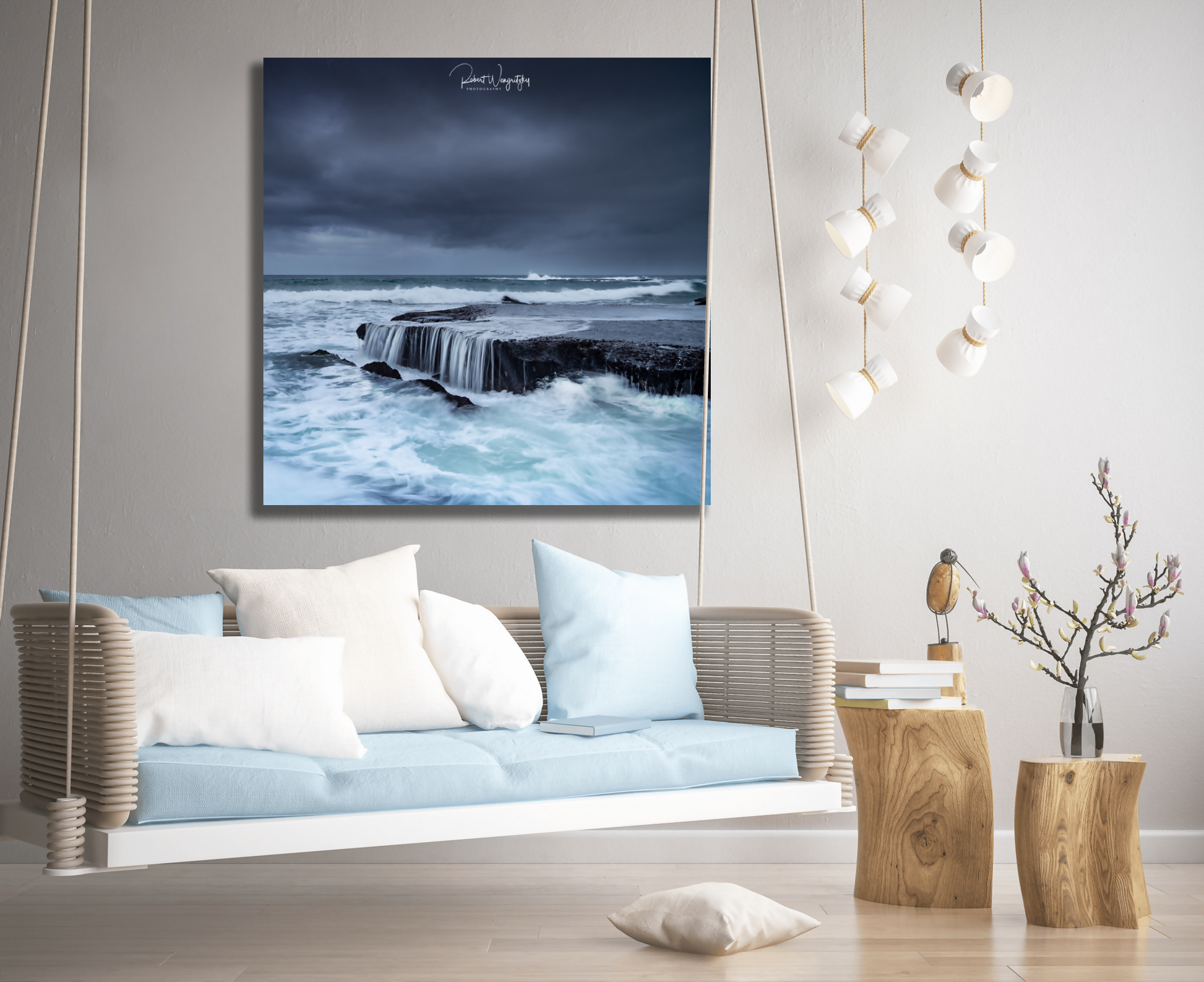 On the edge of the storm, the ocean rises and falls in restless rhythm. Waves spill across the rocky shelf like a temporary waterfall, each surge dissolving into foam. Dark clouds press overhead, amplifying the drama of sea and sky.
